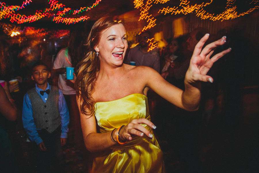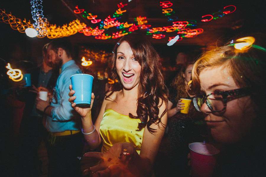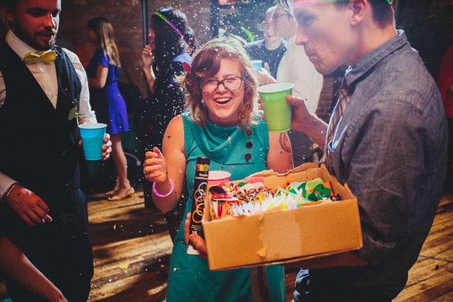 “The only wedding either of us had been to in our adult lives was in an abandoned parking lot and lasted 20 minutes”, explained Nick, “so we had no preconceptions of what should happen. Our wedding was about having fun. We had a Mountain Dew fountain, glow stick cutlery, vintage cartoon paper plates, funnel cakes made to order and a late-night hot dog bar!”