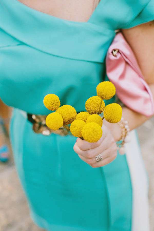 Mariangela opted for a short dress to which she added yellow accents. She wanted her look, and the day as a whole, to be fun, informal and colourful. “Two weeks before the wedding I went for my gown fitting”, she explained. “It was a long gown at that time, just like the original model, but then I decided to ask them to cut the hemline shorter. My mother and the shop assistants looked like they were going to faint! But I would repeat it again. It was totally the best choice for me and I loved my dress!”