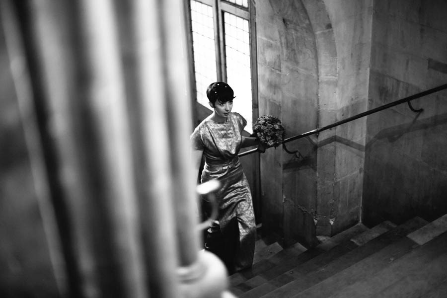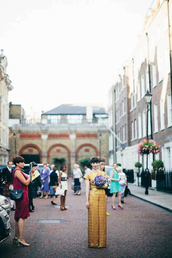 Anna Lee looked stunning in her gold gown by by Roland Mouret. Called ‘Wallis’ and inspired by Wallis Simpson, the opulent diamond-embossed design looked amazing on her. Clearly Anna Lee wasn’t going for a traditional bridal look. She wore Beatrix Ong shoes and instead of a veil or any jewellery, she had pearls glued down the nape of her neck. I just LOVE this idea. “I didn’t wear jewellery or a veil”, she explained, “but wanted pearls in my cropped hairstyle. So Angela, my hairdresser, had the idea to fix pearls down the back of my neck using super-strength wig glue! They held fast all, and were a real talking point.”