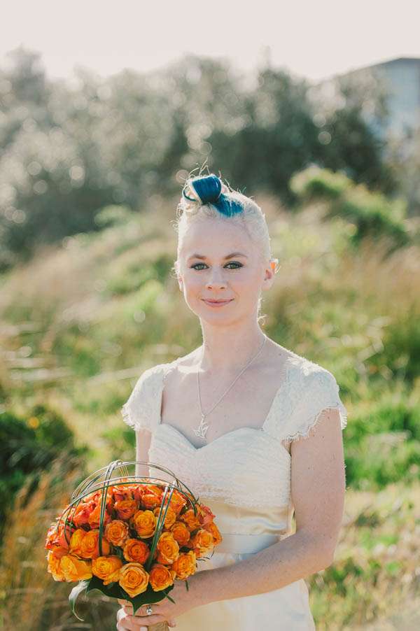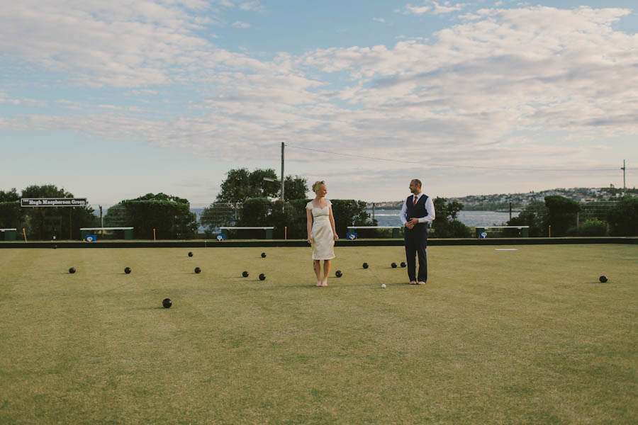 “Our ceremony was at Burrows Park Headland, Sydney”, explained Nat. “The ceremony spot was a beautiful cliff edge looking over the Pacific Ocean and located right next to the Bowling Club where we had the reception. We loved that the only way to get to it was via a very long, natural aisle sheltered on one side by trees, which we decorated with Chinese lanterns. For our reception we chose Clovelly Bowling Club. It was cheap as chips to hire, the drinks prices stuck in the 1980s, and the tacky bright blue carpet and a strange old picture of the Queen flanked by two Aussie flags above a stage which houses an ancient piano (which we tuned up and used!) were AWESOME! As soon as we walked in we looked at each other and said ‘Yes!’. Oh, and it had 180 degree ocean views!”