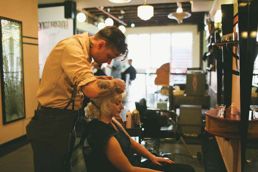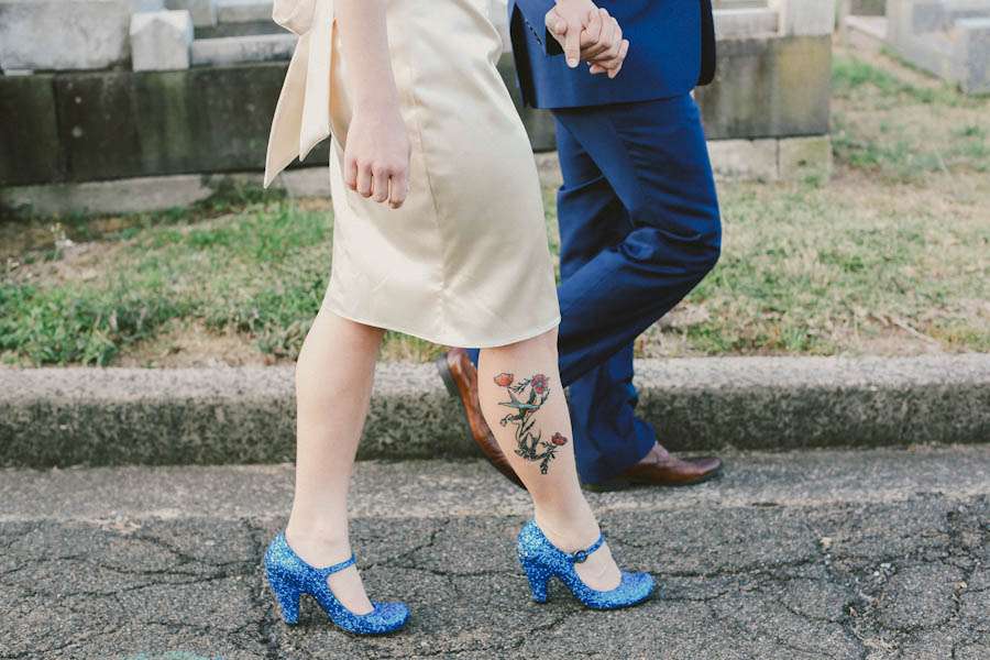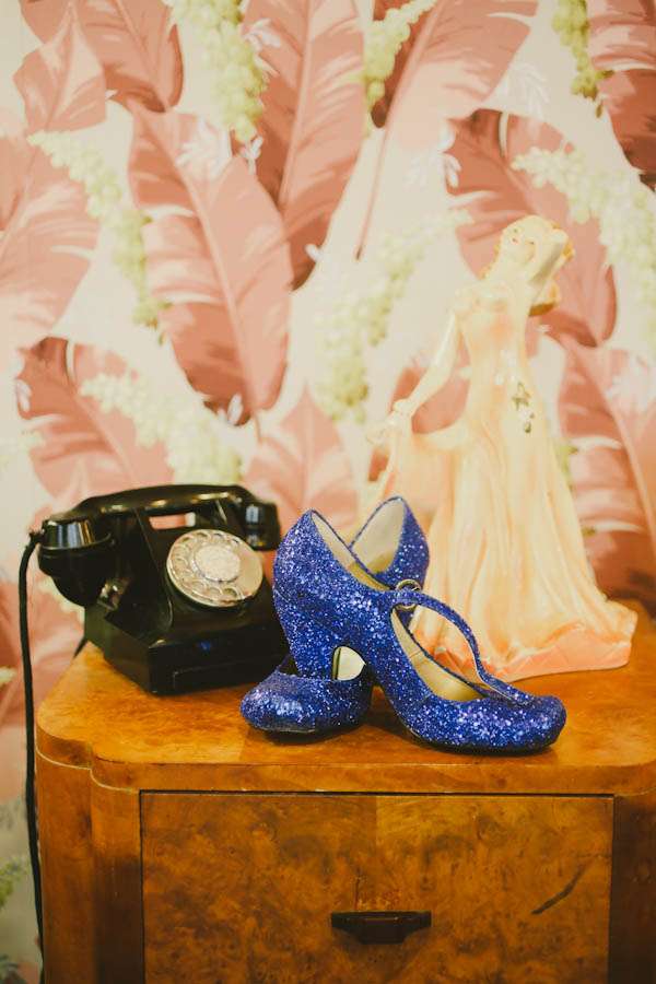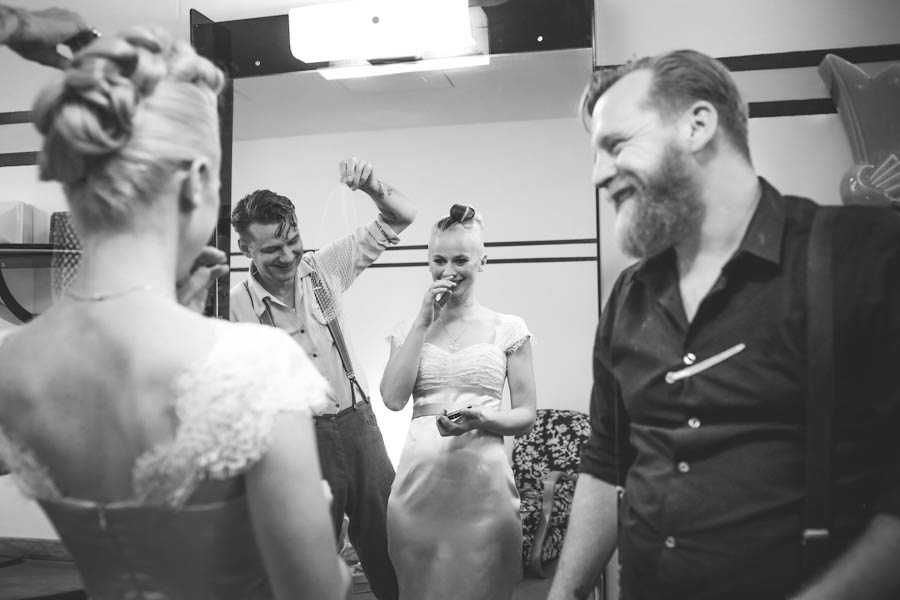Nat’s retro look was achieved by working with a dress designer, by rocking some incredible blue glitter shoes from Red or Dead and with a hair do, created by Sterling Hairdressing Parlour & Barber Shop, that dreams are made of! “After some horrifying outings to bridal stores I ended up working with a local woman named Maria Ling Qing Huang to create the dress I envisioned”, she explained. “I ditched all ideas of a traditional look and took inspiration instead from Wheels & Dollbaby’s range of short, sleek & sexy dresses. Our wedding was in Spring, so I could afford to go short. Maria was amazing! She encouraged me to add a little lace around the sleeves and bust, which initially I was nervous about, but when I saw the finished dress I was surprised at how it added a really nice vintage feel. I ended up with a perfect combo of modern and vintage.”