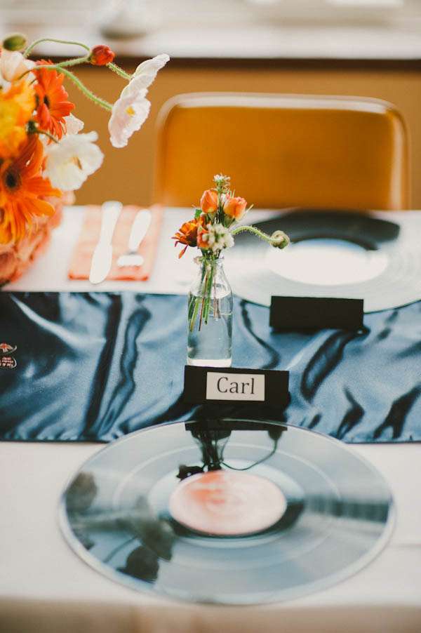 “Swallows featured as a bit of a theme – an oldie but a goodie – they mate for life, they flew around our head when Sam proposed and they are the basis of the tattoo on my leg. We spray painted our flower buckets with some swallows and anchors along with our initials and the date of the wedding. It was a simple stencilling job, but we felt it took away the tackiness of the flower bucket and added a personal touch. They were quickly swiped up by mums, nans and friends at the end of the night! We got customised guitar picks made too which just had our names and the wedding date and of course a swallow. We scattered them over the tables in between the records.”