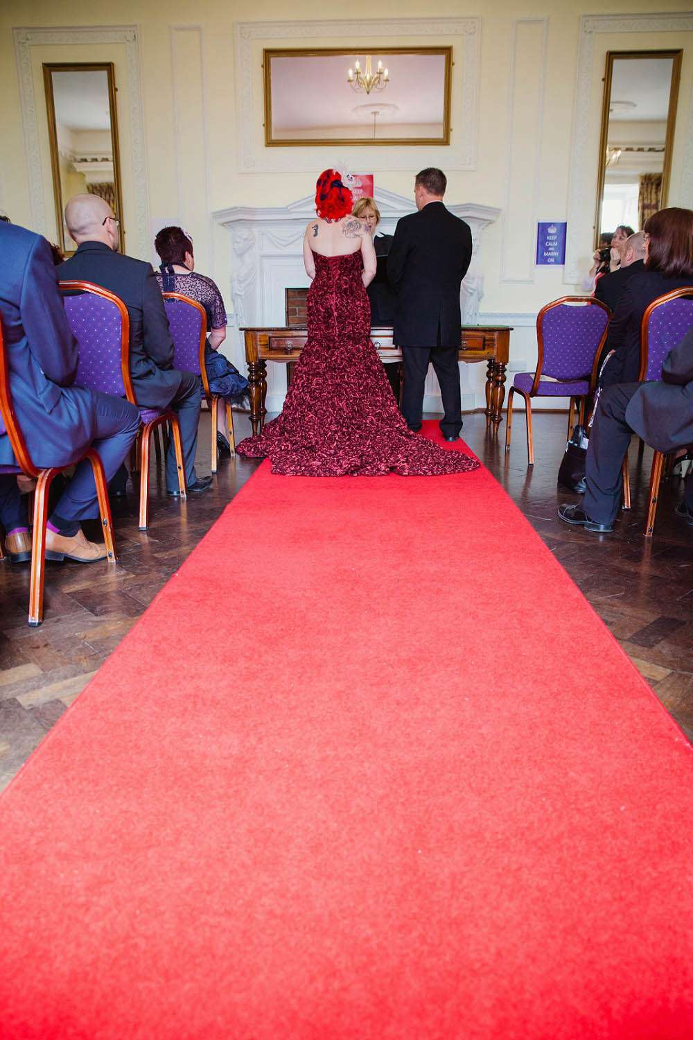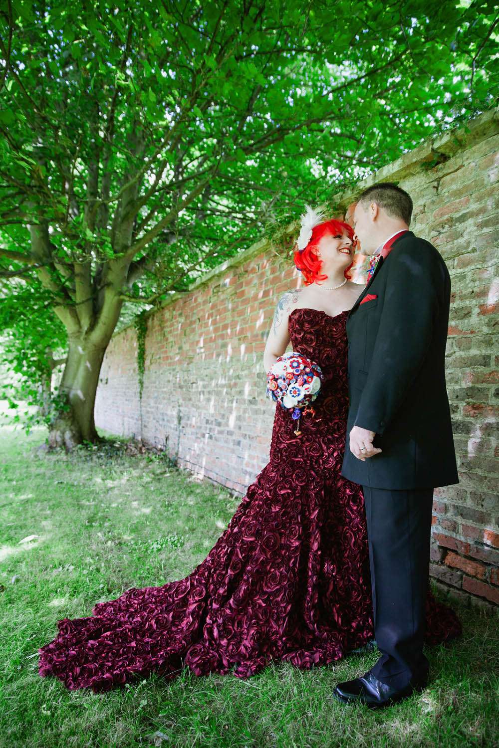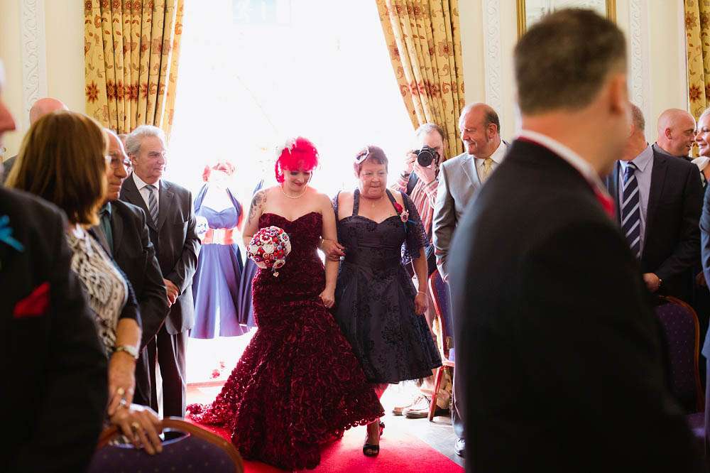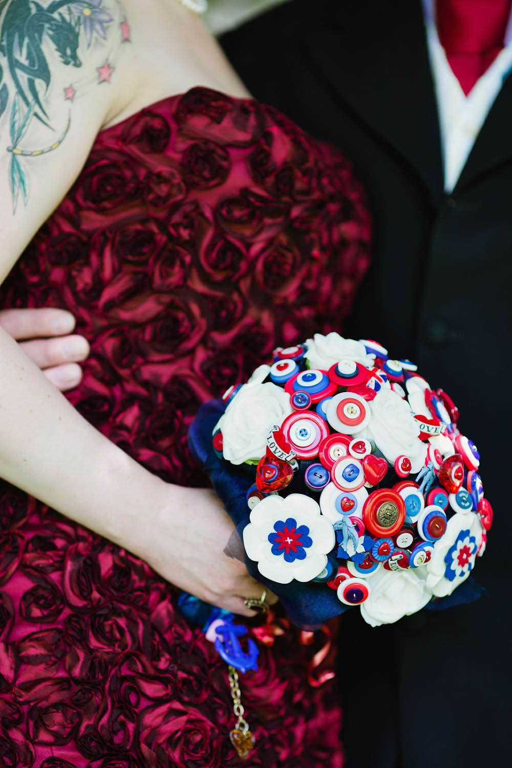 Lisa even dyed her hair red for the wedding, and despite some last minute panic that it was ‘too pink’ (cue a rush re-dye job on the morning of!) it looked amazing. She wore a stunning red wedding dress by Veromia Couture, bought from Curvy Bridal in Boroughbridge, Iron Fist Union Jack shoes and a headpiece from Voodoo it Yourself. She made the button bouquets for herself and her bridesmaids from an idea she saw on Rock n Roll Bride.