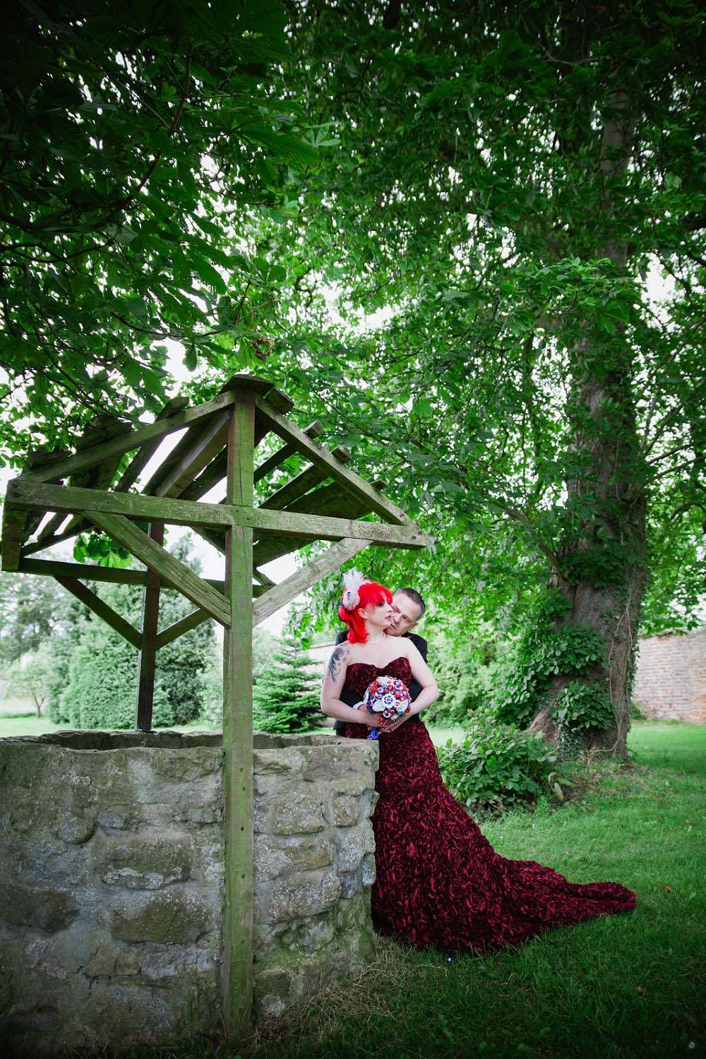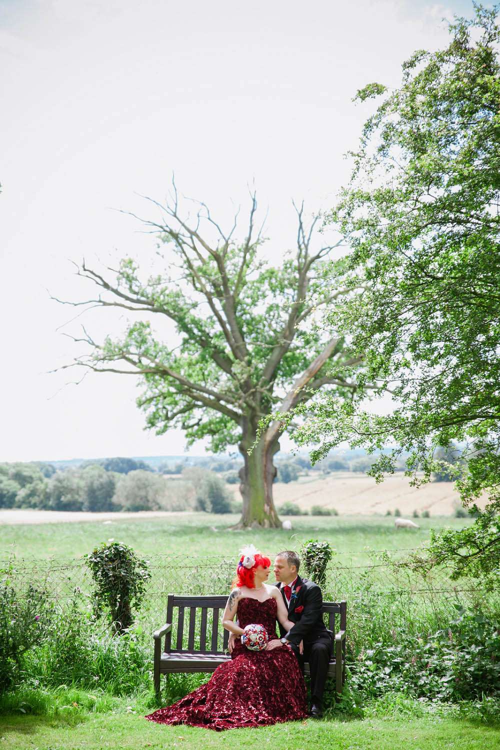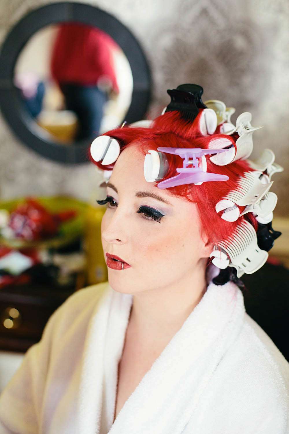 Lisa even dyed her hair red for the wedding, and despite some last minute panic that it was ‘too pink’ (cue a rush re-dye job on the morning of!) it looked amazing. She wore a stunning red wedding dress by Veromia Couture, bought from Curvy Bridal in Boroughbridge, Iron Fist Union Jack shoes and a headpiece from Voodoo it Yourself. She made the button bouquets for herself and her bridesmaids from an idea she saw on Rock n Roll Bride.