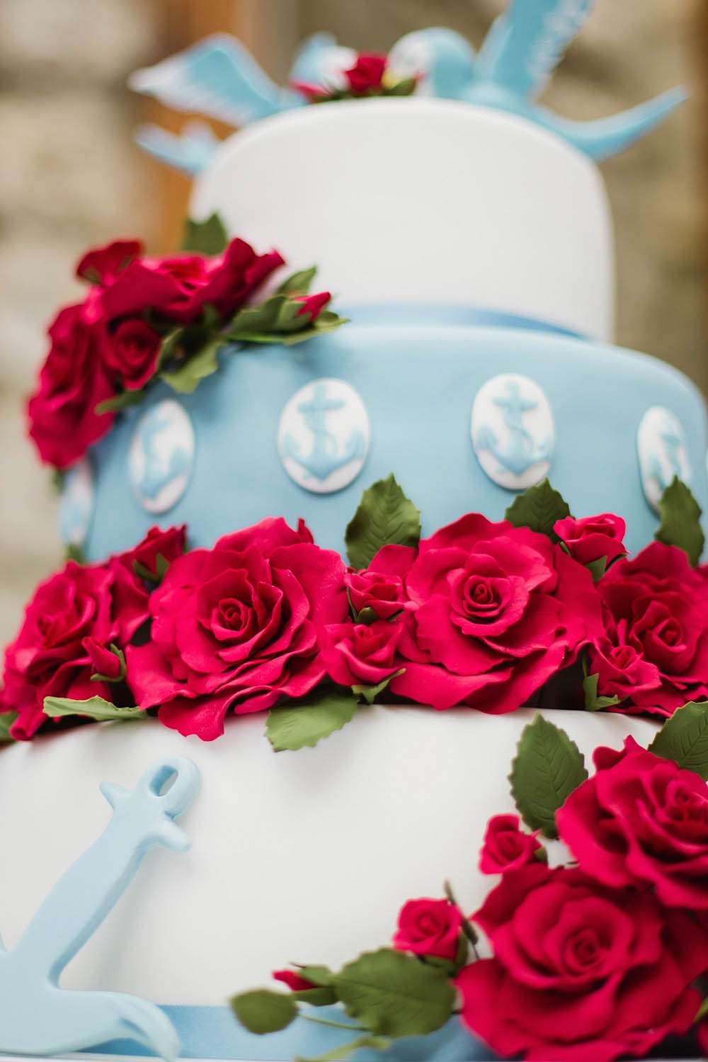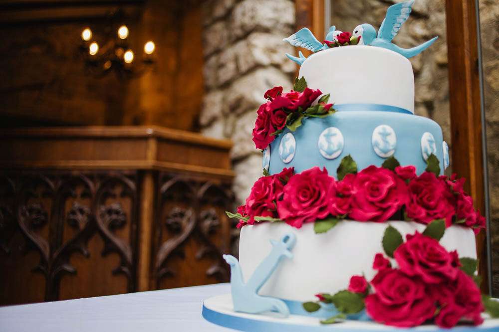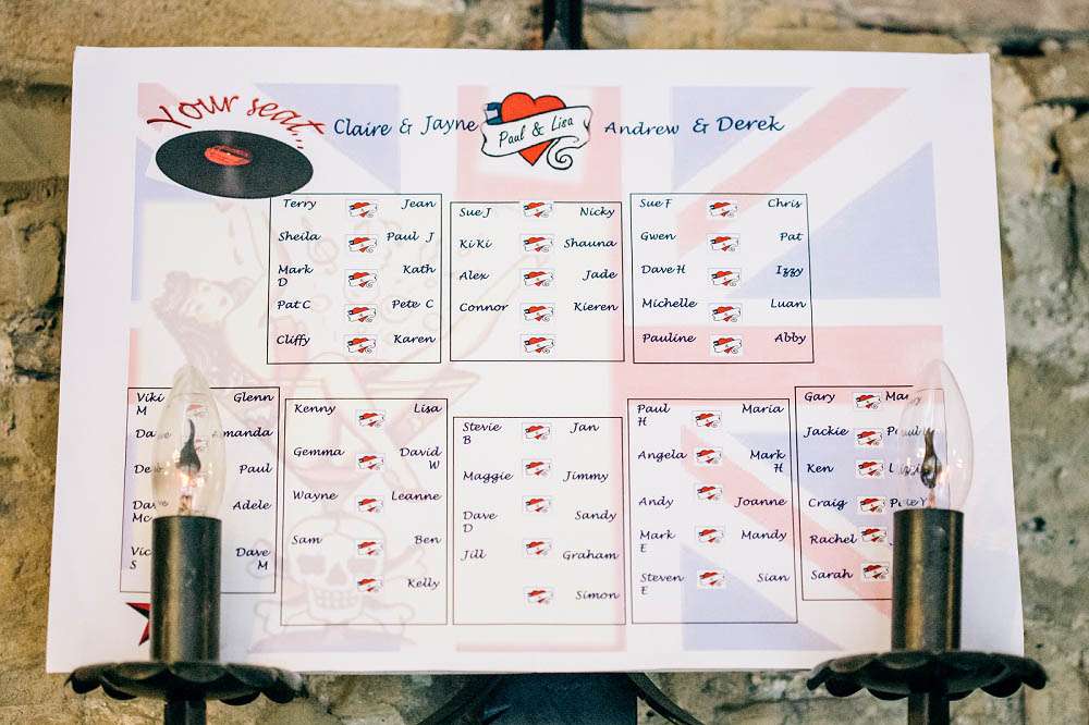 “Being the Jubilee year as well as the Olympics, a red, white & blue themed wedding seemed fitting”, began newlywed Lisa who married Paul this Summer. “I sat with my bridesmaids and mum the night before the wedding watching the opening ceremony with great pride. The bright colour options coupled with my love of rockabilly styling and 1940s glamour added such vibrancy and fun to the day. Paul and I also both love tattoos so we wanted to bring this into our day. The swallows on the wedding cake, invitations, table decorations and gifts were all tied together with tattoo images.”