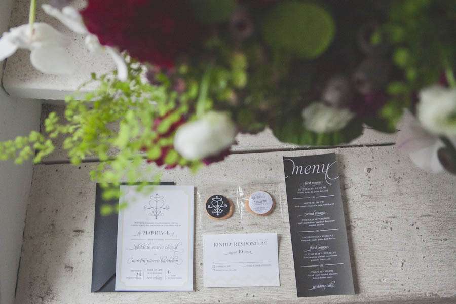 “PS Creative did the invitation and menu cards. The symbol on the invitation and favors was adorned with an ancient voodoo symbol for love, and the wording is all very classic New Orleans. Mrs Vintage supplied the vintage pieces, including the romantic brass candlesticks, gold nesting tables and a sage colored chair”