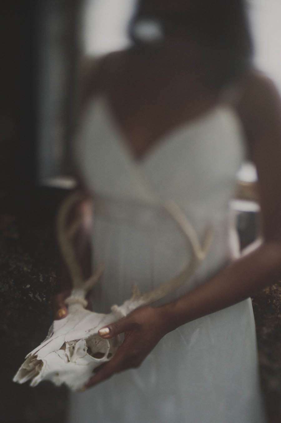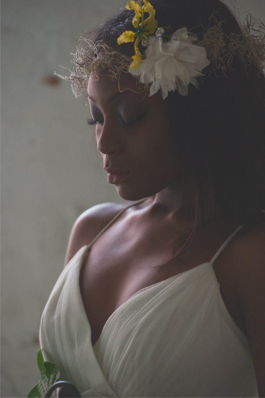 “I was travelling to New Orleans for a little vacation and on the way I dreamt about this shoot”, she explained. “Alongside local florist, Kim Starr Wise, we came up with this concept – Voodoo Swamp. We wanted something moody and bring in the elements of the swamp. The floral was hand picked with orchids, magnolias, fiddle head ferns, and crocodile leaves and I really wanted Spanish moss.”