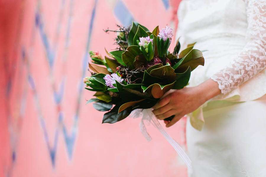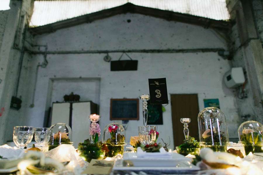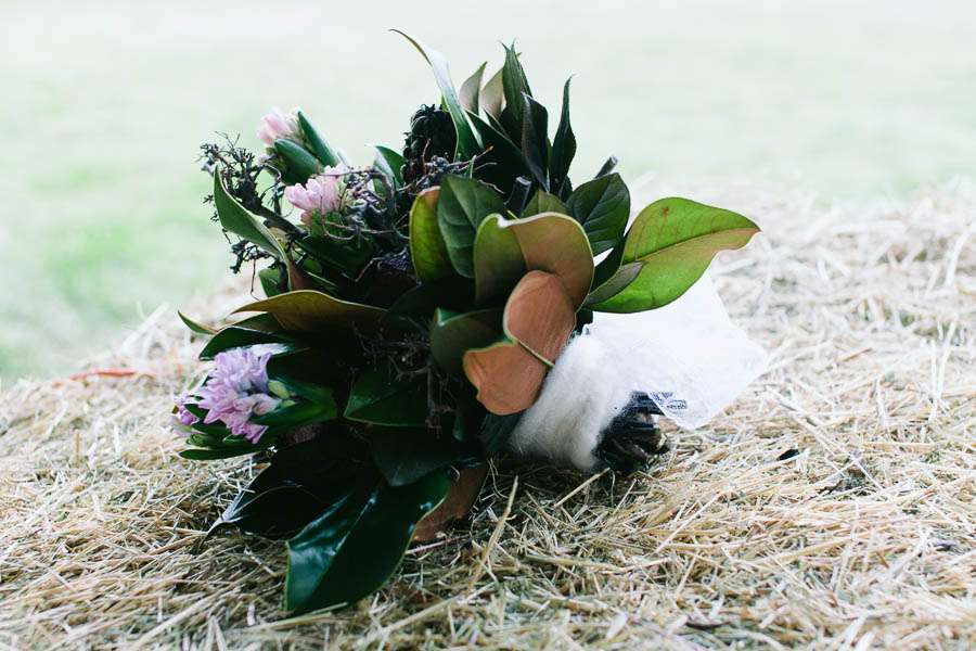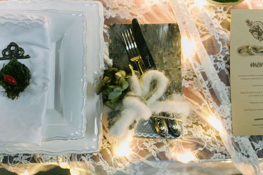 “We wanted to create a vintage dreamy and natural inspired shoot, surrounded by the utterly magical atmosphere of the horse stable”, she continued. “Davide, our florist, used a lot of lace and wool details together with different kind of flower bulbs. For the bouquet he used Magnolia leaves. For the stationery Ara of Caratterino printed the invitations on real wood with rope details.”