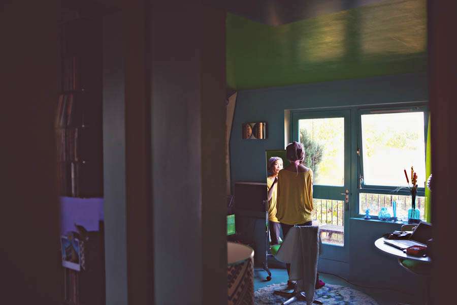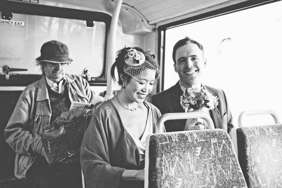 “I bought my dress from Annie’s Vintage in London – it was a gorgeous long evening dress in a heavy cream silk, but unfortunately was a tiny bit too short and slightly moth eaten in places. I happily cut it in two and sewed it back together again, creating a knee length dress and making sleeves from the excess fabric. I made my own fascinator & hair pins after months of fruitless searching. I’ve never dabbled in millinery but I thought it looked OK! The hair accessories worked well with the textured & dishevelled hairstyle that Rose Wallace created. I also got ready at her amazingly retro flat and she was brilliant at keeping my pre-wedding nerves at bay.”