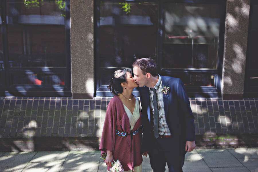 “We loved having such an intimate wedding, where we spent a decent amount of time talking to all our guests”, Feng concluded. “Transforming our living room into a reception venue was a fun challenge. Seeing it all come together on the day was very exciting, and knowing that guests were enjoying our wedding made us happy. We enjoyed having our portraits taken in local places, such as the grocery store, hardware store, and outside the artist studios where I work. It was a bit strange at first, especially having to kiss & cuddle in public, but we got used to it!”