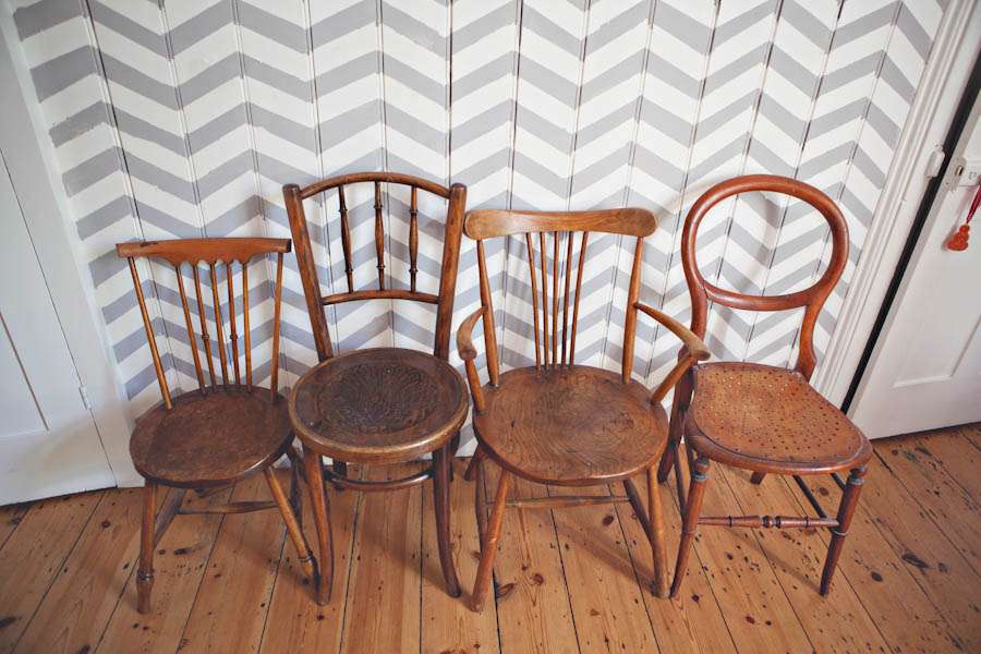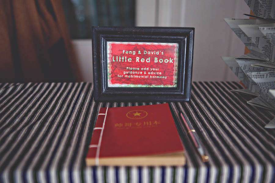“To decorate the house we scoured the markets, car boot sales and charity shops, and raided my parent’s hoard of strange wooden objects”, Feng continued. “I made paper pompoms out of retro dress making patterns and flowers from David’s ‘Physics World’ Magazines – combining the two things that we both do. One of our best finds was a 50p Readers Digest atlas on which we printed all of our invites & turned into paper flowers. Although David didn’t take part in the DIY, he let me cut up his physics magazines and was a constant source of support and sage advice. He came back one day surprised that I’d painted chevrons all over the dining room wall! I was addicted to reading wedding blogs (especially Rock n Roll Bride) as a source of inspiration.”
