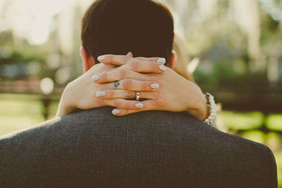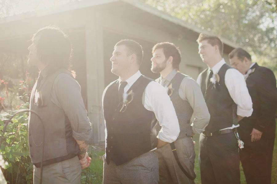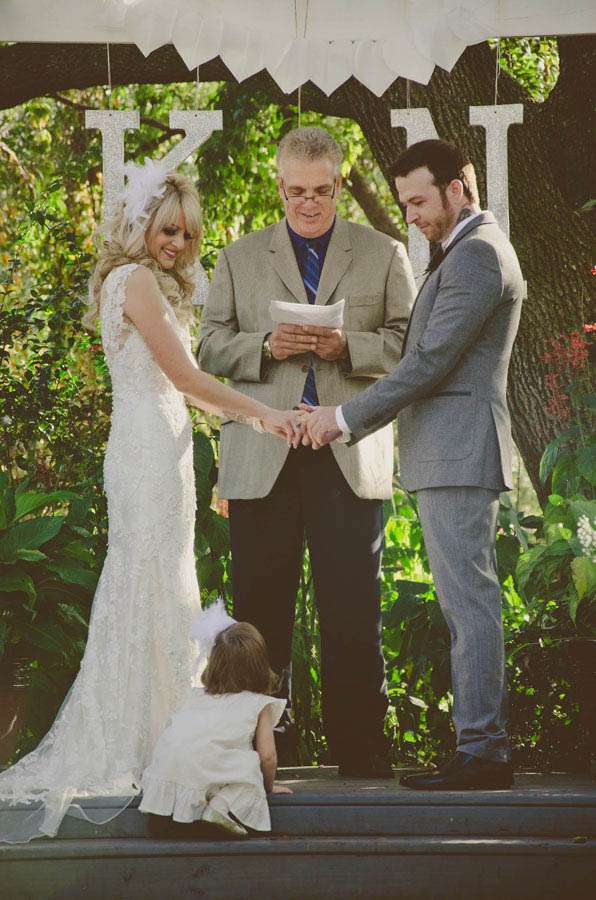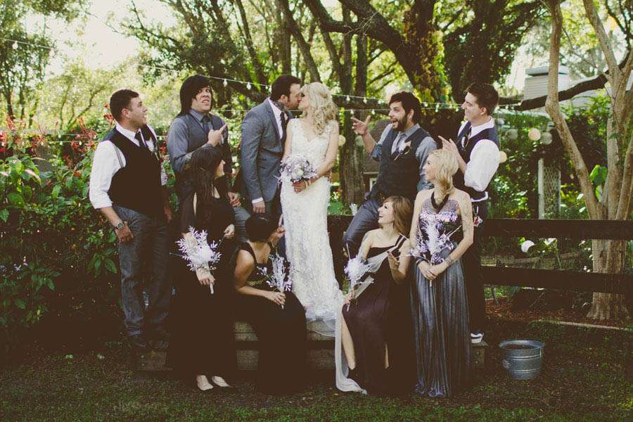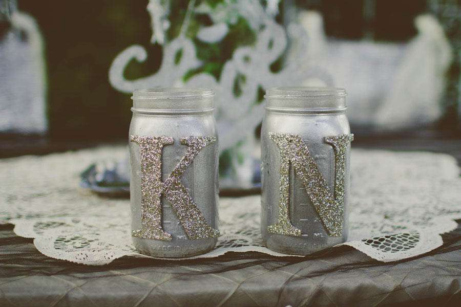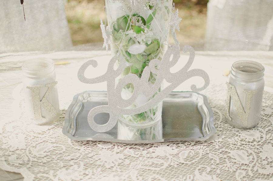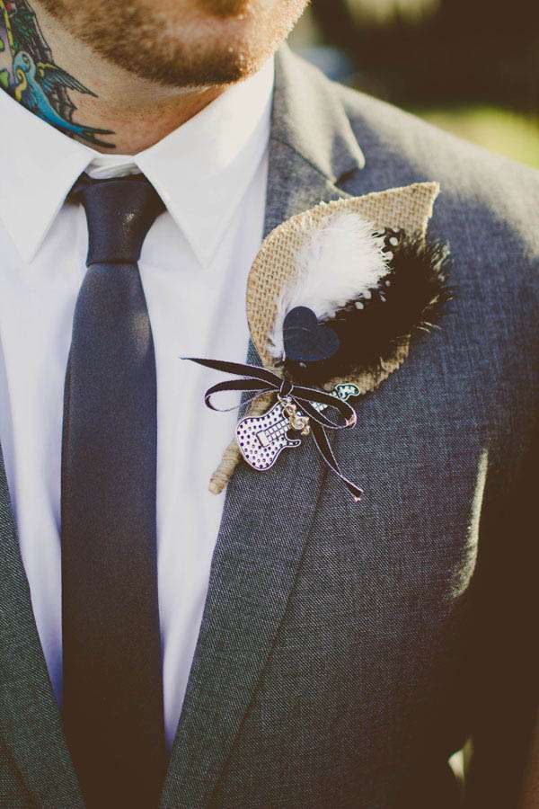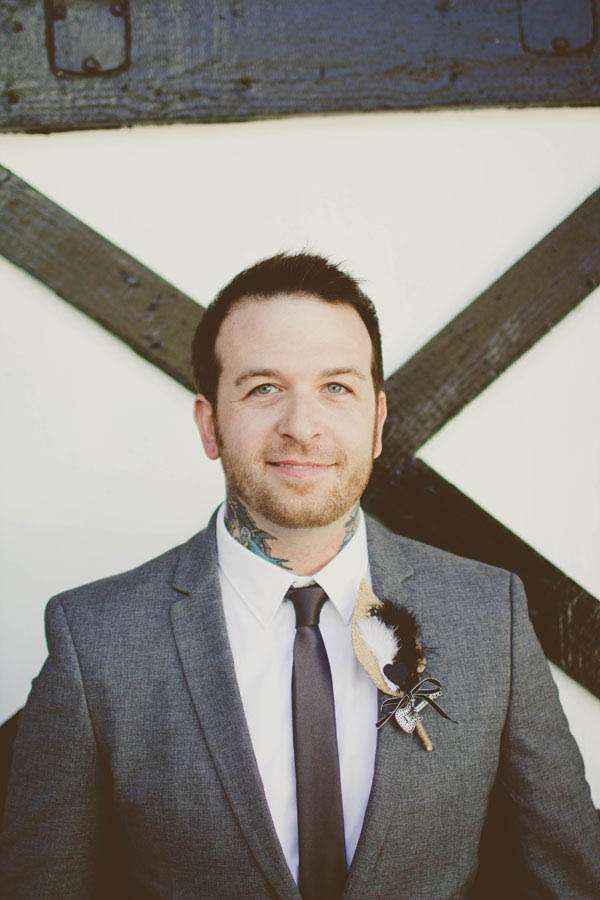 Katie wore an elegant wedding dress from Allure Bridal. She went barefoot for the ceremony but bought some sparkly flats for walking around in. “My favourite thing about our wedding – besides my DRESS! – was the fact that my husband, mom and I put so much blood, sweat and tears (literally) into it all. We thrifted most of the items and my mom made my bouquet, the boutonnieres and the girls ‘flowers’ herself. The boutonnieres were made for each groomsmen with charms that matched their interests, so they were completely customized for each man.”