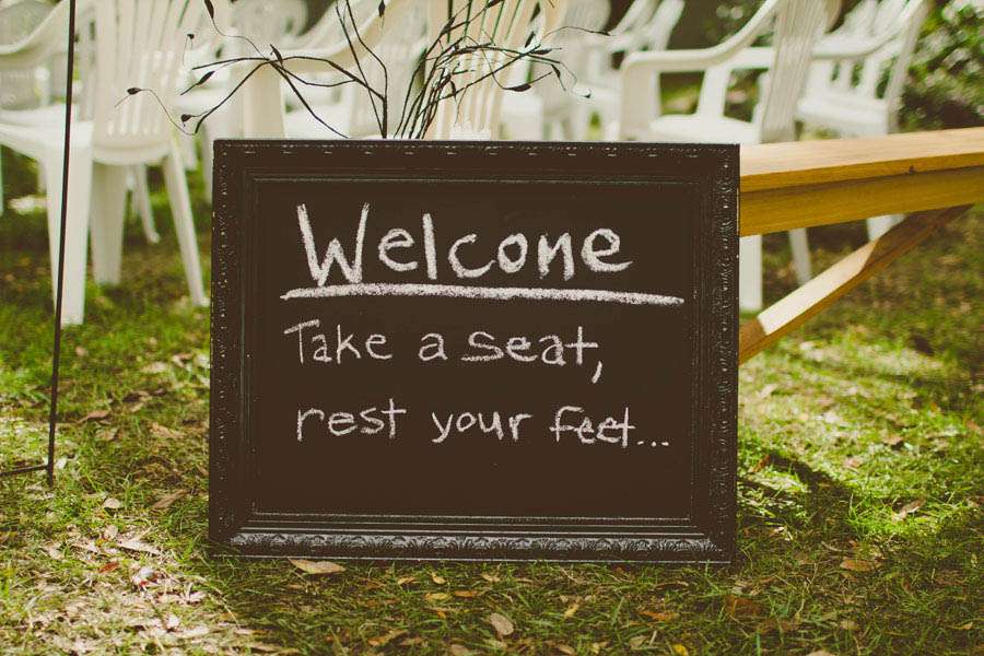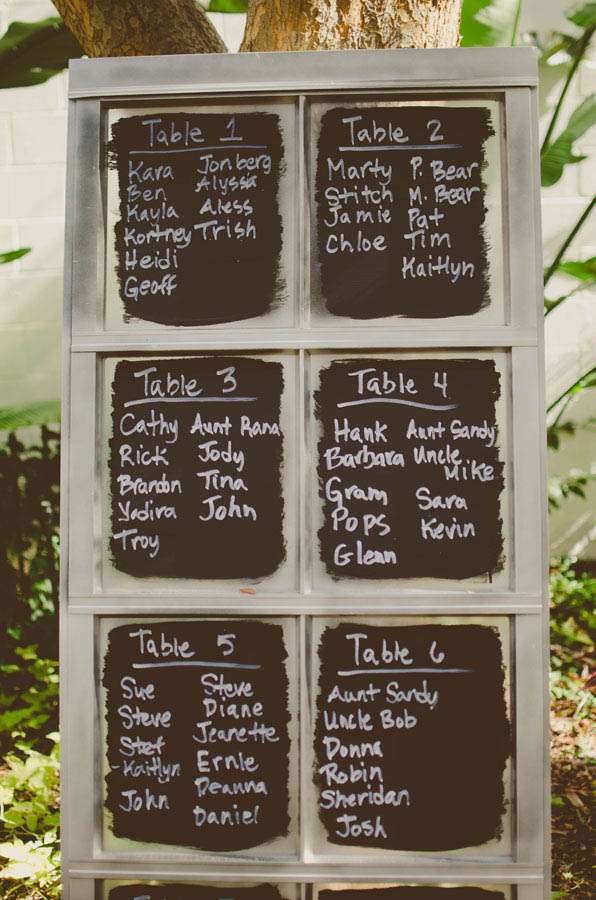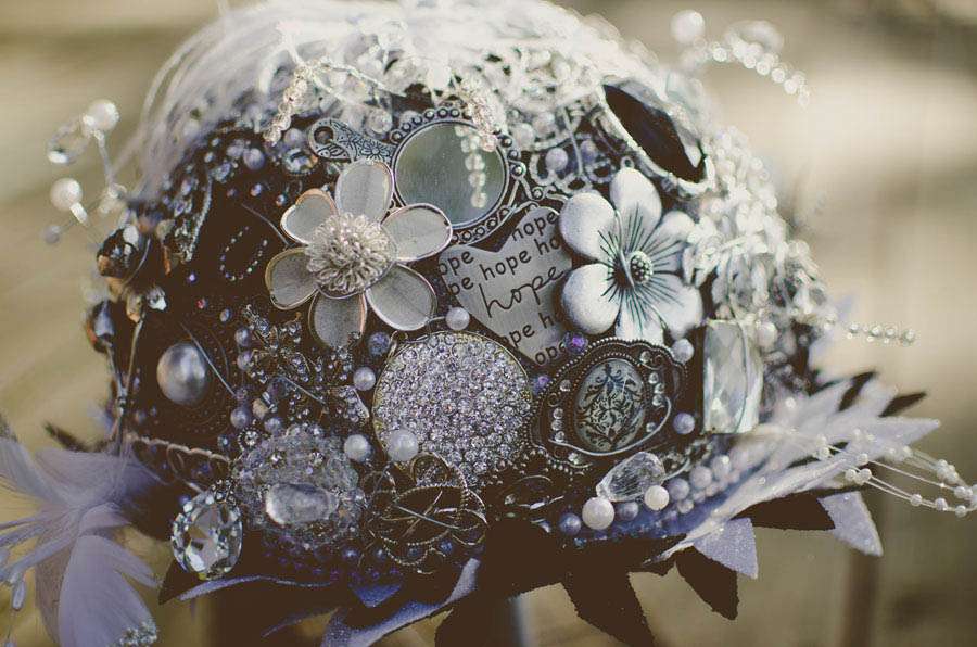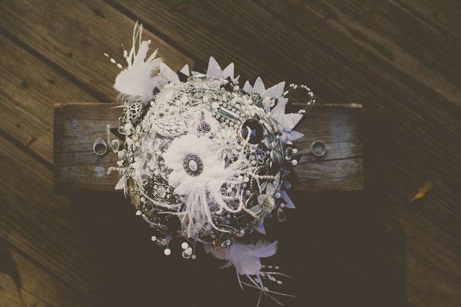 “The seating chart was made of an old window pane that we found at a junkyard and painted with chalkboard paint (which was super easy to do). My vintage brooch bouquet was a lot of work. We thrifted most of the brooches and used a Styrofoam ball to wire them all in. It took A LOT of brooches though so if you’re thinking of making one start looking for them right away!”