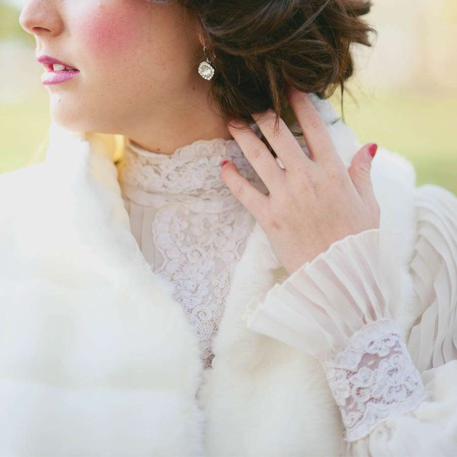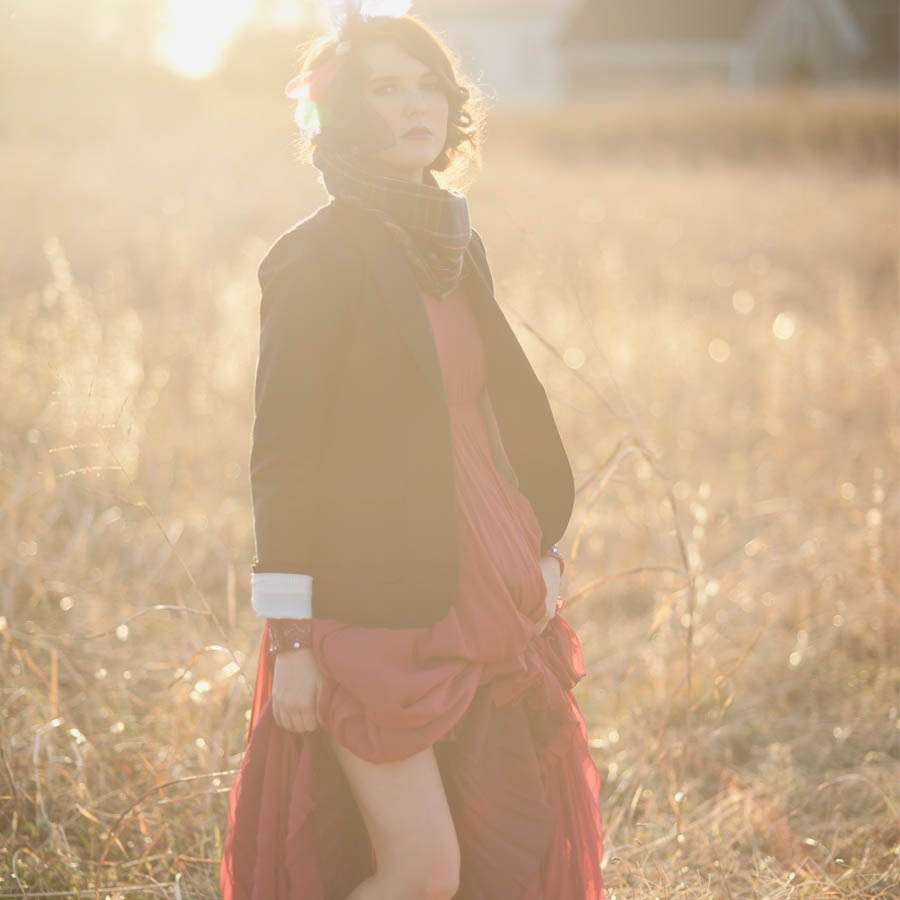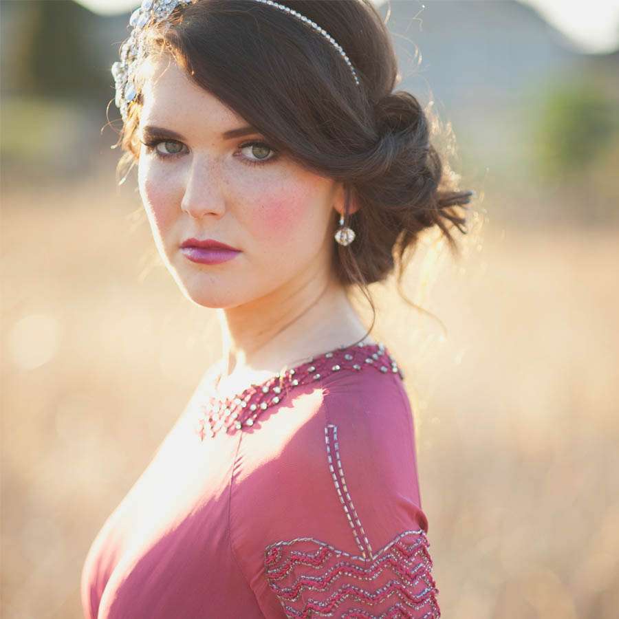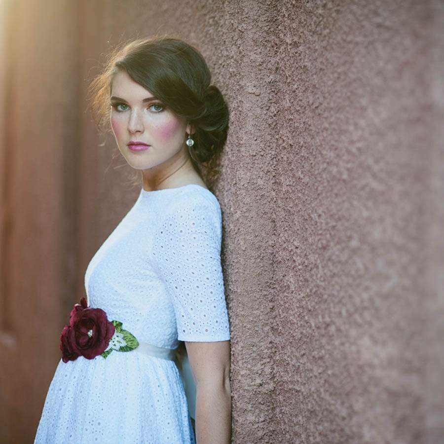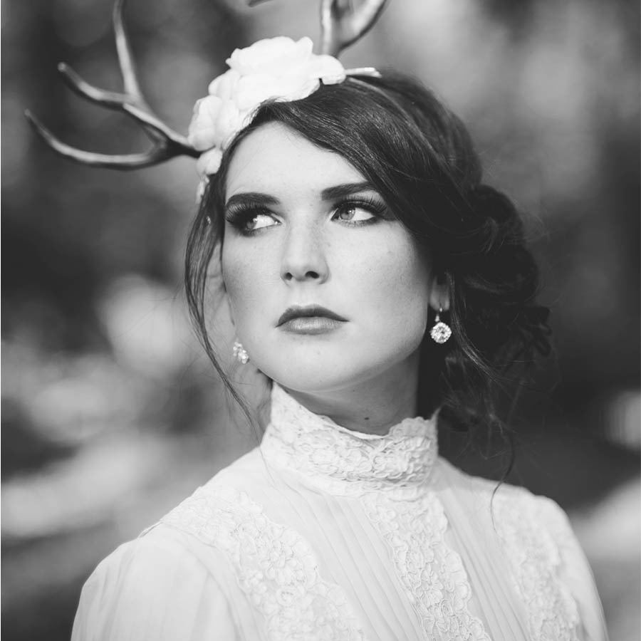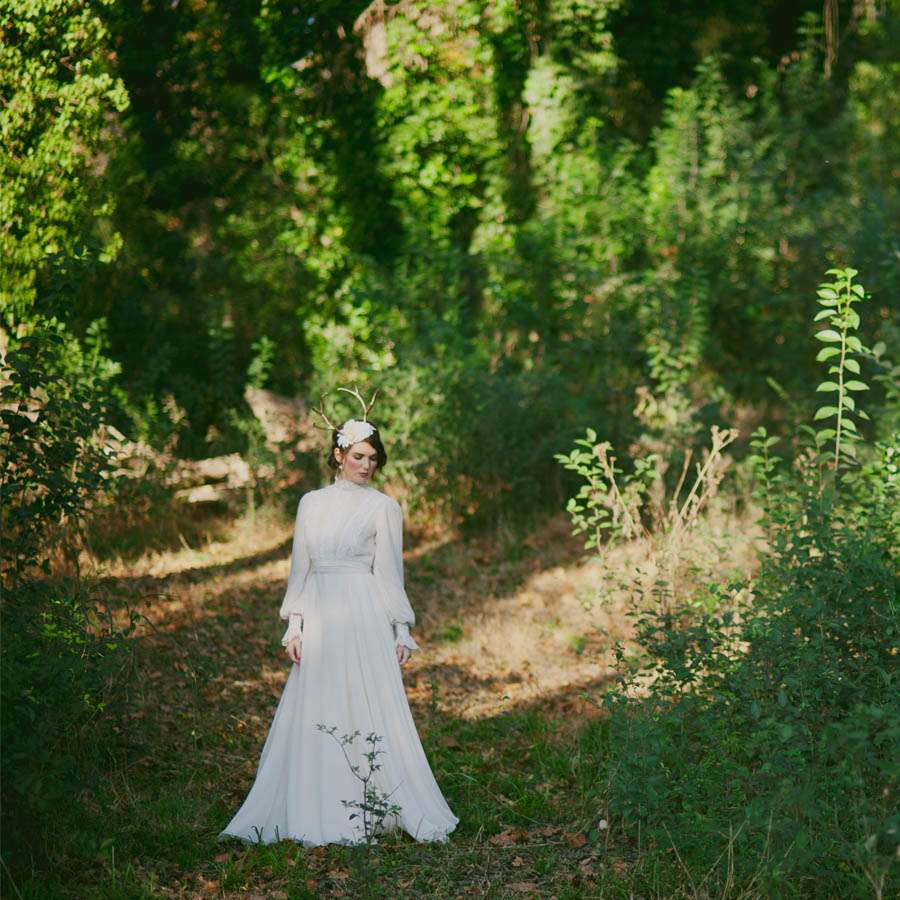 “My background is in accessory design, so creating the perfect finishing touch for a look is really my speciality”, she continued. “The antler and silk flower mini hat was our show piece for the bridal look and I absolutely adore the feel we achieved in these photos. It’s as if we stumbled upon a gorgeous creature in the forest. I hoped for a whimsical and fanciful feel and Laura, our photographer, more than delivered this in the photos! For the make up we kept it classic and sweet with rosy cheeks and tons of lashes.”