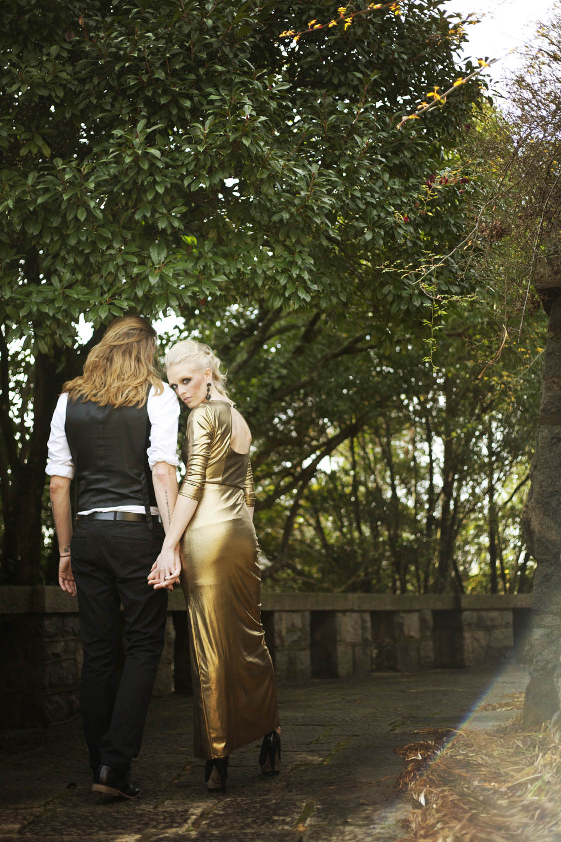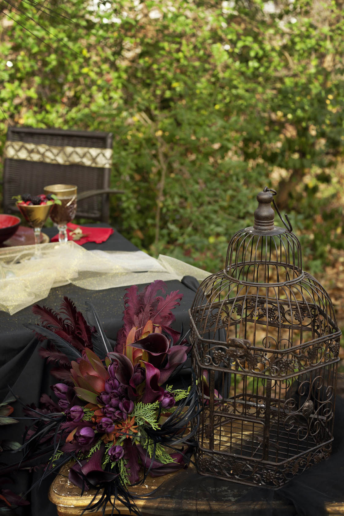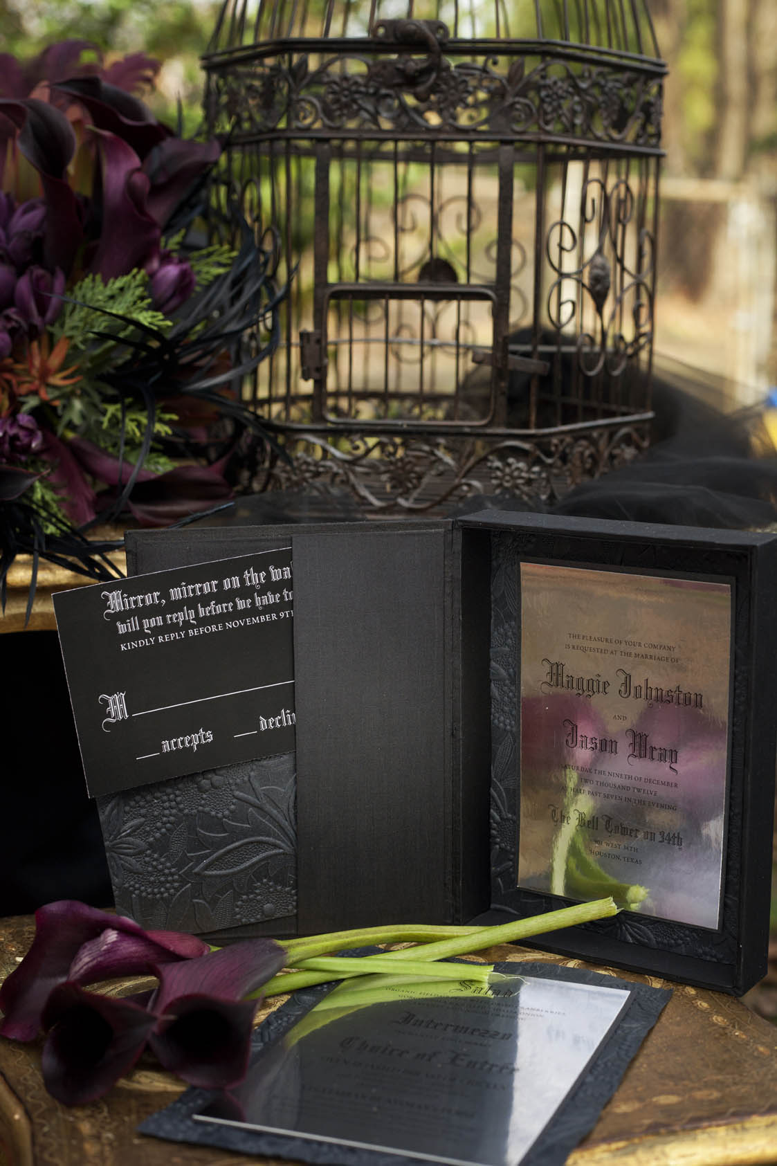 “I drew a lot of inspiration from strong images from the movie, as you will see in the floral design that looks like the queen’s crown. We really wanted to queen to be powerful and bold, and with the choice of both a gold and black dress I think it shows a new twist in the wedding industry with brides being daring enough to go outside the box. Another sweet little touch was Kelly’s little black bunny who happily modelled for us. The hair and make up really blew my mind. Ashlyn and I experimented until we found the perfect combination of black and gold eye shadow for a really couture look and Emily’s faux-hawk really adds to her dramatic look. Even the invitations are too good to be true, Tifany at Gourmet Invitations made them out of a mirror-like surface!”