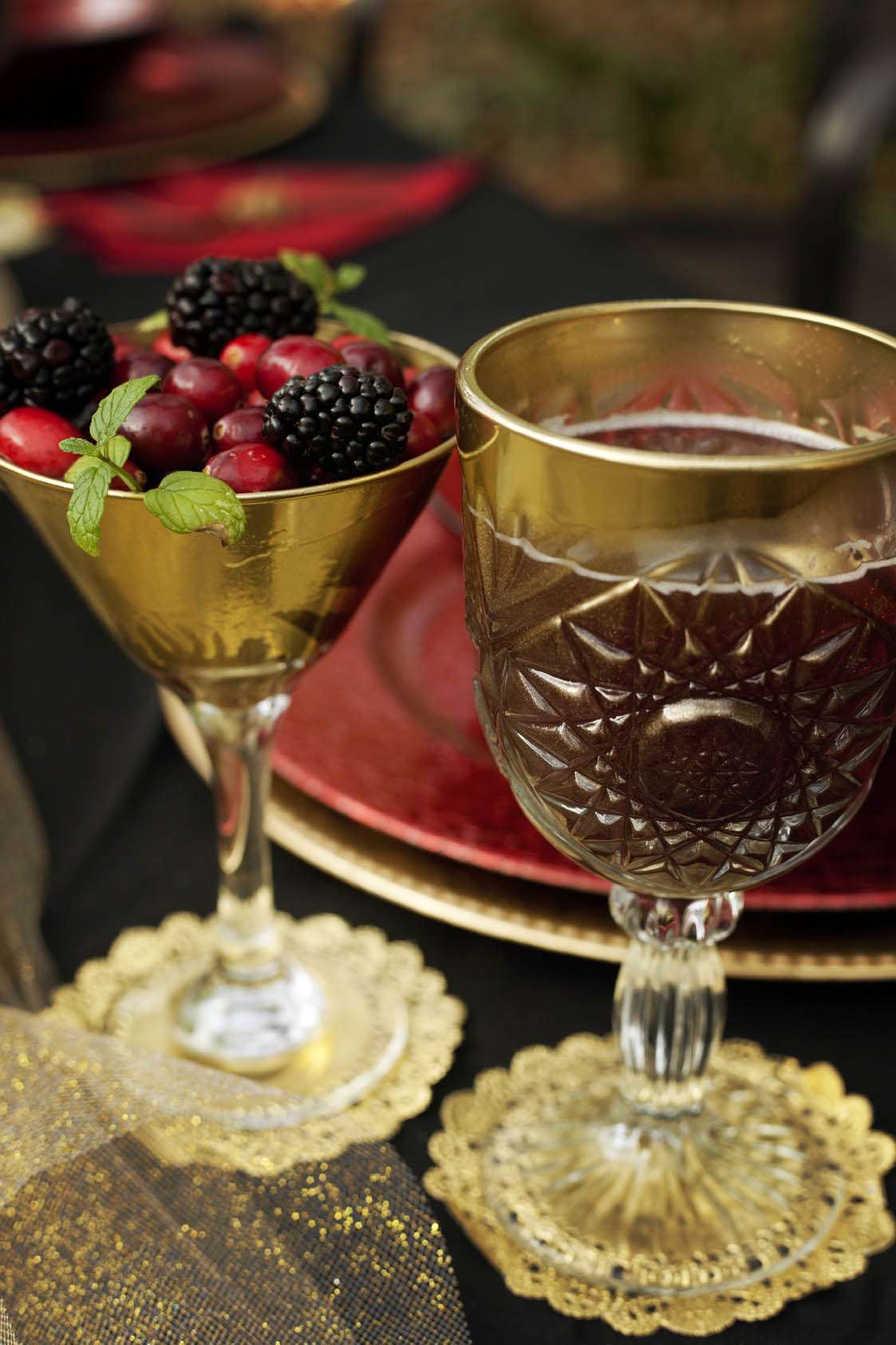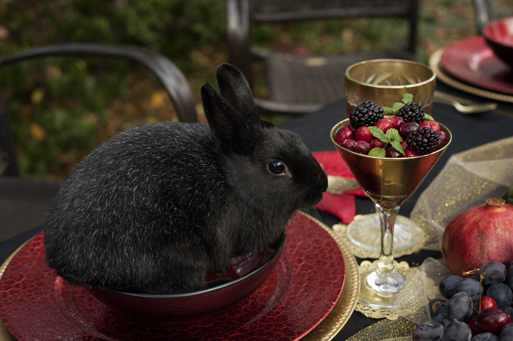 “The queen’s crown was designed specifically for this project by Emily Zynch of WhichGoose and I let her and all the other vendors develop their own ideas and have creative freedom with what they wanted. I just wanted it to be influenced by black and gold, bold textures and the romantic darkness of the film. Our stylist Kelly sewed the entire black gown herself! Thank goodness for tulle. Kelly and I crafted like crazy for weeks, even while I was abroad in England for other shoots. We spray painted goblets and martini glasses gold and stuffed them with wine and berries. We didn’t use a single apple in the whole shoo t- I wanted to stray away from that obvious motif and we used pomegranates instead. I feel like they are a fruit so deeply entrenched in mystery that they were far more appropriate to have scattered around the table along with artichokes and grapes.”