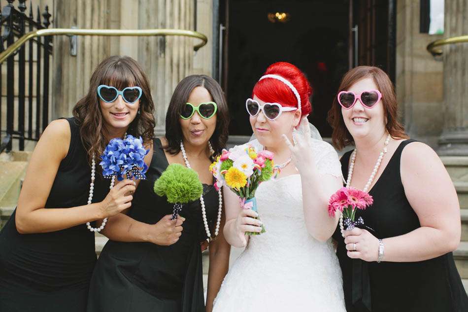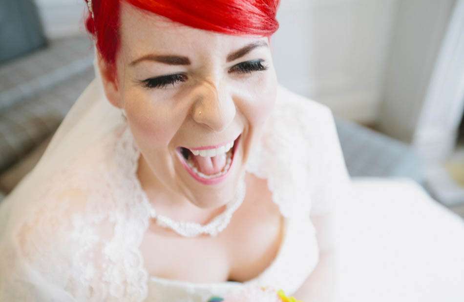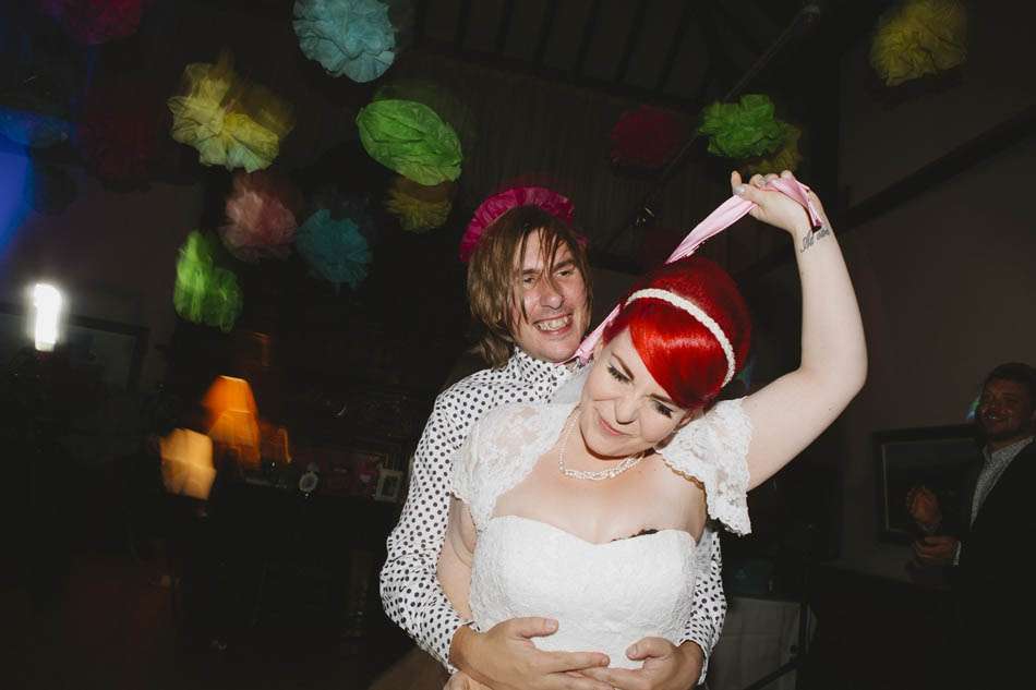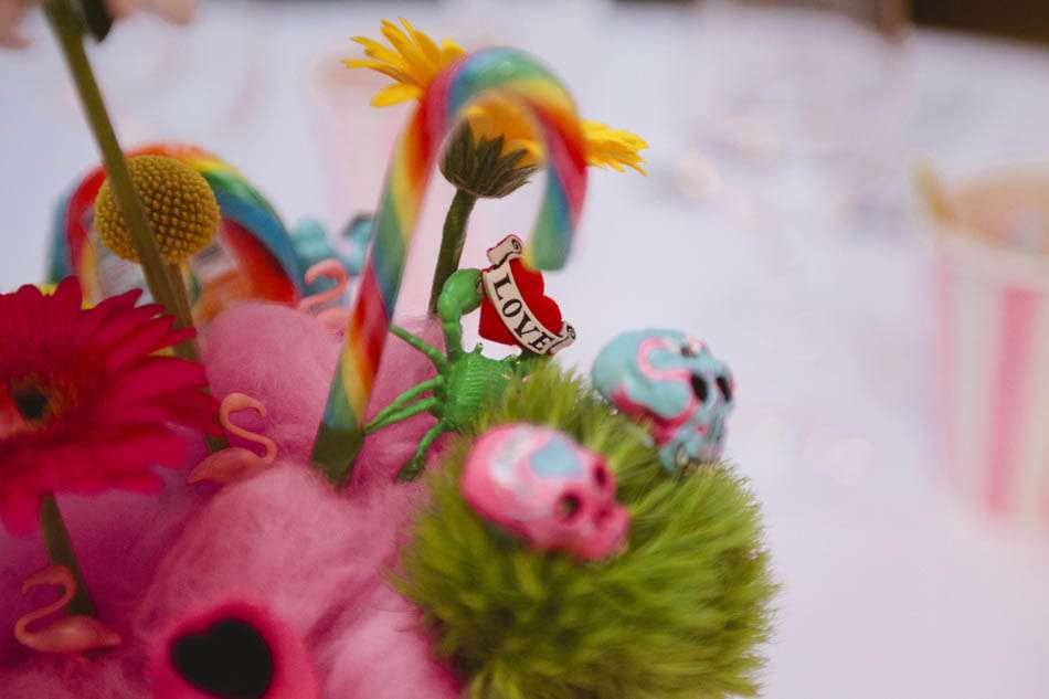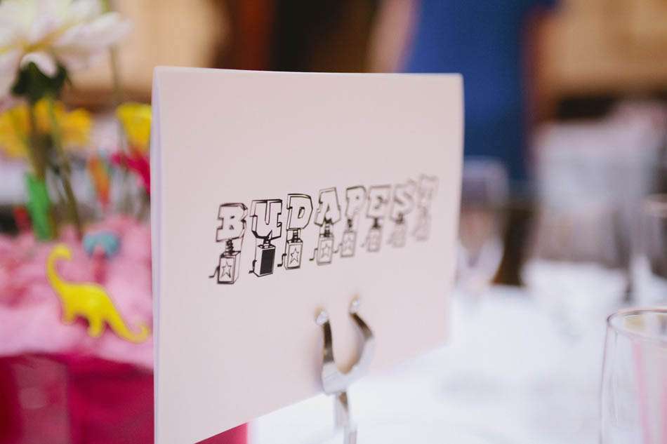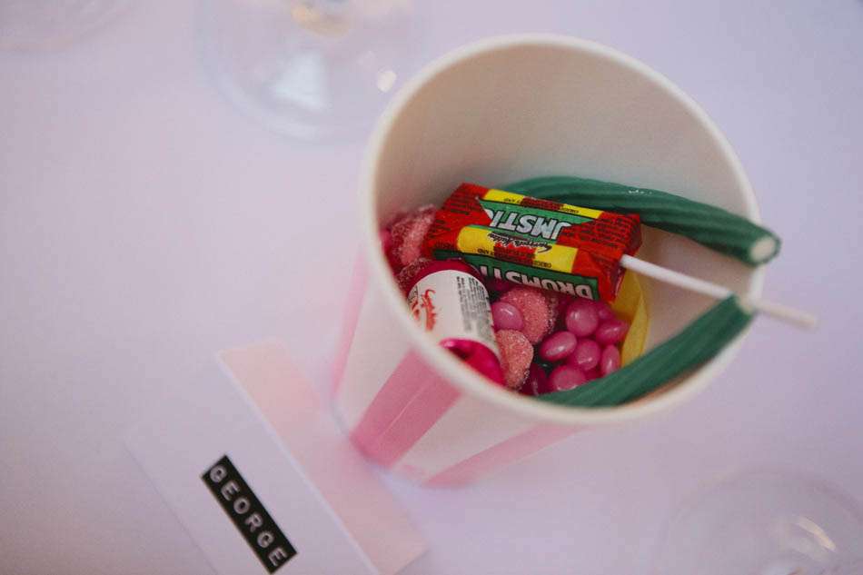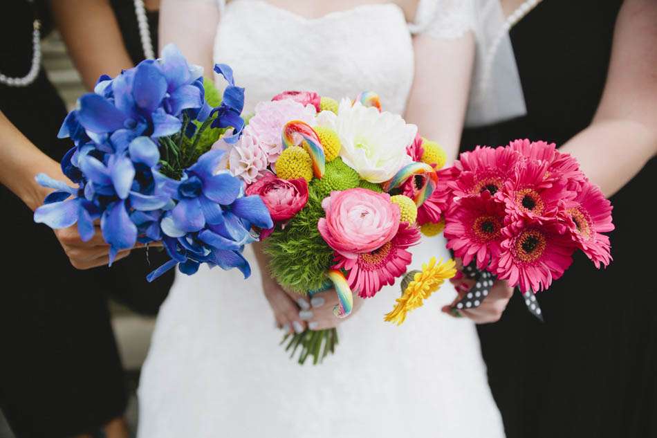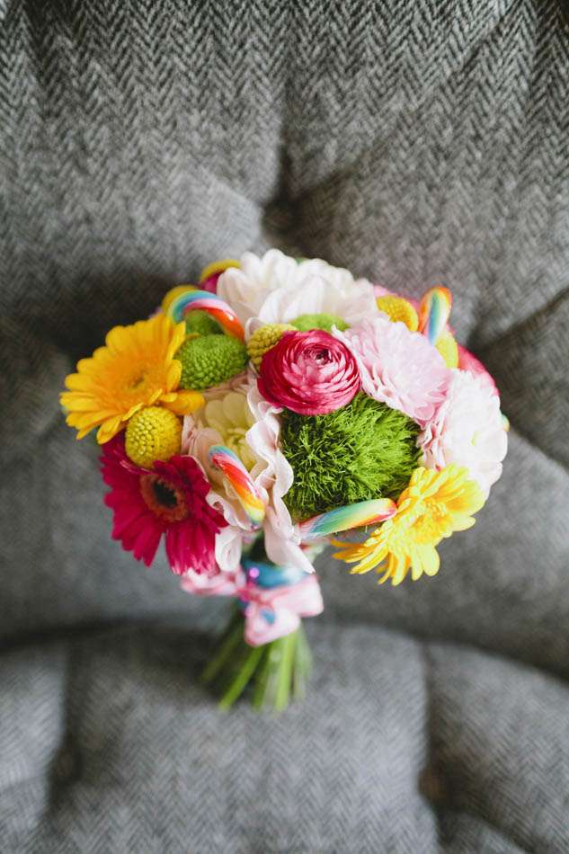 “Inspired by CMYK (but with green thrown in for good measure), and akin to how we’ve decorated our own home, ‘colour pop’ featured heavily, with bright bouquets and buttonholes, differently coloured shoes for each bridesmaid and an abundance of rainbow-esque adornments sprinkled all over the venue. Even the toilets were decorated with fluorescent dinosaurs and glitter signs!”