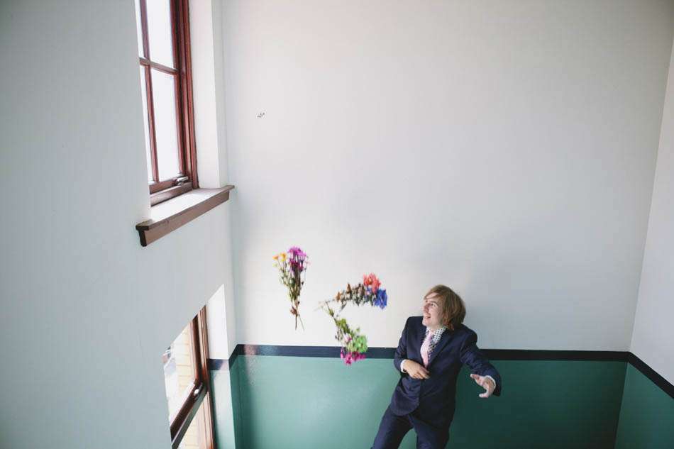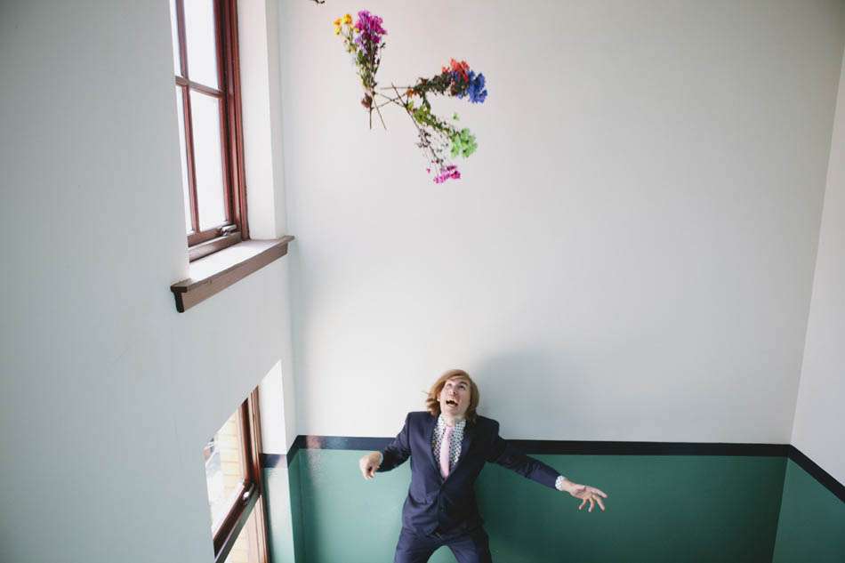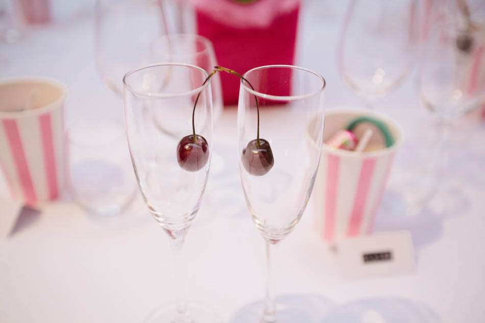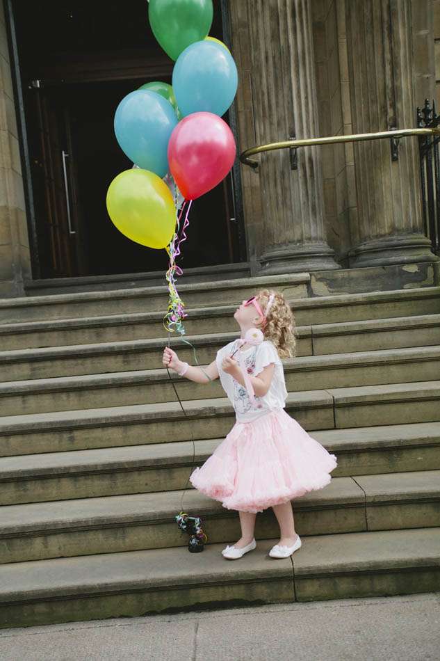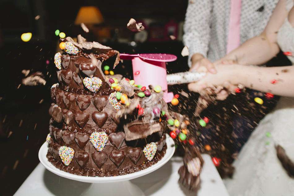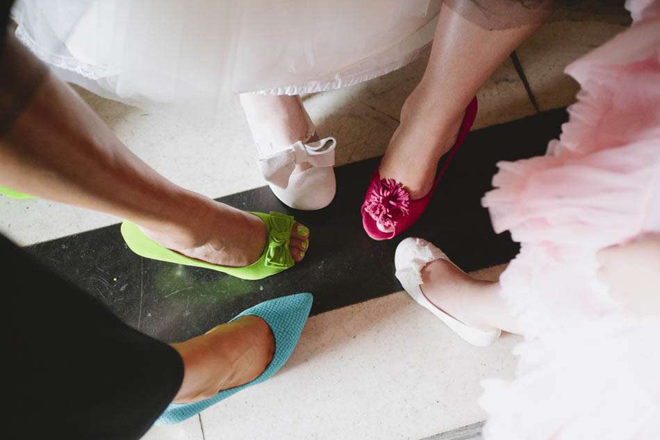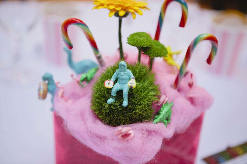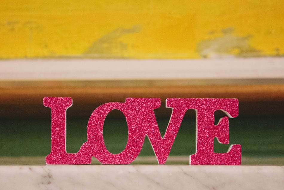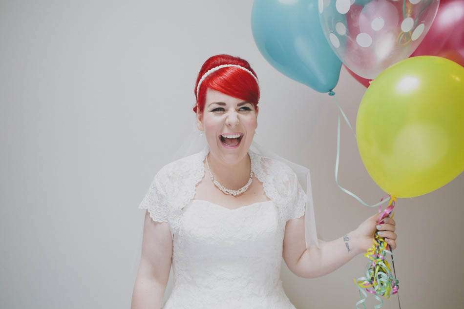 “Inspired by CMYK (but with green thrown in for good measure), and akin to how we’ve decorated our own home, ‘colour pop’ featured heavily, with bright bouquets and buttonholes, differently coloured shoes for each bridesmaid and an abundance of rainbow-esque adornments sprinkled all over the venue. Even the toilets were decorated with fluorescent dinosaurs and glitter signs!”