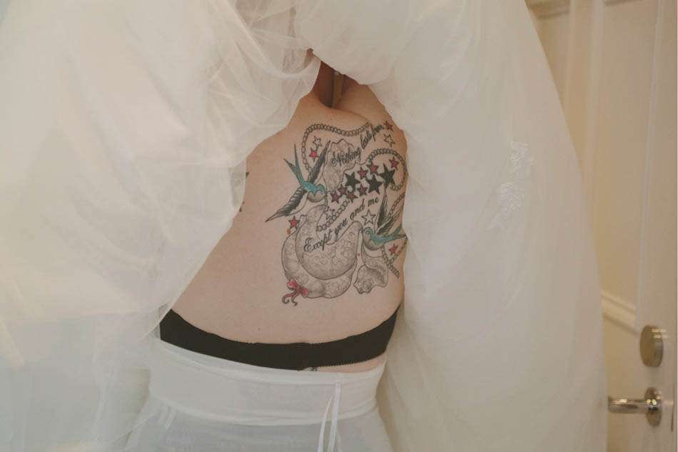 In fact, making their wedding very ‘them’ was certainly the recurring theme, as Claire continues. “From the vintage-style veil on the top of my head, to the custom Converse which donned the groom’s feet, not even the tiniest detail of our wedding was left to chance. We whittled away hour after hour each night on eBay, Etsy, Folksy, Pinterest and of course, Rock n Roll Bride, soaking up every ounce of inspiration we could consume in the process.”