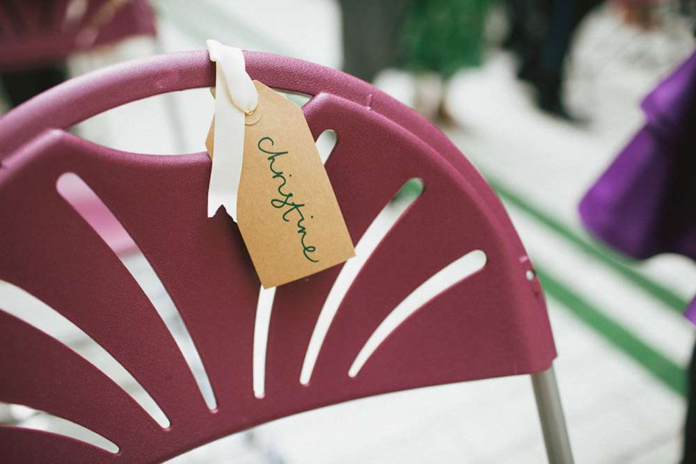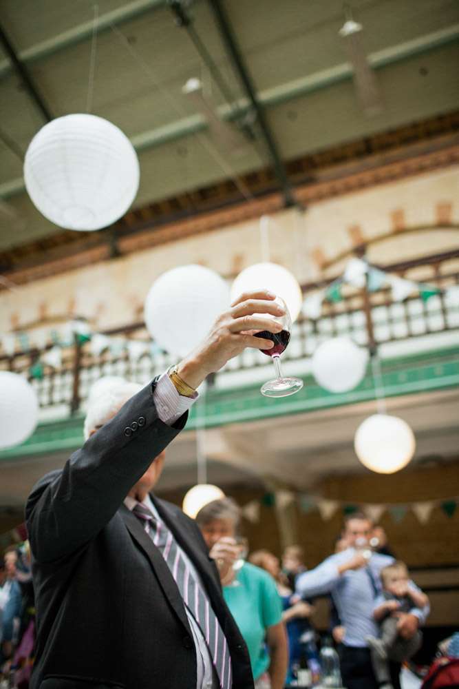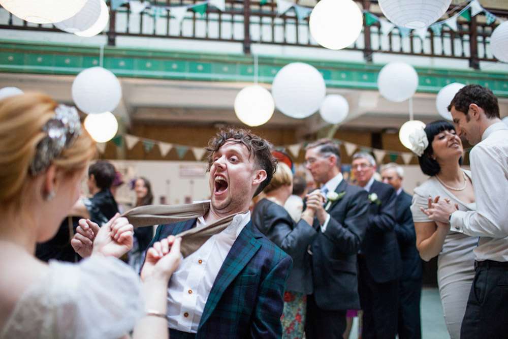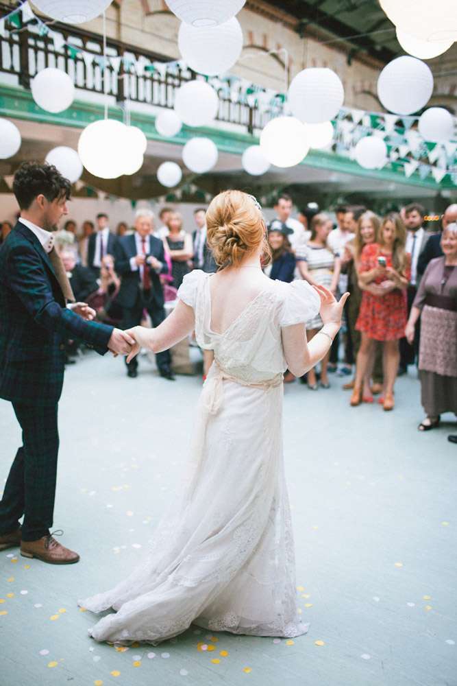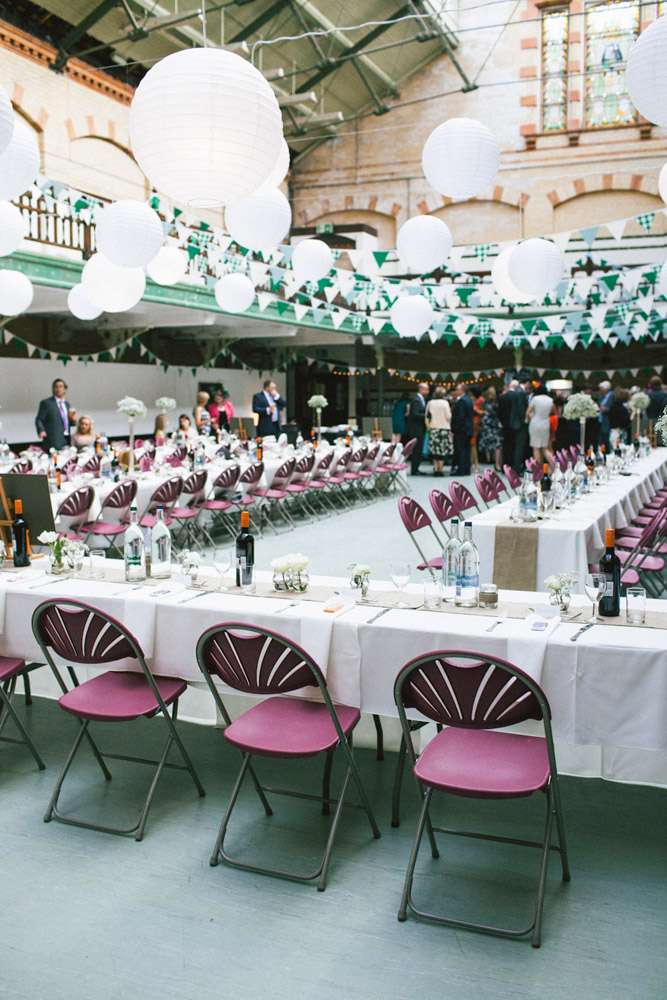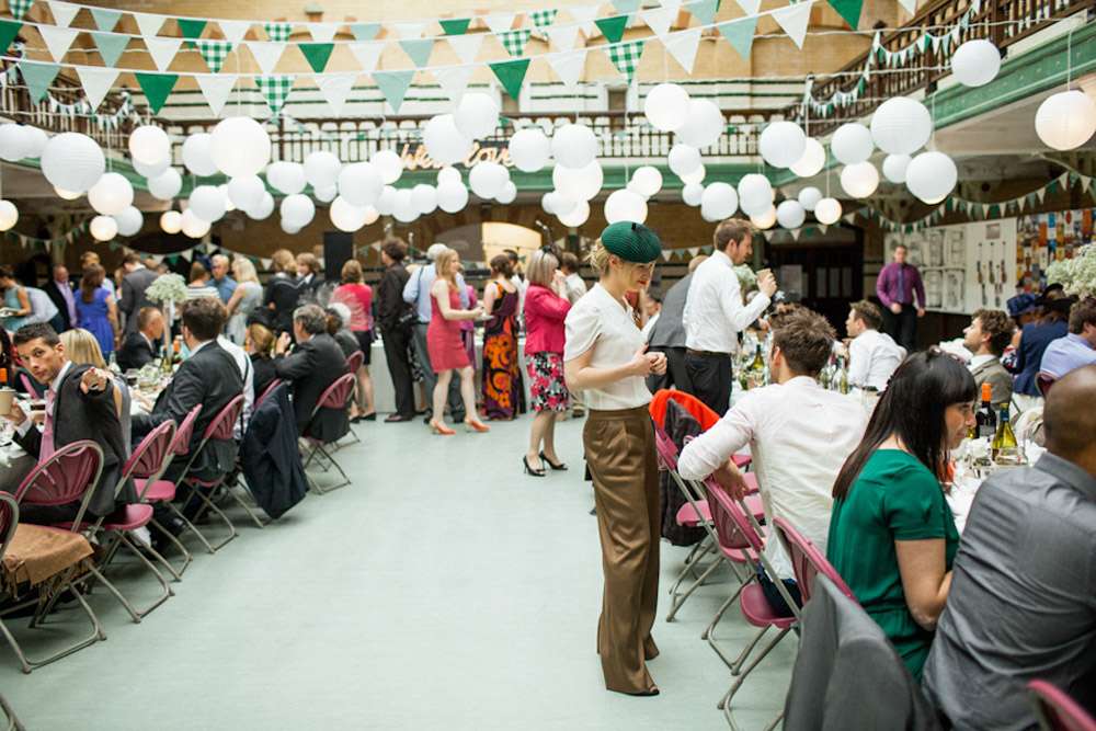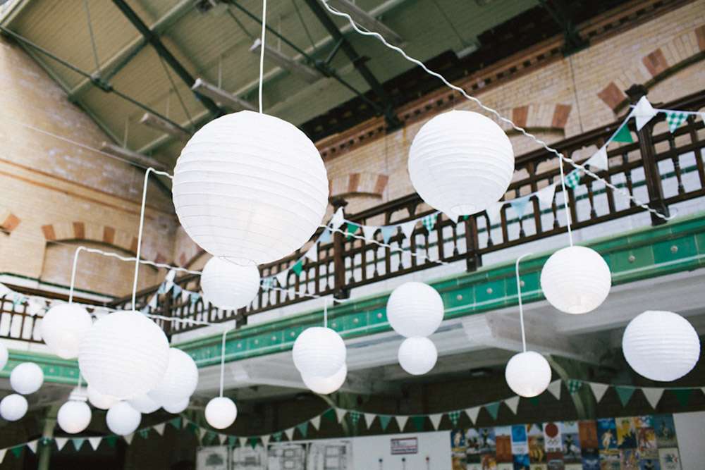 “We decorated the space ourselves”, Fiona continued. “Jonny’s mum handmade 1 km of bunting! Afterwards we donated it to the baths so it could be used for other weddings there. We explored loads of lighting options before deciding on a paper lantern canopy from local lighting company, Hipswing. For us, lights were massively important in making a vast room more cosy for the evening (and lowering the enormously high ceiling a bit). We had to explain we wanted the lights hung very higgledy piggledy, rather the usual uniform spacing, but – just like all the suppliers we did use – they listened and were brilliant.”