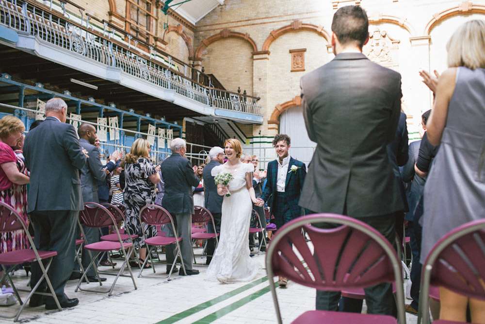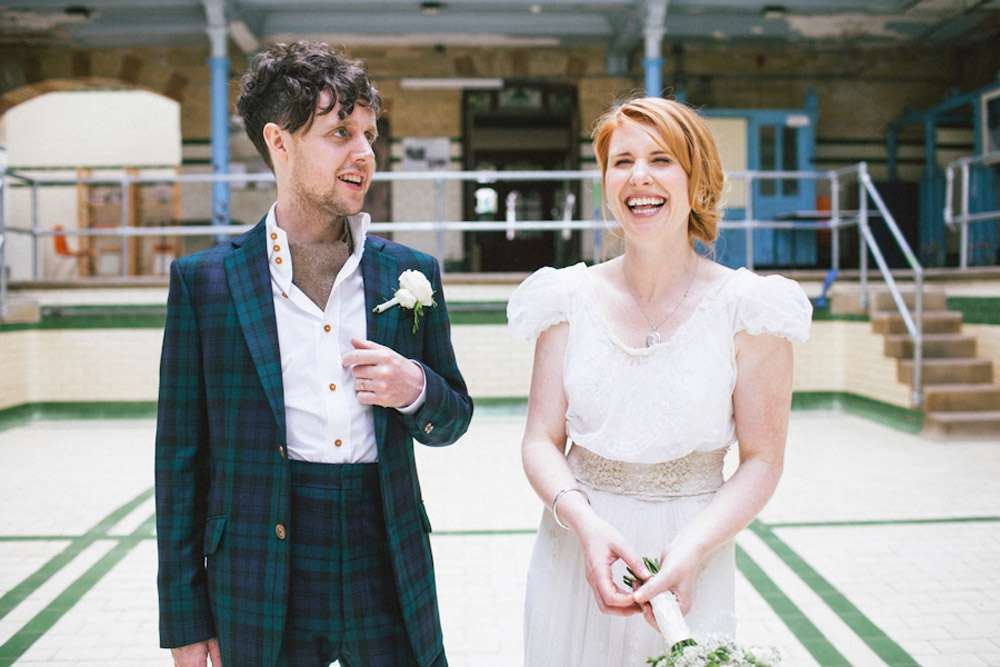 Unique wedding venues can be hard to come across in the UK, but Fiona & Jonny weren’t going to take that lying down. They knew they wanted a memorable space for their union and so selected Victoria Baths in Manchester. “Victoria Baths is an Edwardian swimming baths (which is no longer used as baths, now a restoration project and arts/community venue)”, wrote Fiona. “It was originally three big pools. Two of them remain and are empty – we got married in the deep end of the biggest one and had our reception on top of the other! It was boarded over with a sprung dance floor in the fifties (my granddad used to teach ballroom dancing in that room). The remaining smaller pool and the rest of building, which is pretty vast, was left for people to wander around and explore.”