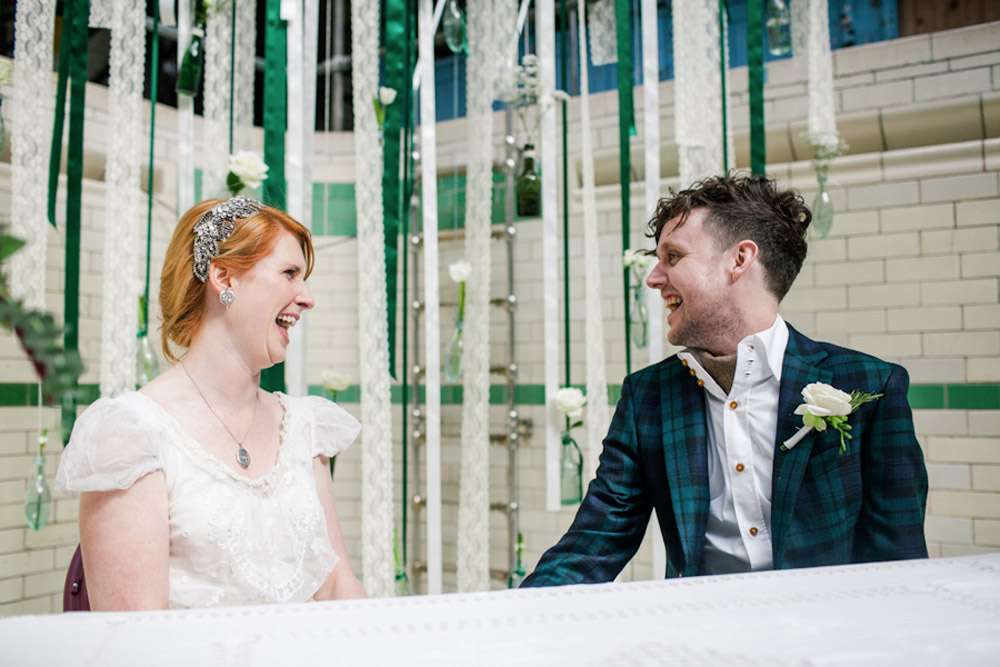 “The venue played a huge part in our thinking. We found Victoria Baths quite quickly. We knew straight away we didn’t want the ‘Bronze package’ at a conveyor belt wedding venue so we looked at locations used for other stuff – filming, fashion, music, fairs etc – places with a bit of character or history and where we wouldn’t be restricted or forced to use ‘their people’ for our food, bar and so on. Neither of us wanted to blow stupid money either. Lots of our friends have had wonderful, really personal and brilliantly happy DIY-style weddings so we were definitely inspired by them too.”
