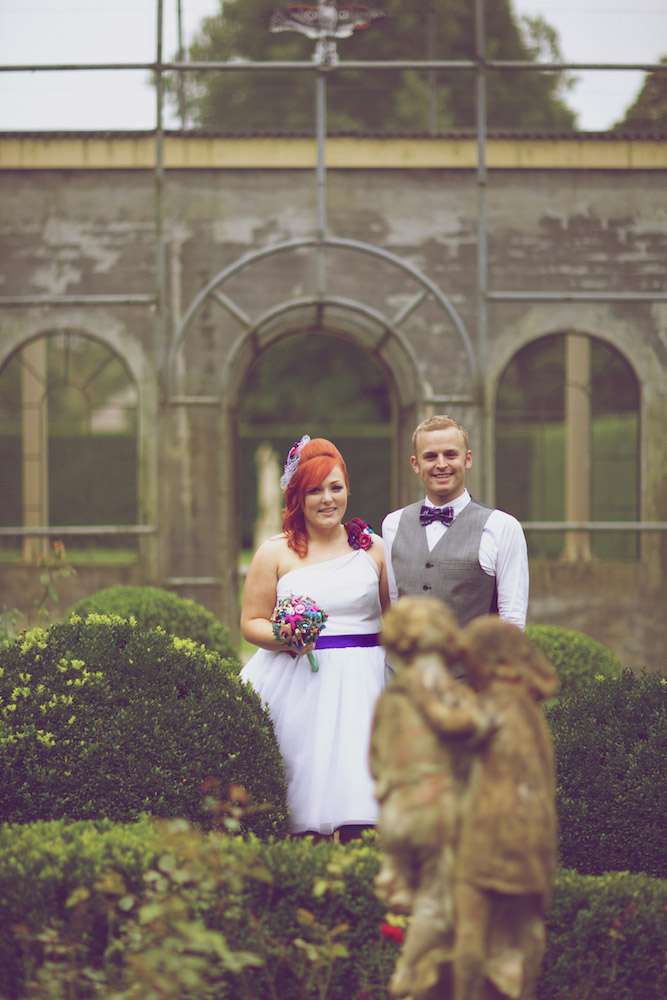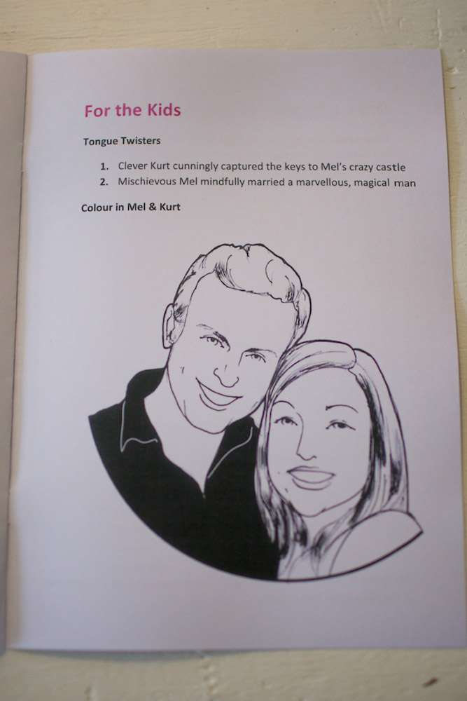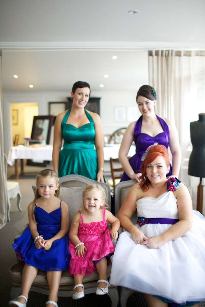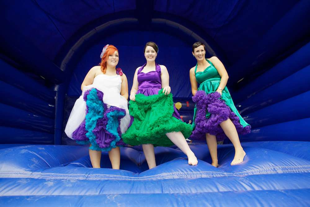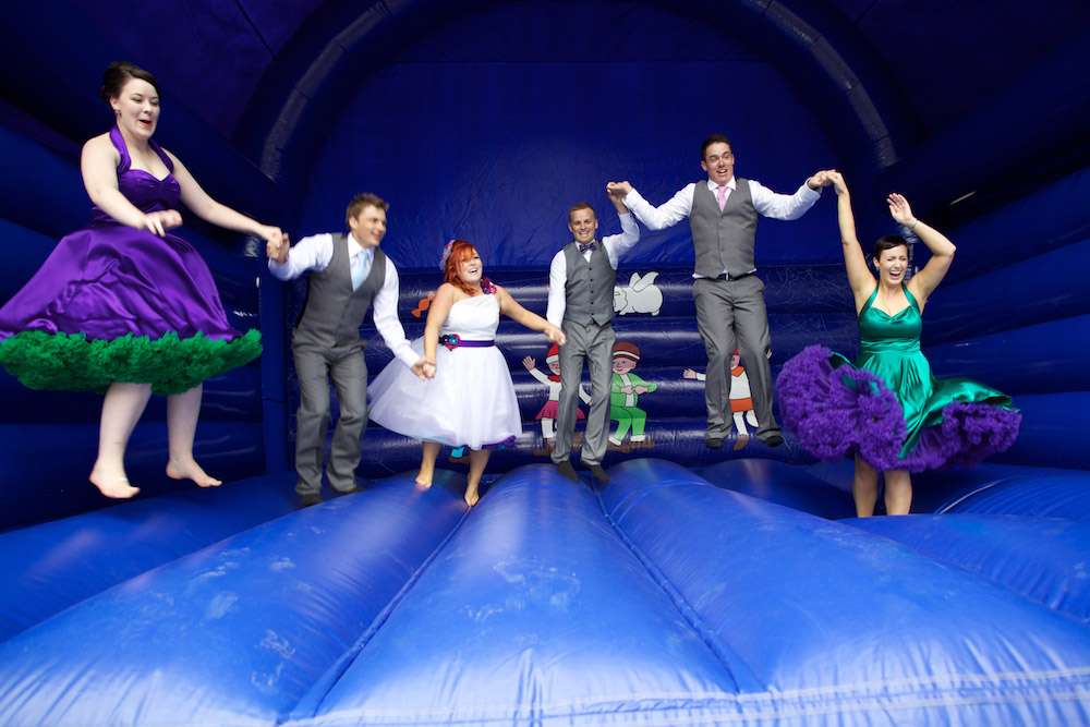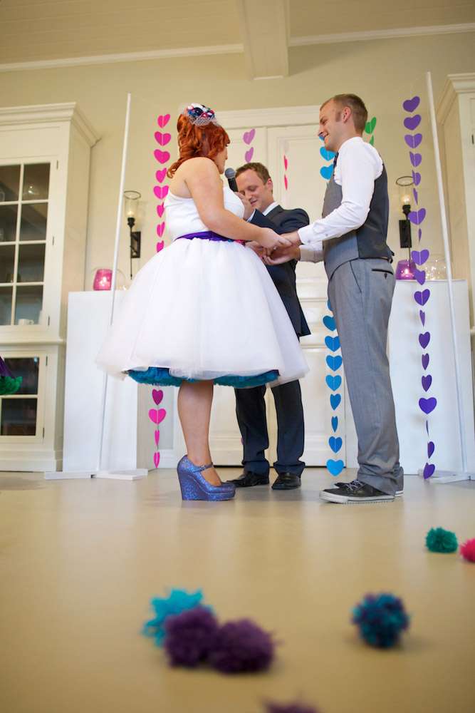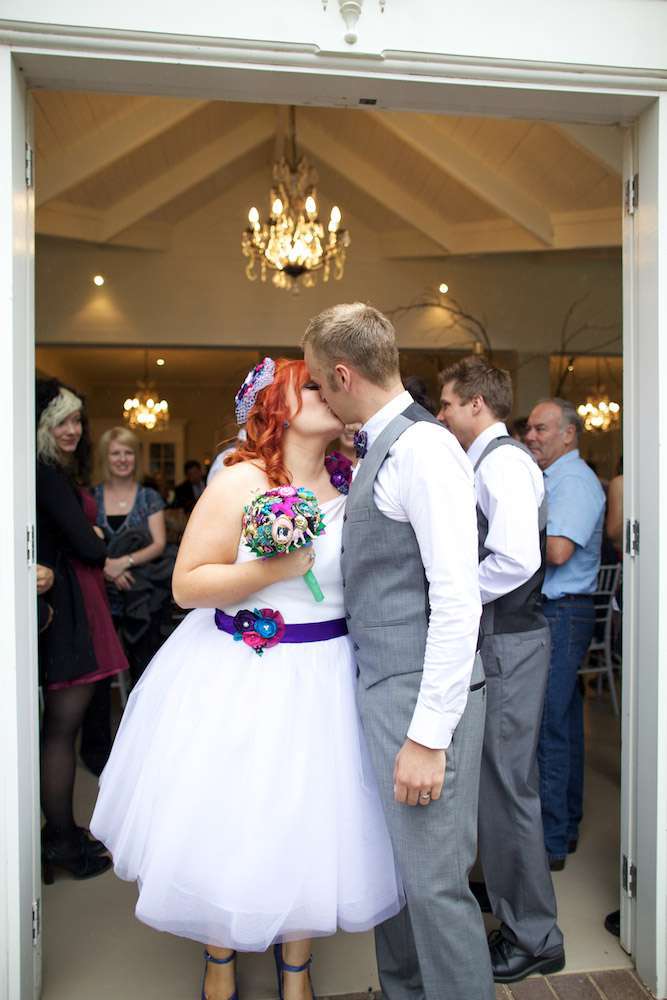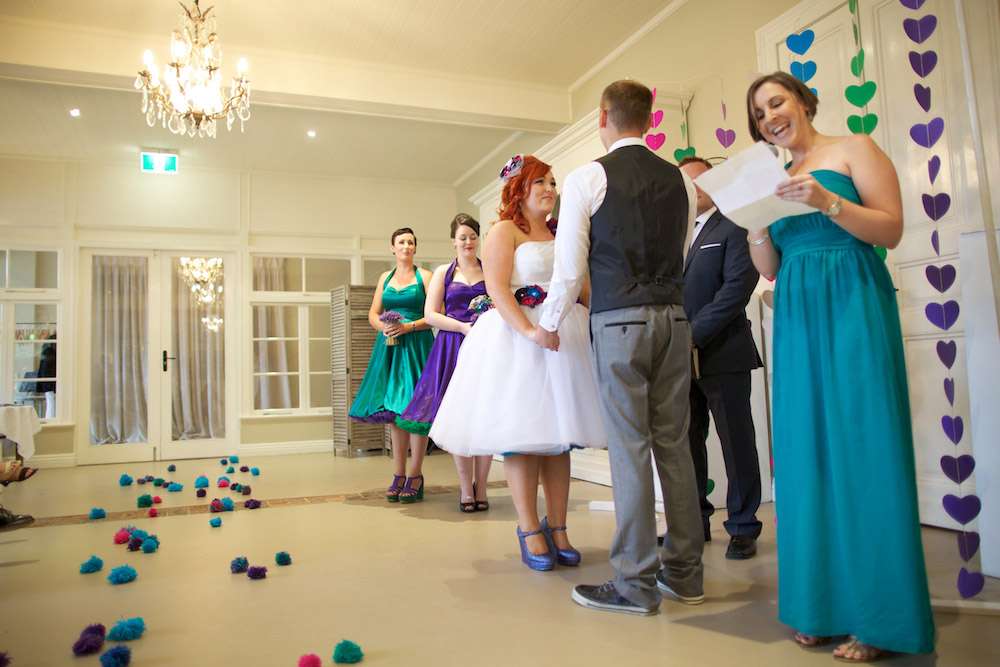 “We wanted a vintage inspired, young, funky, colourful and fun wedding that everyone could enjoy, not just us”, the bride continued. “I spent a lot of time online looking at different gorgeous weddings and getting ideas from sites such as Rock n Roll Bride and wanted a way to incorporate lots of whimsical and bright touches in the day. We wanted everyone to have a fun time so we made a program with lots of fun activities including a people bingo so everyone would mingle and we had a bouncy castle, which was fun but kind of scary in a wedding dress! We had a polaroid camera with props so everyone could take photos and stick them in our guest book. We asked all of our guests to contribute a song to the playlist for the day and made sure we included them all. We tried to include family and friends as much as possible and tried to make sure it was a wonderful day for everyone, not just us.”