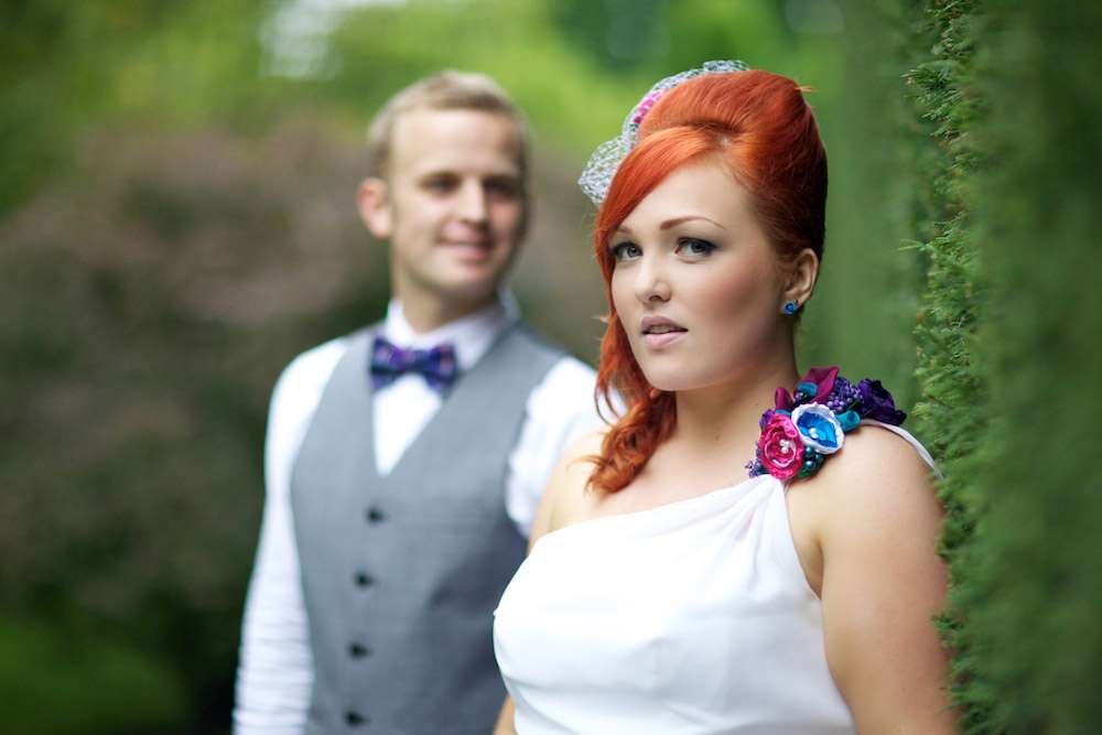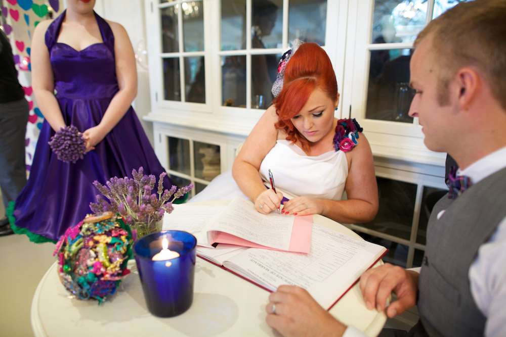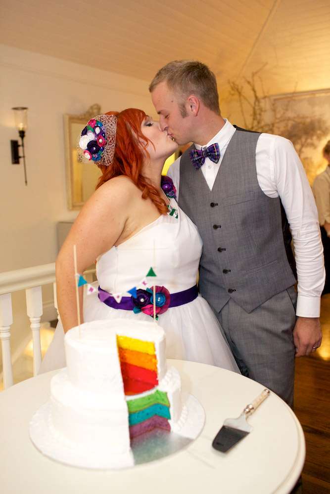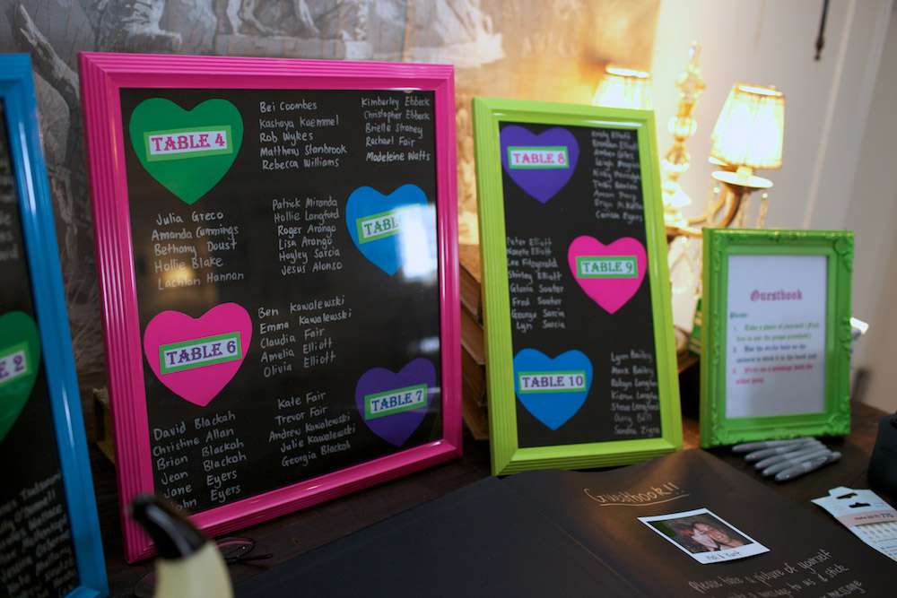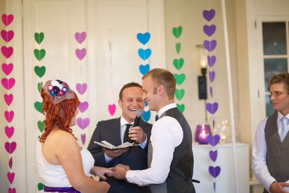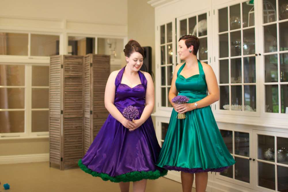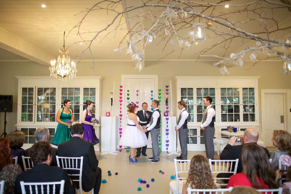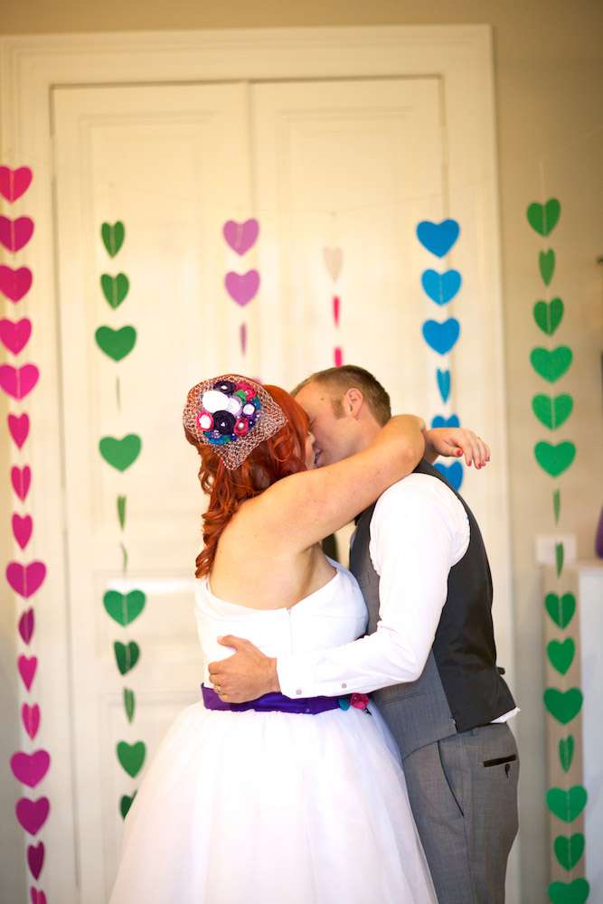 “We wanted a vintage inspired, young, funky, colourful and fun wedding that everyone could enjoy, not just us”, the bride continued. “I spent a lot of time online looking at different gorgeous weddings and getting ideas from sites such as Rock n Roll Bride and wanted a way to incorporate lots of whimsical and bright touches in the day. We wanted everyone to have a fun time so we made a program with lots of fun activities including a people bingo so everyone would mingle and we had a bouncy castle, which was fun but kind of scary in a wedding dress! We had a polaroid camera with props so everyone could take photos and stick them in our guest book. We asked all of our guests to contribute a song to the playlist for the day and made sure we included them all. We tried to include family and friends as much as possible and tried to make sure it was a wonderful day for everyone, not just us.”