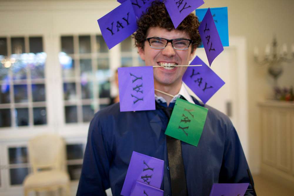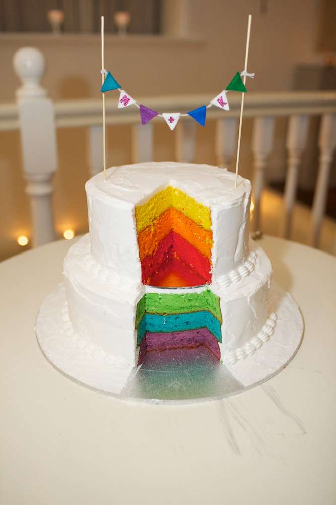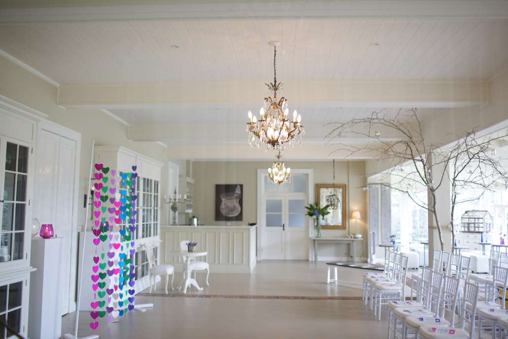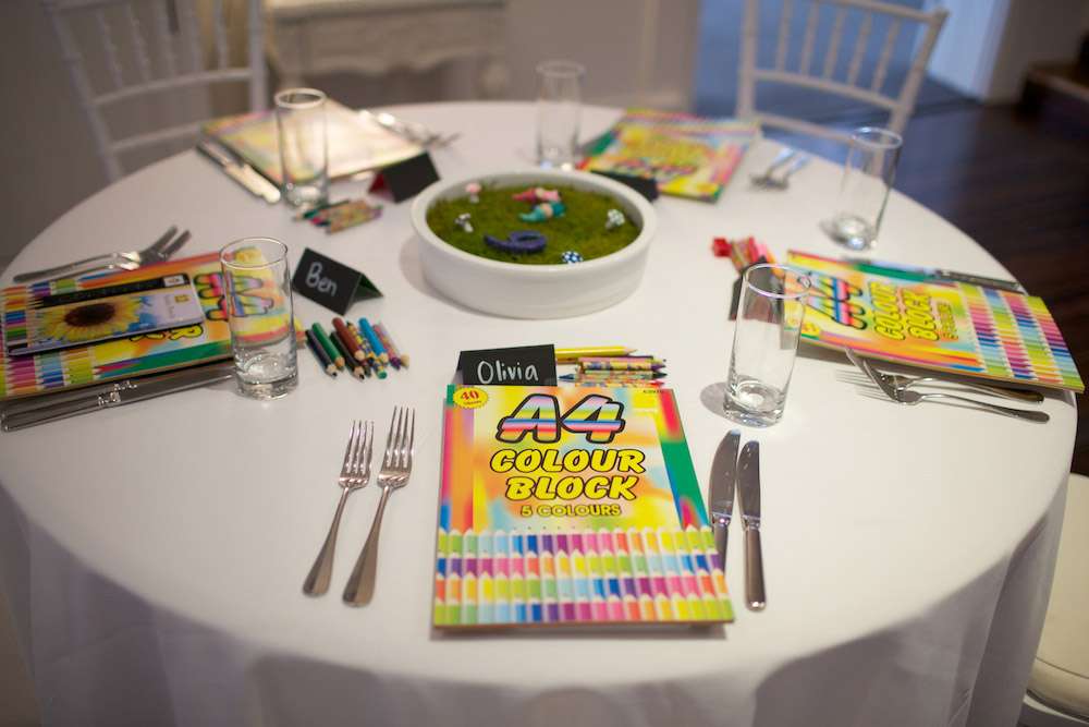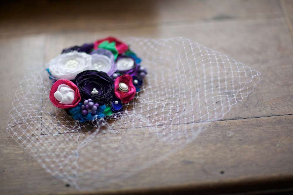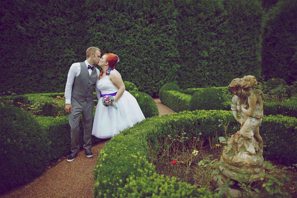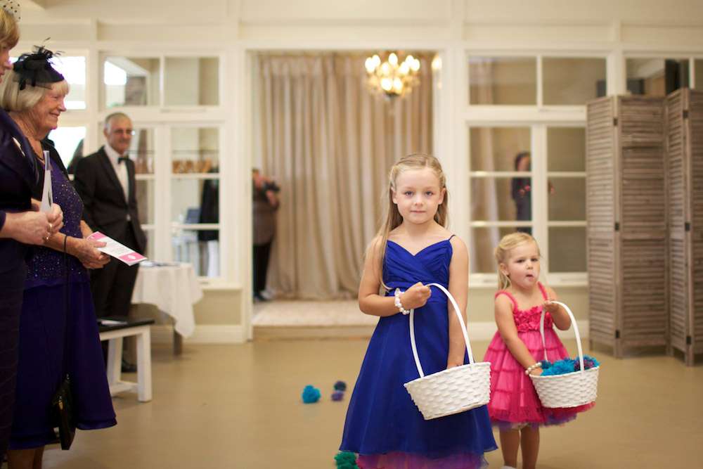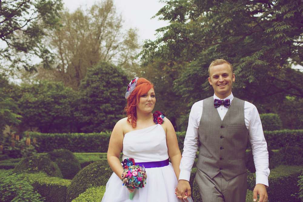 “We wanted a vintage inspired, young, funky, colourful and fun wedding that everyone could enjoy, not just us”, the bride continued. “I spent a lot of time online looking at different gorgeous weddings and getting ideas from sites such as Rock n Roll Bride and wanted a way to incorporate lots of whimsical and bright touches in the day. We wanted everyone to have a fun time so we made a program with lots of fun activities including a people bingo so everyone would mingle and we had a bouncy castle, which was fun but kind of scary in a wedding dress! We had a polaroid camera with props so everyone could take photos and stick them in our guest book. We asked all of our guests to contribute a song to the playlist for the day and made sure we included them all. We tried to include family and friends as much as possible and tried to make sure it was a wonderful day for everyone, not just us.”