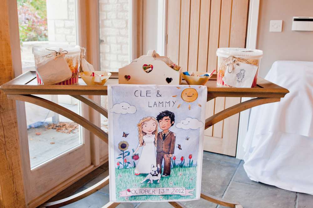 “I also didn’t want to feel guilty about chopping down millions of trees for the wedding so I sourced our invitations some made from elephant poo! They sent me samples and I chose the stuff with the best bits in – haha! The menus and table place names and seating plans were printed on the on it (which I designed myself, based on our favourite records) as well as the invites. My very talented friend Tessa Rose designed the invite, which we also blew up and used to decorate the entrance hall as well as get printed on to a canvas, which we used as a ‘guestbook’ art piece.”