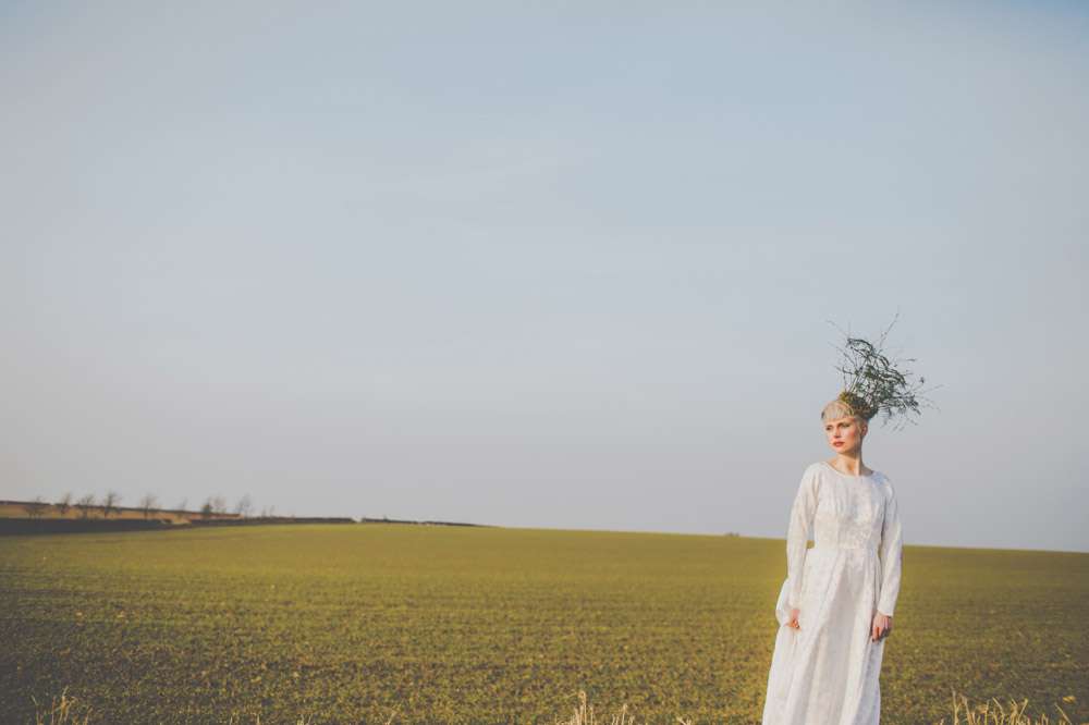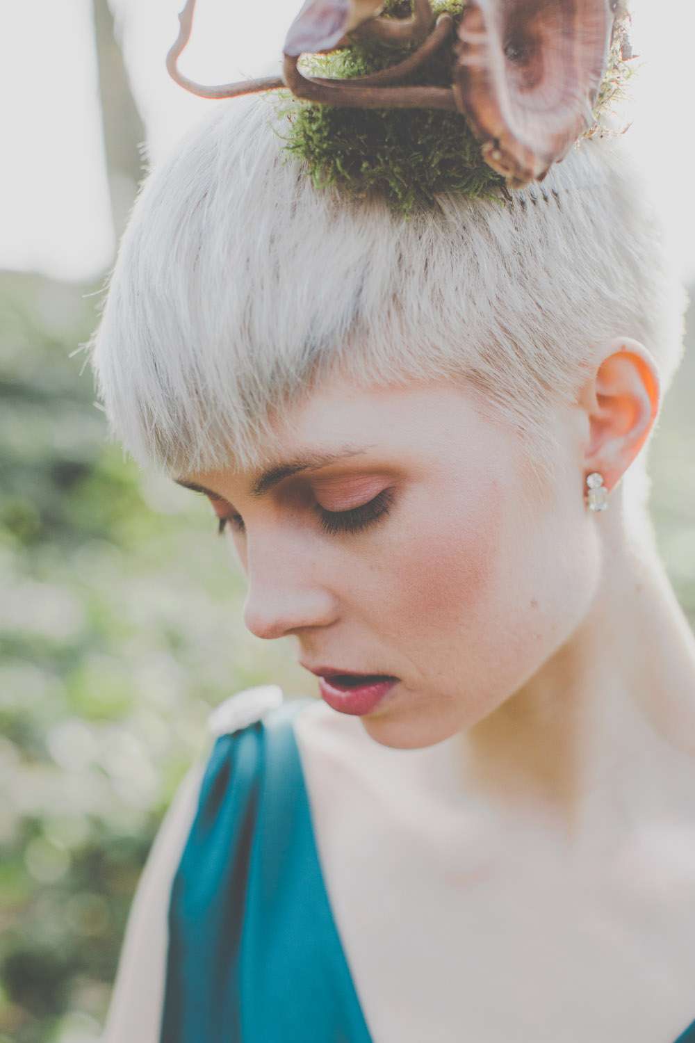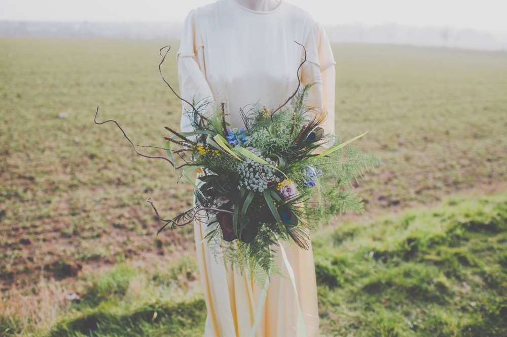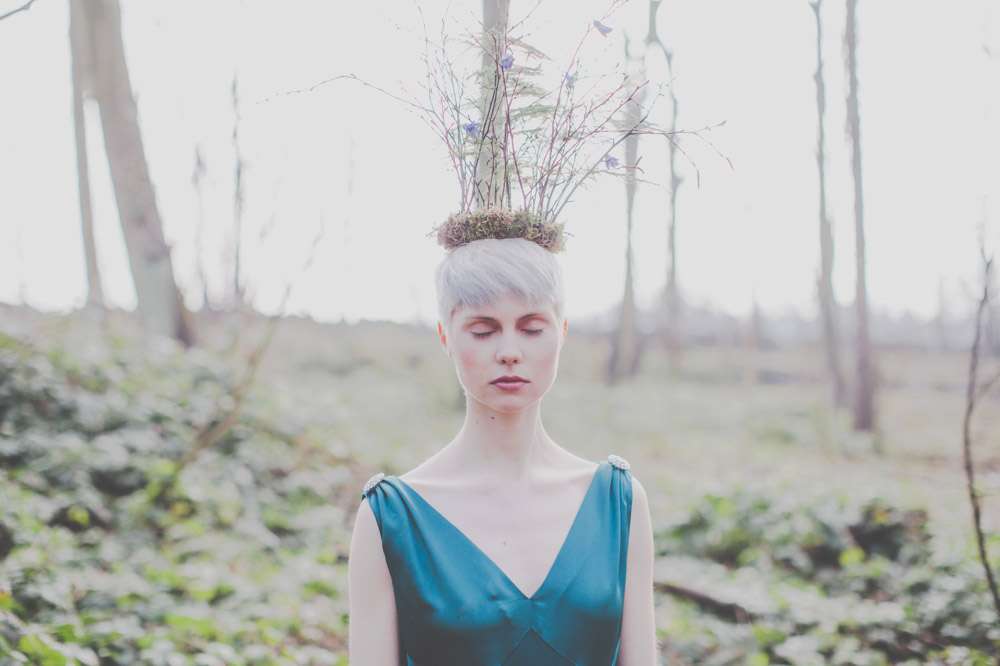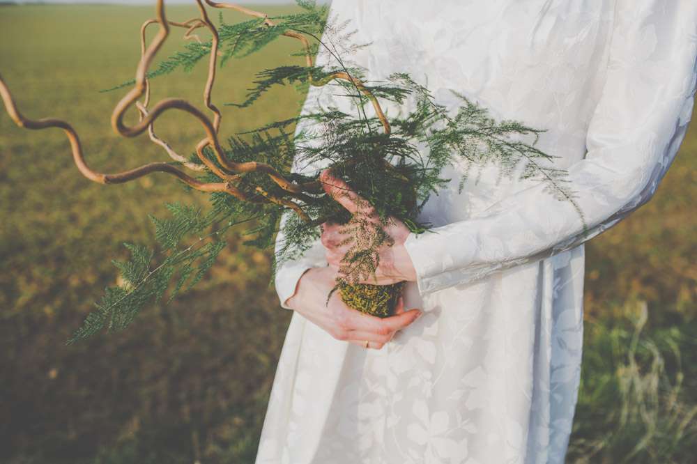 “The only brief really was that we keep it organic and elegant but simple and with a little edge. Hayley from Glory Days Vintage provided the awesome vintage dresses and excitedly made the green 1930s gown especially for Jemima. Fiona from Firenza Floral Design did a little digging around in her garden and put together the most amazing twiggy bouquets and a moss filled crown!”