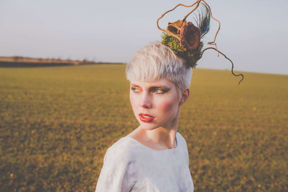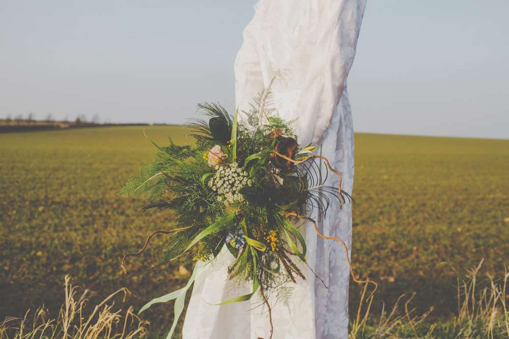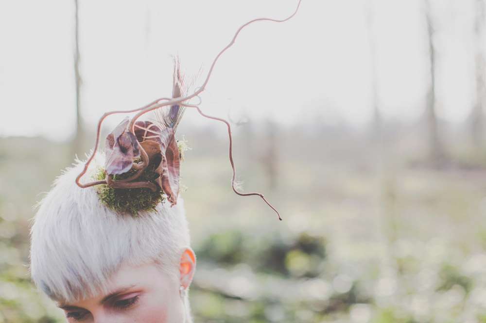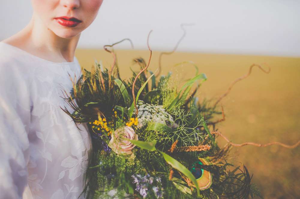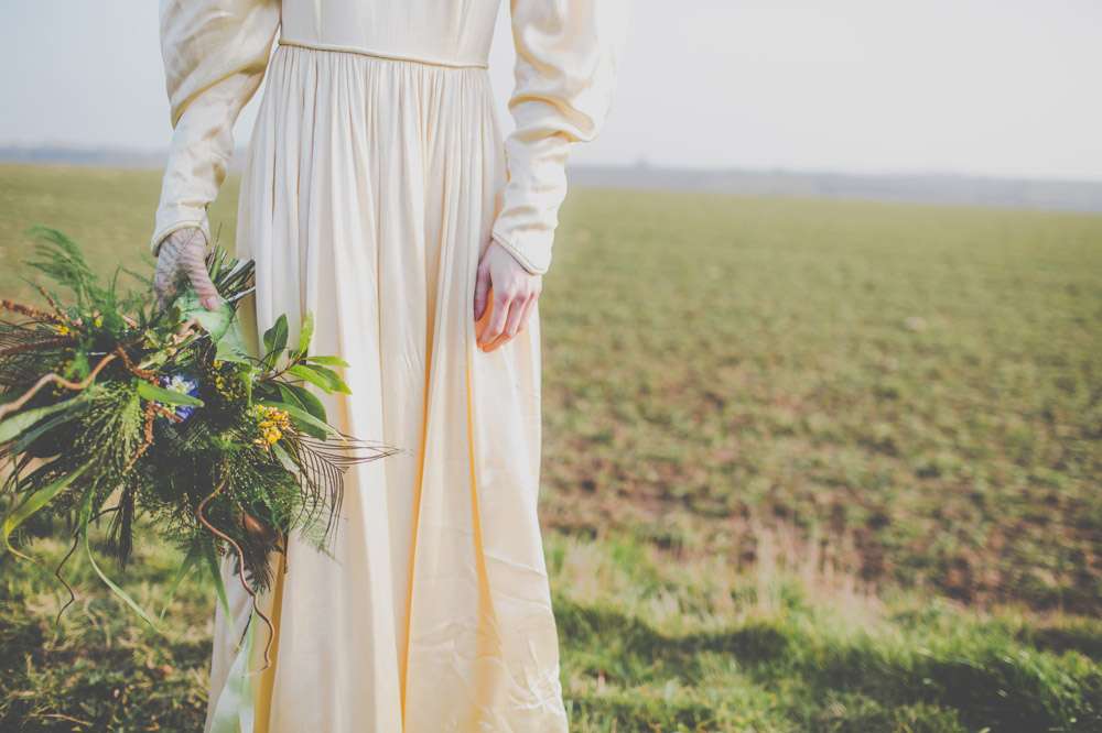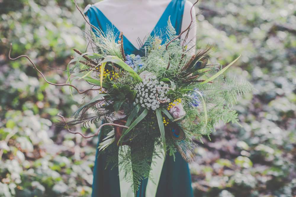 “The only brief really was that we keep it organic and elegant but simple and with a little edge. Hayley from Glory Days Vintage provided the awesome vintage dresses and excitedly made the green 1930s gown especially for Jemima. Fiona from Firenza Floral Design did a little digging around in her garden and put together the most amazing twiggy bouquets and a moss filled crown!”