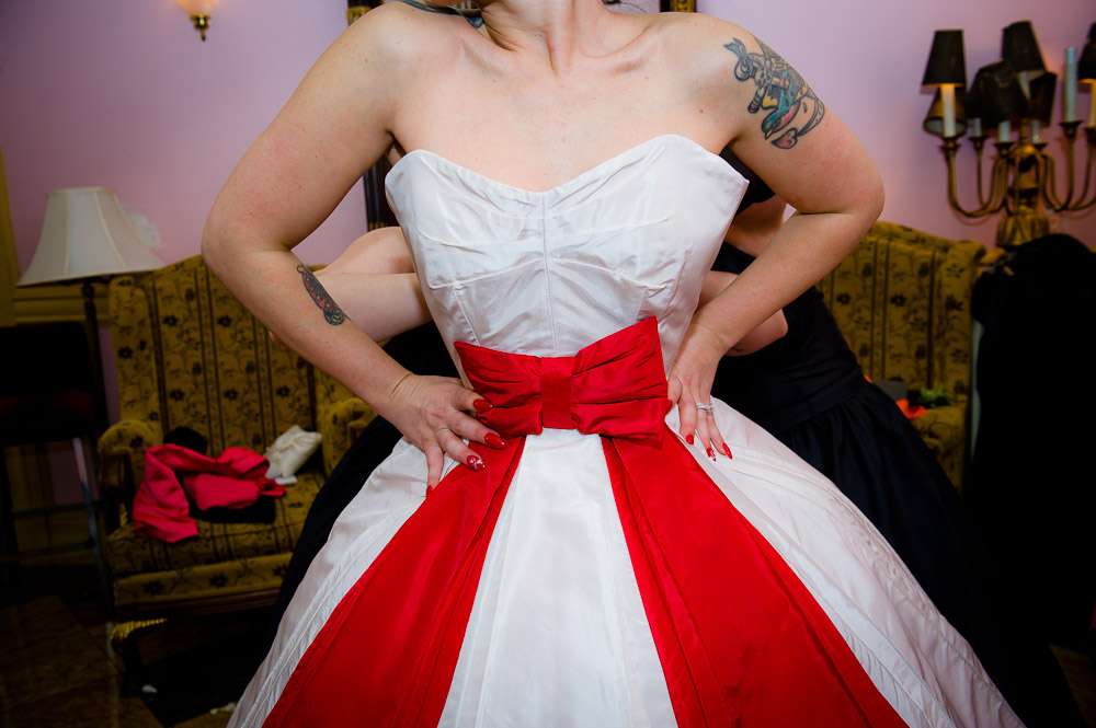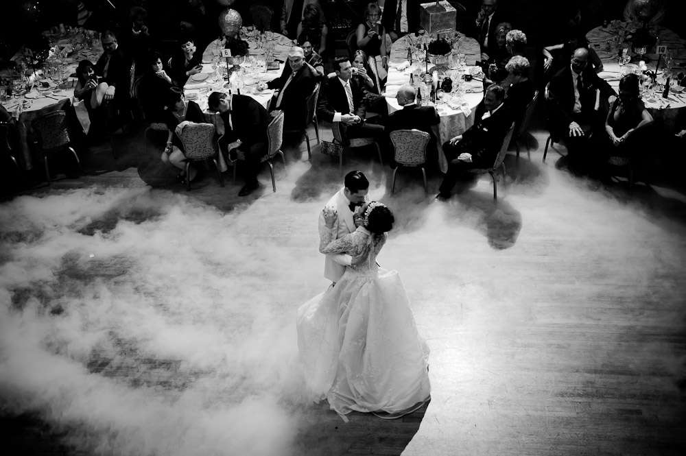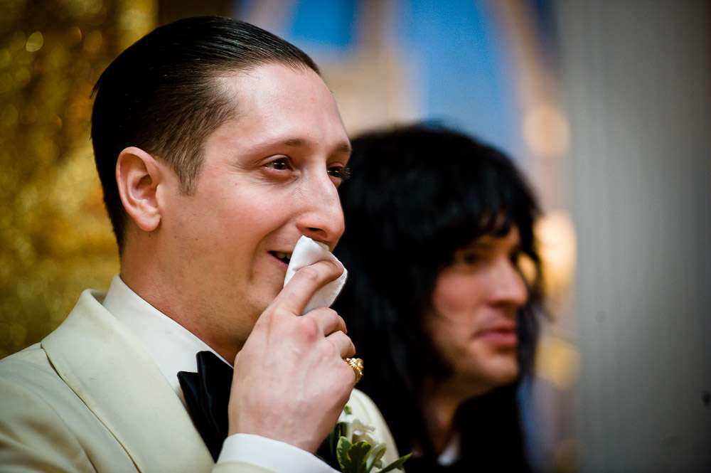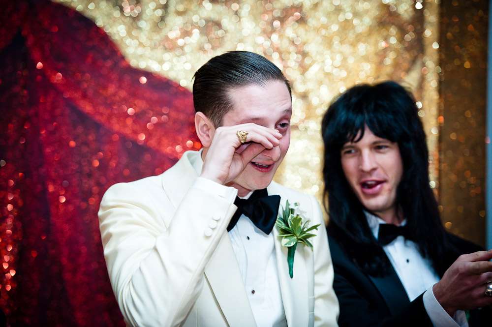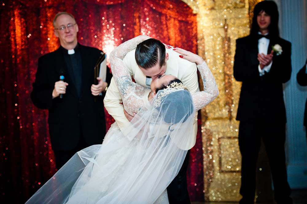 “We approached the wedding like we approach organizing our shows”, began the bride, “we didn’t let the whole ‘wedding insanity’ creep into our brains and I think we were both born with the Rock n Roll spirit in our blood! Our theme was just us. We wanted to reflect our personalities in the wedding and really just create a great party that would make our parent’s and family happy and comfortable while also entertaining our showbiz pals. Our big band was a mix of Brian’s musician pals, our centerpieces and backdrop was created by a designer I use to do show sets for me and my gowns were from my costume designer. We really stayed inside our show business/ night-life circle as much as we could and I think that helped to keep our wedding ‘vibe’ so representative of us.”
