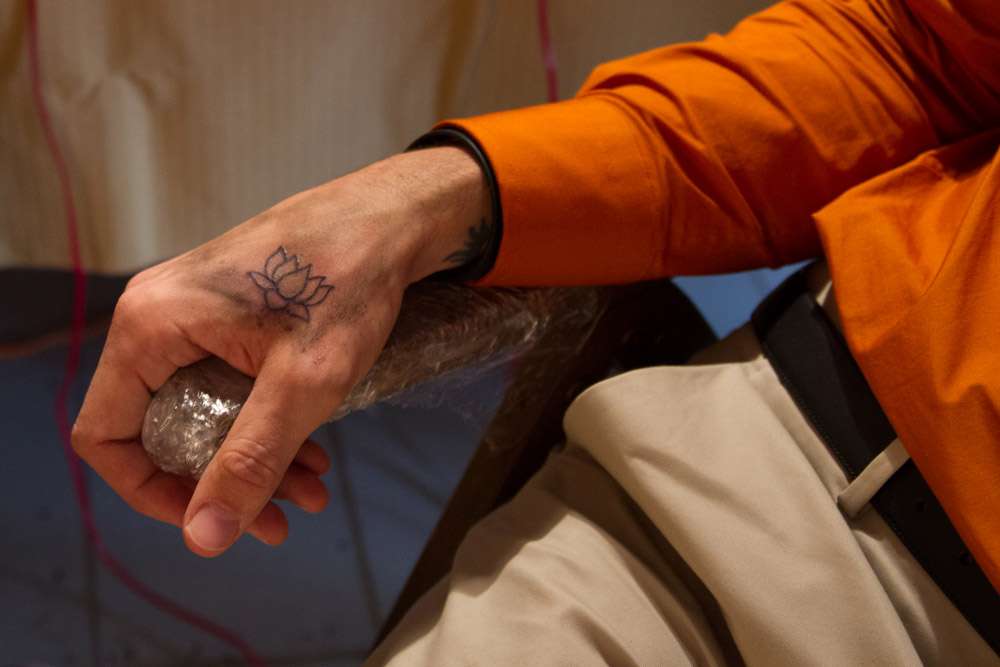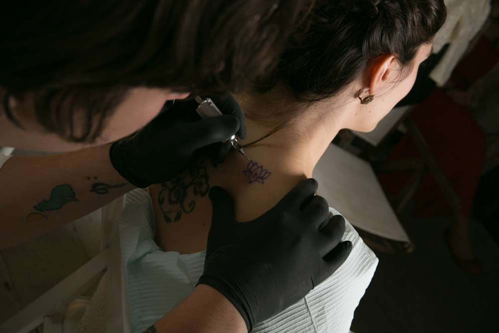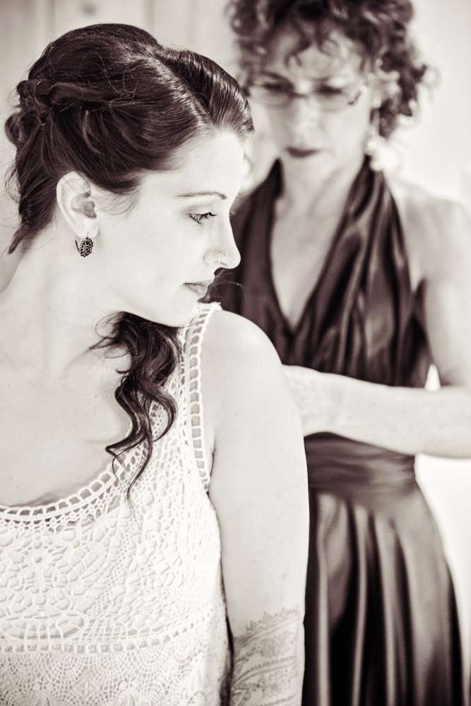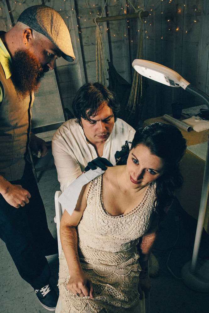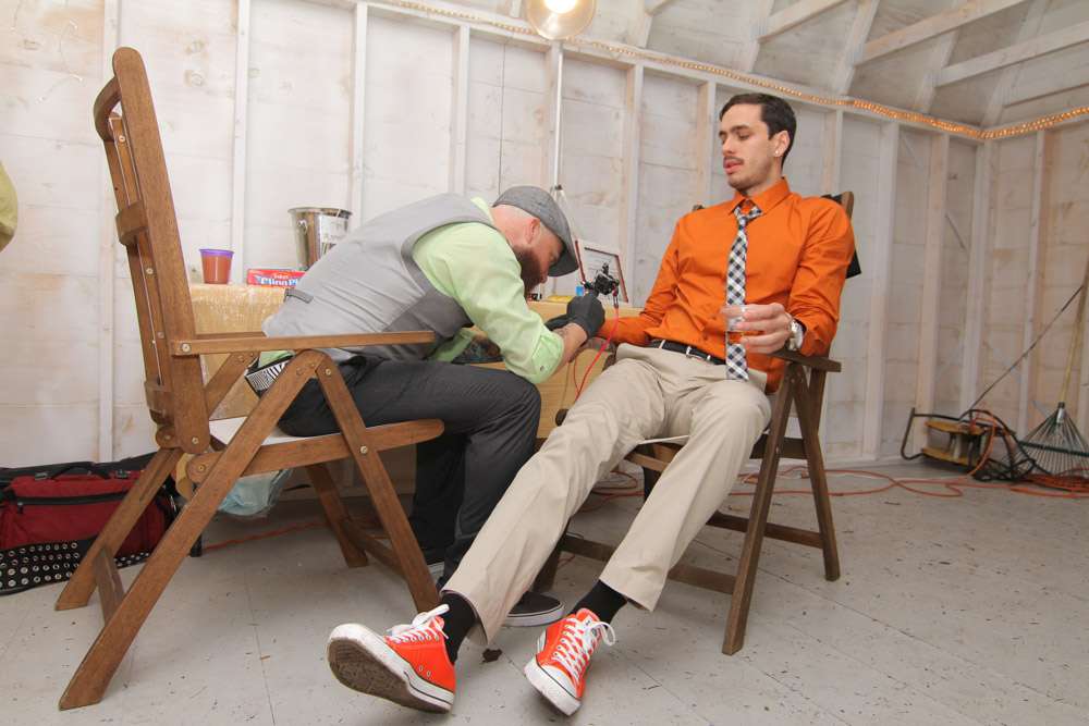 But the coolest thing about the wedding has got to be the fact that they had a pop up tattoo studio! Katie explains, “YES, we had a tattoo studio at our wedding. We transformed our shed in the back yard and set up lights, tables, chairs…you name it. We designed 6 wedding tattoos that our guests could get and had our friend John ‘Pagoda’ Martin, who currently tattoos Body Art Tattoo Studio in Burlington, VT. We had about 15 guests get tattooed and about 30 more who wanted to, but we ran out of time! I chose a small lotus on my shoulder and Mike tattooed the first part of it. It was pretty awesome. Pagoda finished the rest.”