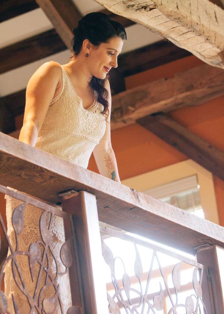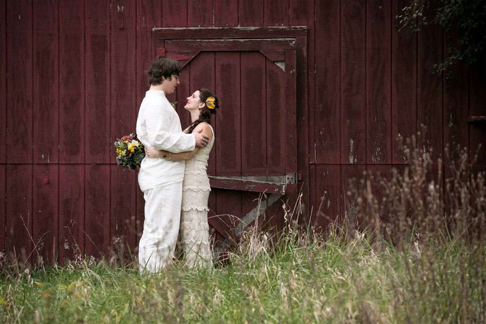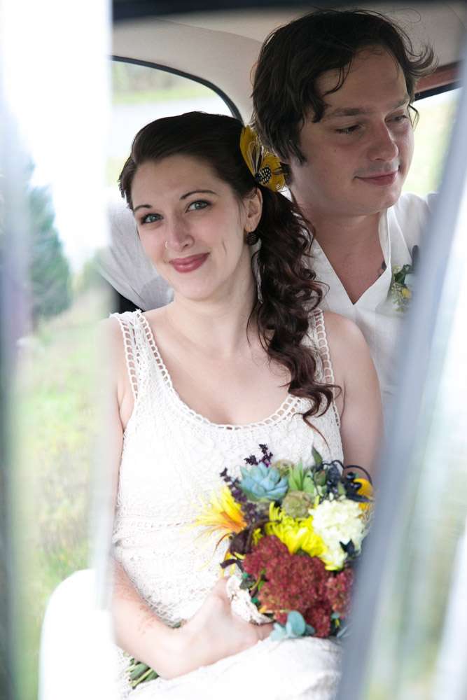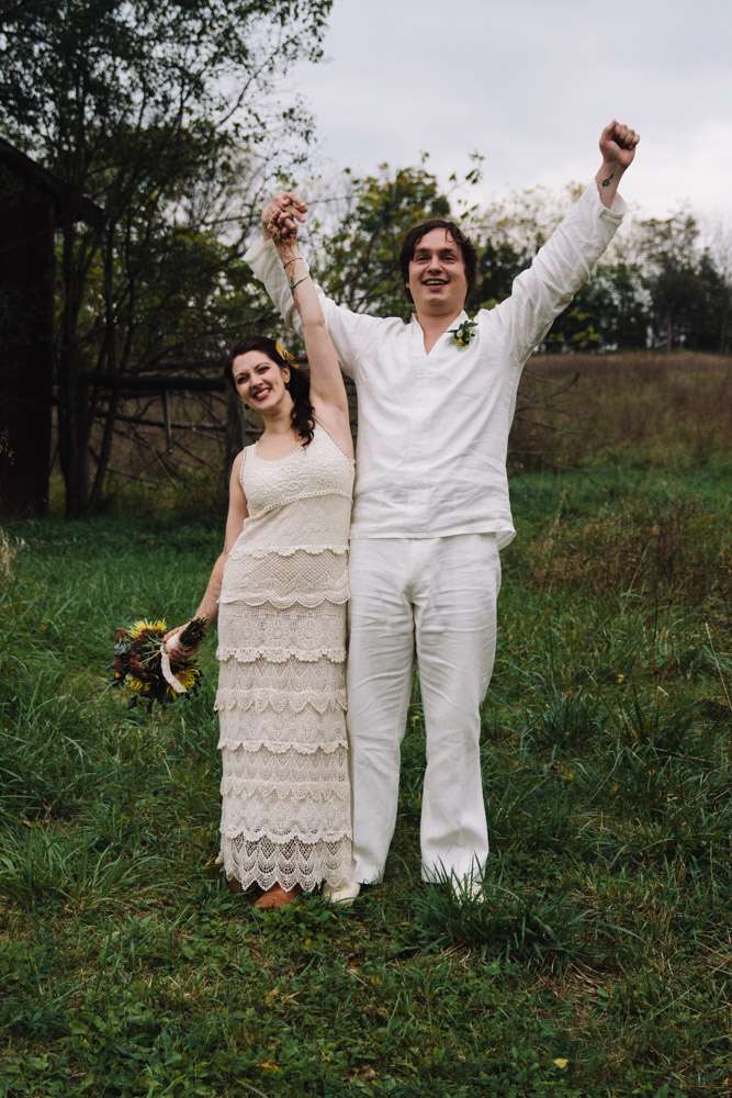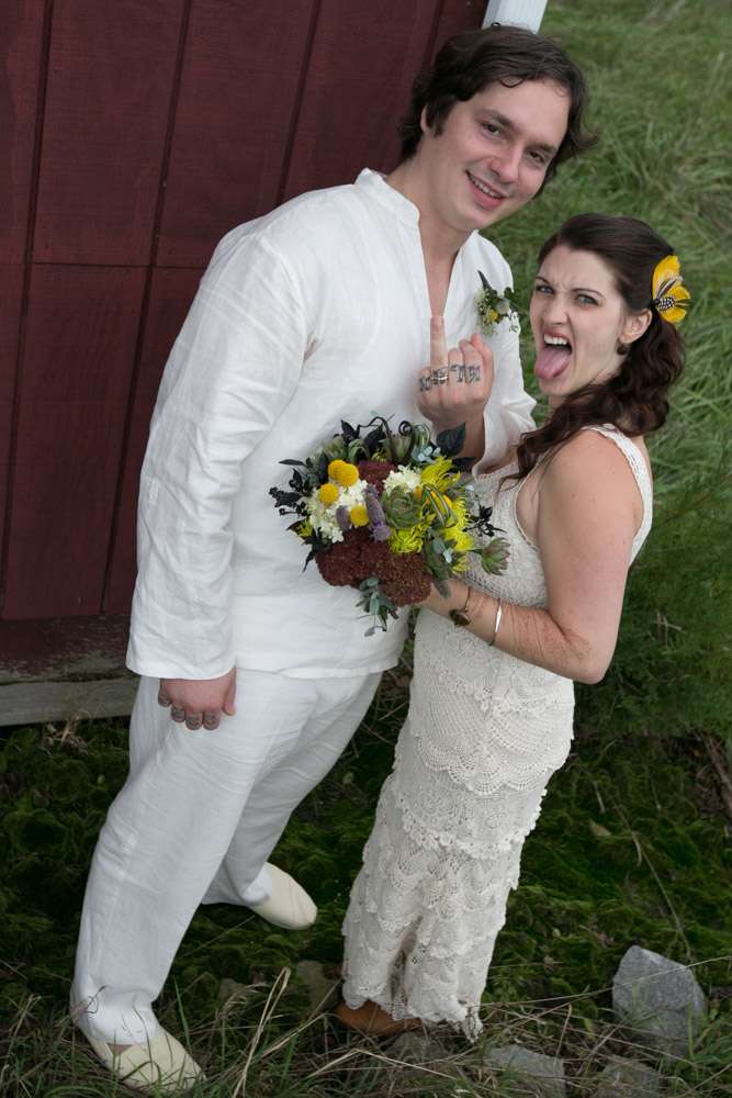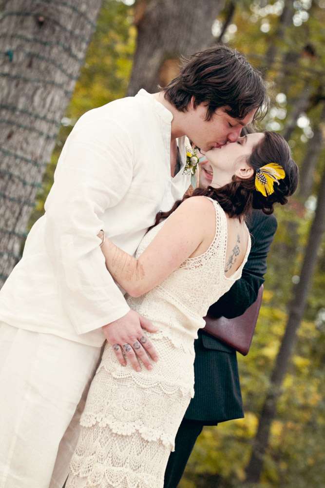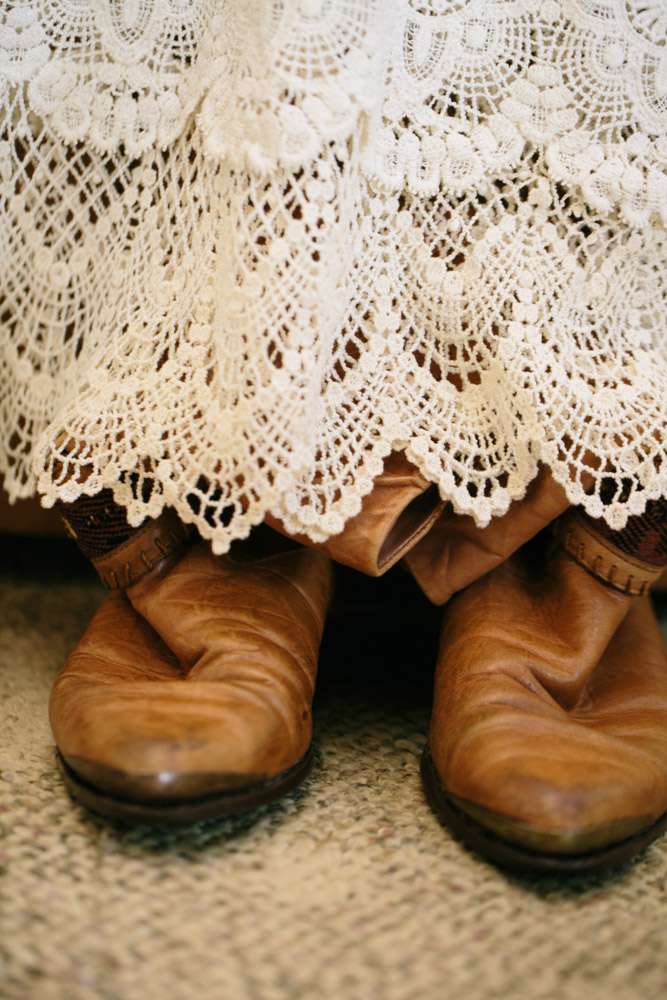 Katie put her own wedding outfit together from an American Eagle cream crochet top, a matching crochet skirt and vintage cowboy boots. Each piece only cost $25 each and were sown together to create a dress by Michael’s mother.