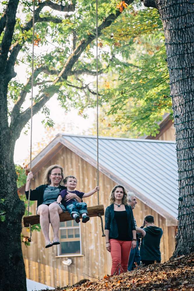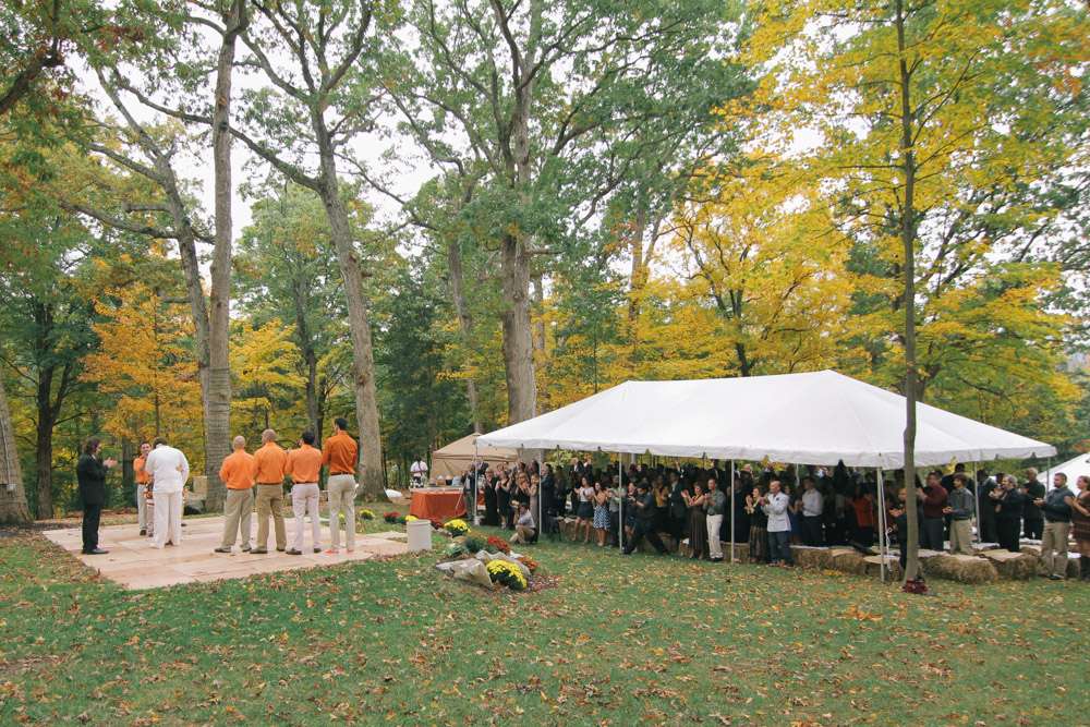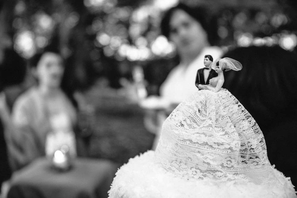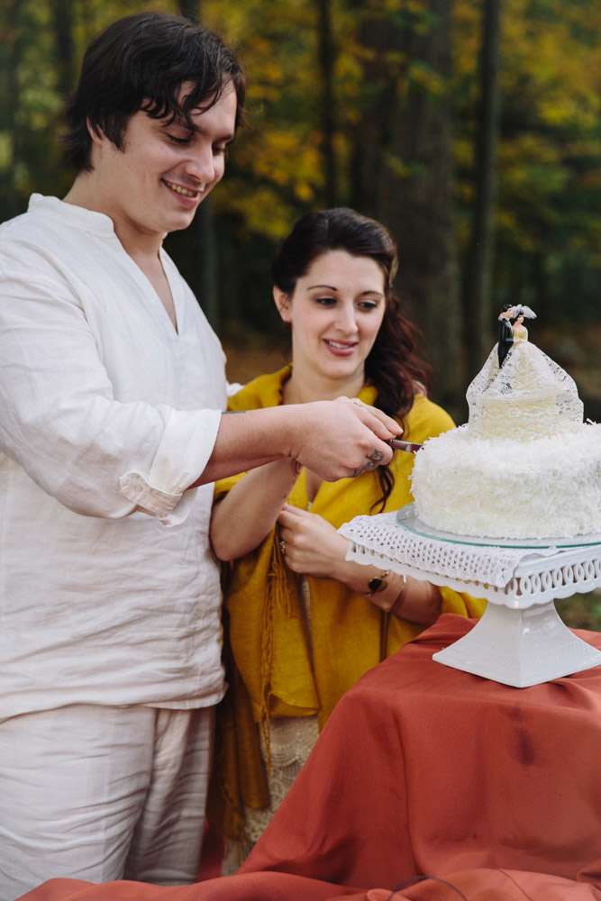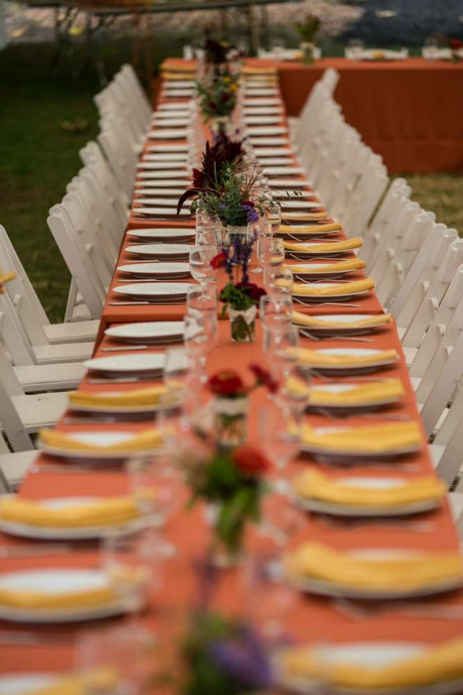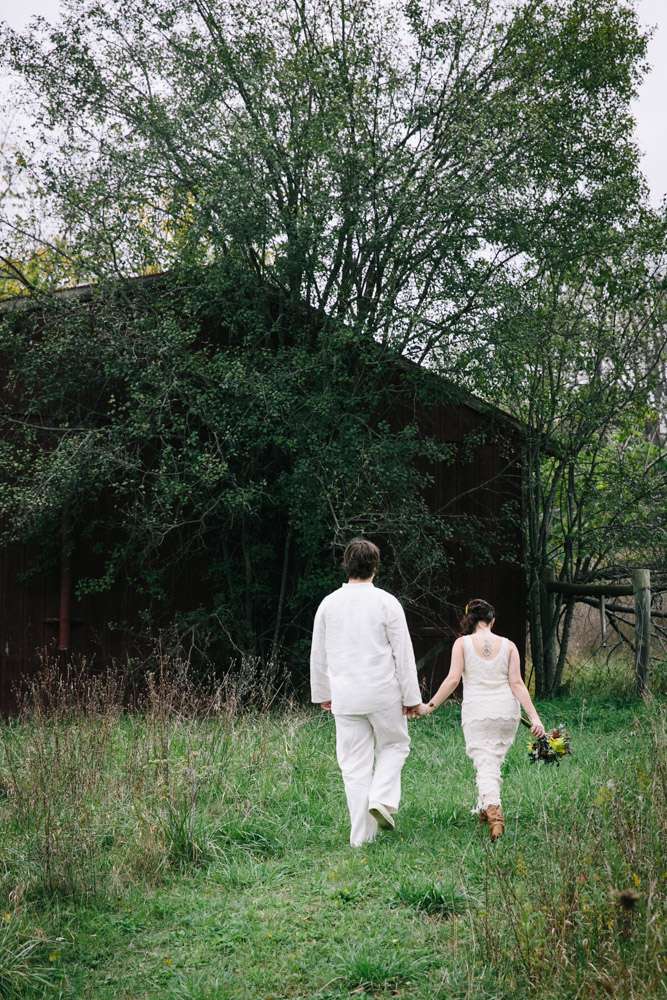 In fact pretty much the whole wedding was a DIY effort. The wedding party picked their own outfits, Katie’s grandmother made the cake and the couple designed their own stationery. They picked seasonal wildflowers for decoration and the bride’s bouquet and they scoured thrift stores and borrowed from friends for the rest of the décor items. “We begged friends for any and all mason jars”, Katie laughed. “Using some rusty wire from my grandfather we turned them into centerpieces with a beautiful rustic feel and wrapped vintage lace around them that I found at a thrift store. We also wrapped about 10 trees in white lights which made the whole backyard glow. Another thing we searched for were nice vintage wood frames. We took a ton of family pictures, some of Mike and I when we were little, some of us as we were awkward teenagers and others of us with our parents or siblings or nephews. Then we added a bunch of together that had been taken throughout the last couple of years. We hung them from twine and had them throughout the dinner tent on the walls and they looked great!”