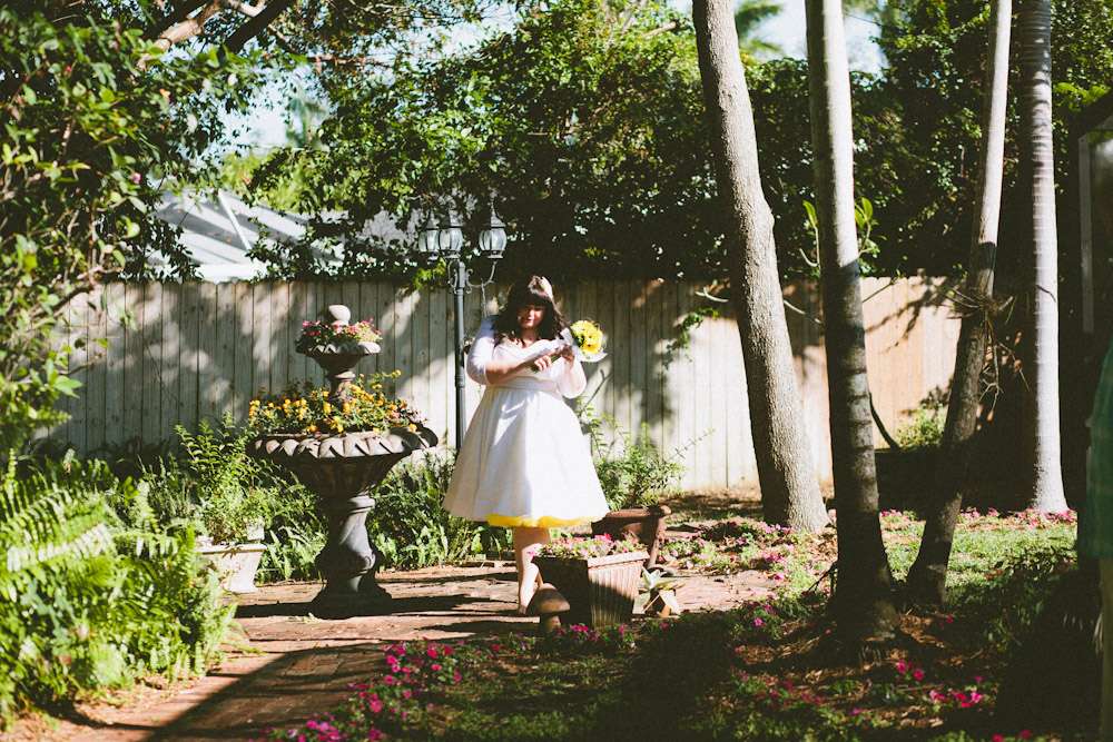 Nicole wore a short dress with a yellow petticoat which she bought from Miss Brache on etsy. She had bare feet and carried a homemade bouquet of yellow gerberas. “We really wanted to have the ceremony, decorations and every touch to be personalized”, she explained “We have never been a traditional couple and therefore weren’t excited about doing things just because it’s ‘what you’re supposed to do’. I had yellow touches and a yellow petticoat on my dress to give a nod to the yellow diamond engagement ring Tom gave me, we selected only music we both love and have had meaning to us. I went barefoot down the aisle as I hate shoes, we love vintage things and so all of the tablecloths and dishes were from the 50s. We wrote our ceremony and own vows and also picked personalized readings that reflected our personalities. We figured if we were doing this, it had to be about us and reflect what was important to us.”
