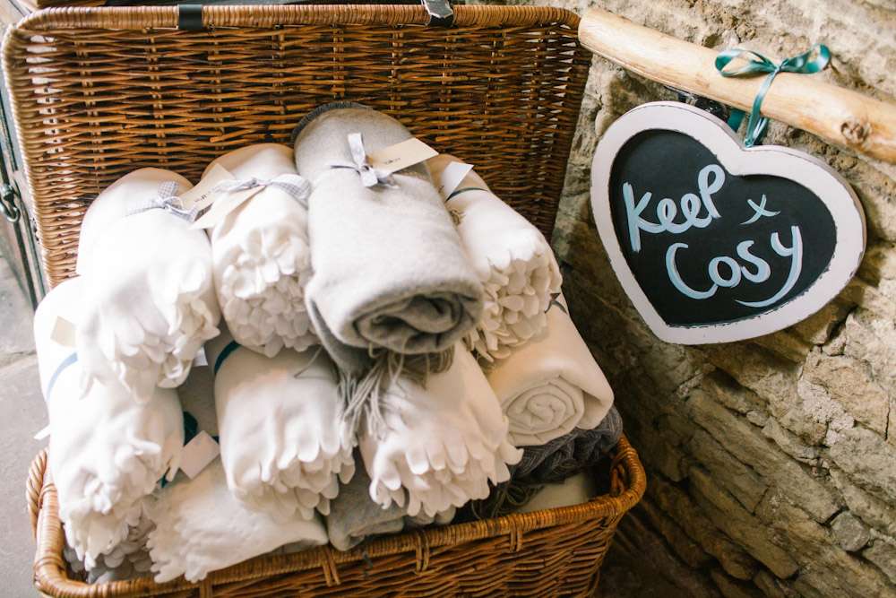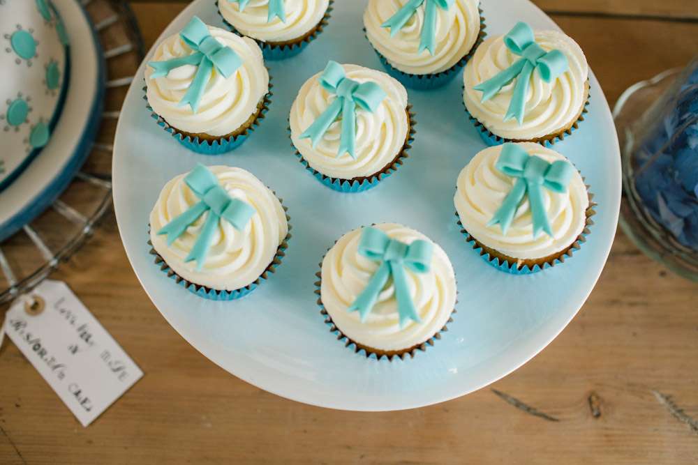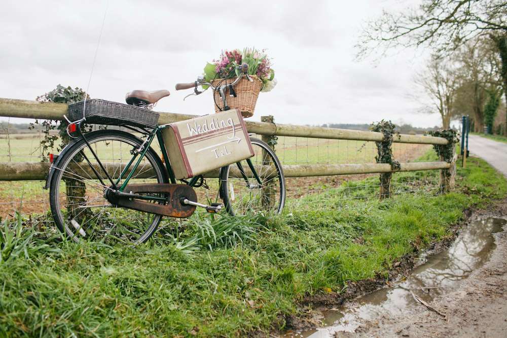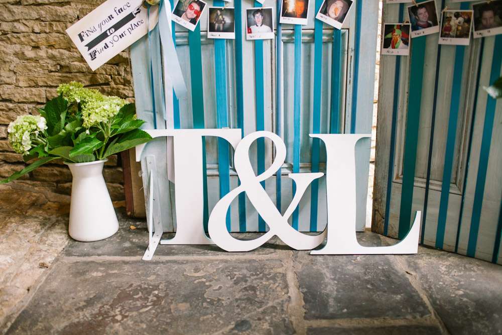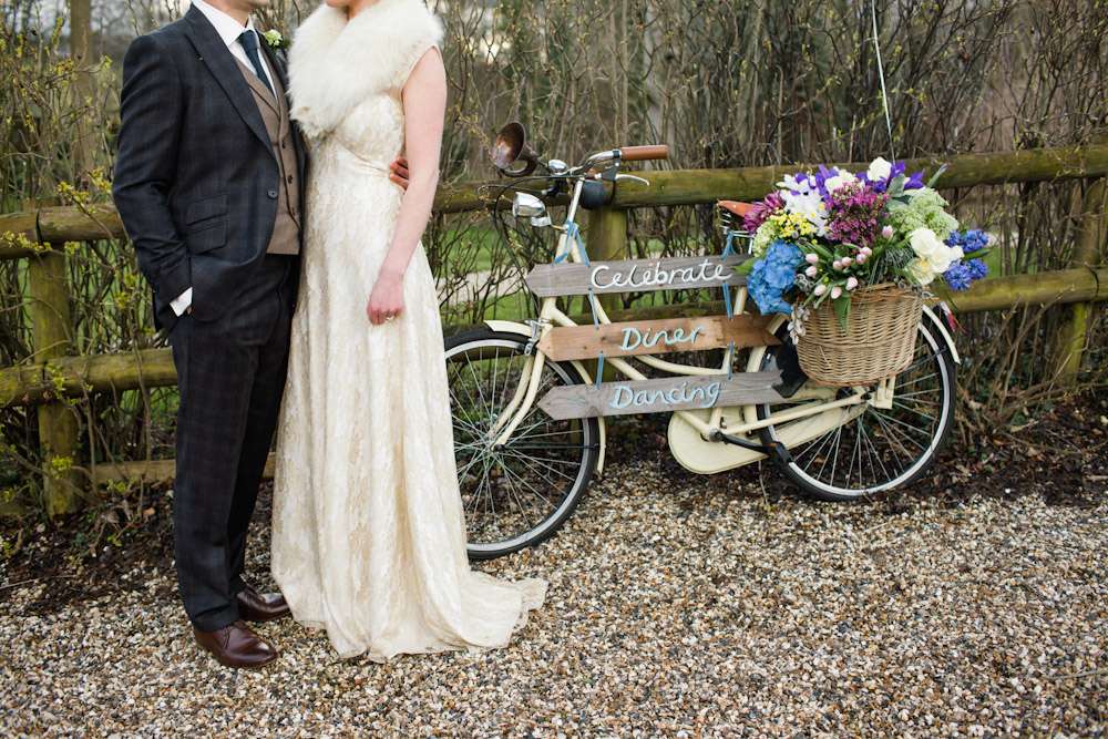 The wedding was held at Cripps Barn in Cirencester which they found after seeing it featured on Rock n Roll Bride. The couple decorated the large space themselves, with help from friends and family in the morning. “We collected books from charity shops and covered them in fabric for table numbers with tin hearts and gold leaf numbers on. We had loads of white tin jugs in various sizes from ikea for our flowers all in different sizes. Our seating plan was painted on two old doors which we covered in retro polaroids on blue ribbons. The big wicker trunk was borrowed from my mum and we filled with blankets for warmth in the evening as there was a bonfire. The vintage suitcases were hand painted with signs on to put cards in and we borrowed two bikes from friends to use as sign posts to the venue. We covered them in flowers and balloons and they looked great.”