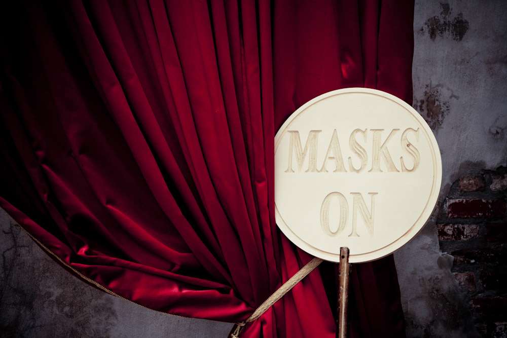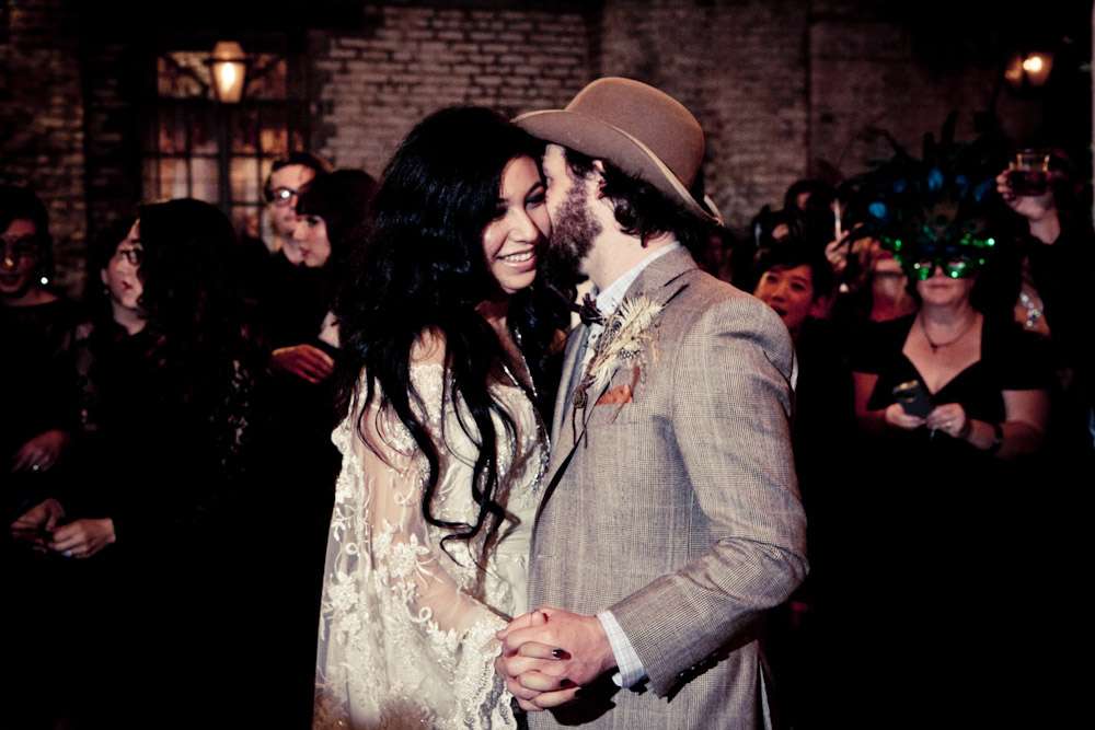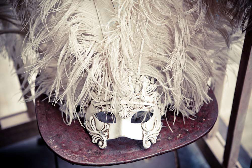 In terms of their outfits, the bride wanted something very different. Being a stylist and having worked with a lot of bridal publications she’d seen a lot of wedding dresses before – none of which were quite right for her. So instead she went for something vintage Inspired, opulent and unique. She chose some ivory beaded lace, some silk and some chiffon and got it custom made by Jiozei H Reyes. Her beaded purse was from the 1920s, her DIY bouquet made from tissue flowers, antique brooches, dried flowers and feathers. Her mask, which she bought, was customised with ostrich and albino peacock feathers. Collin wore a vintage suit and bowler hat. His mask was made from an antique viewer piece, which was customised with leather by Chad Landry who made the rest of mask with ostrich skin leather and straps.