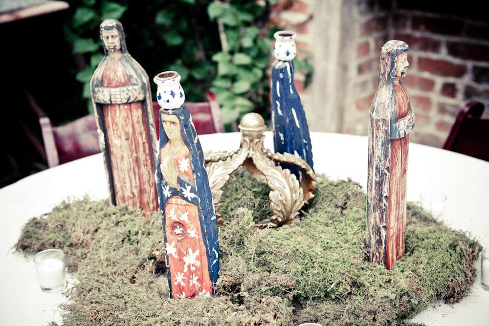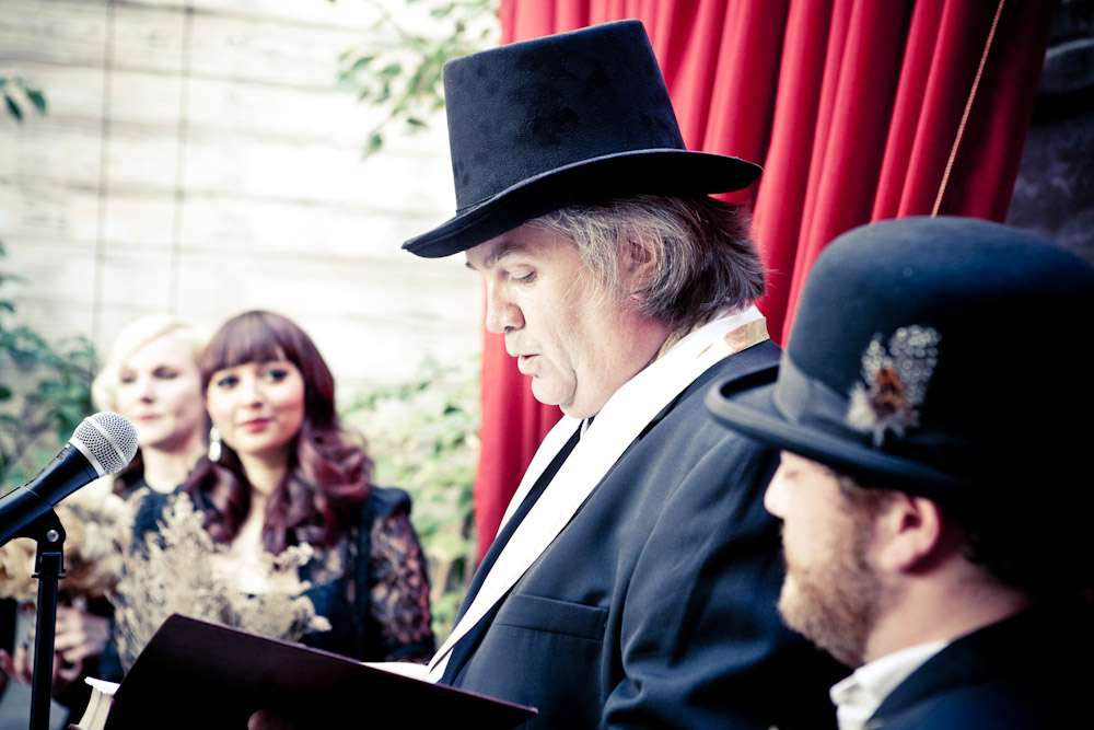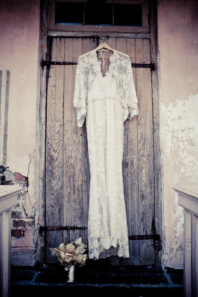 “For the décor we took antique and vintage pieces from our home, lots of candles, stripped wine bottles, and moss. My bridesmaid Tabitha Garcia, put it all together for us. We also had a lot of entertainment – mystery mimes, stilt walkers, a dog and clown act, fire performers and two bands. We had a photo booth and we set up a projector playing old Georges Mellies films that we love. It added great ambience an to the old film theme we had going. Our stationery was made by the amazing Royal Steamline.”