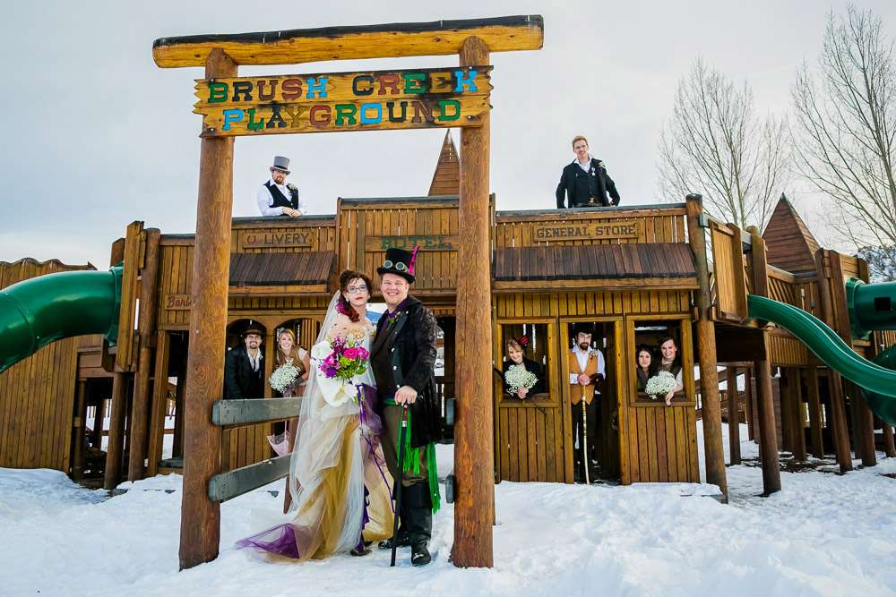 The wedding was held at Brush Creek Pavilion in Eagle, Colorado, and was planned by the mother of the bride, Jen, who runs her own wedding planning company, I Do Weddings. Jen did pretty much everything for this wedding, even so much as designing and making Meghann’s dress and headpiece herself! Nathan wore an outfit made up of things he already owned alongside a few items rented from a costume shop, and the bridesmaids and groomsmen were invited to wear anything they liked, as long as it fit them steampunk theme of course!