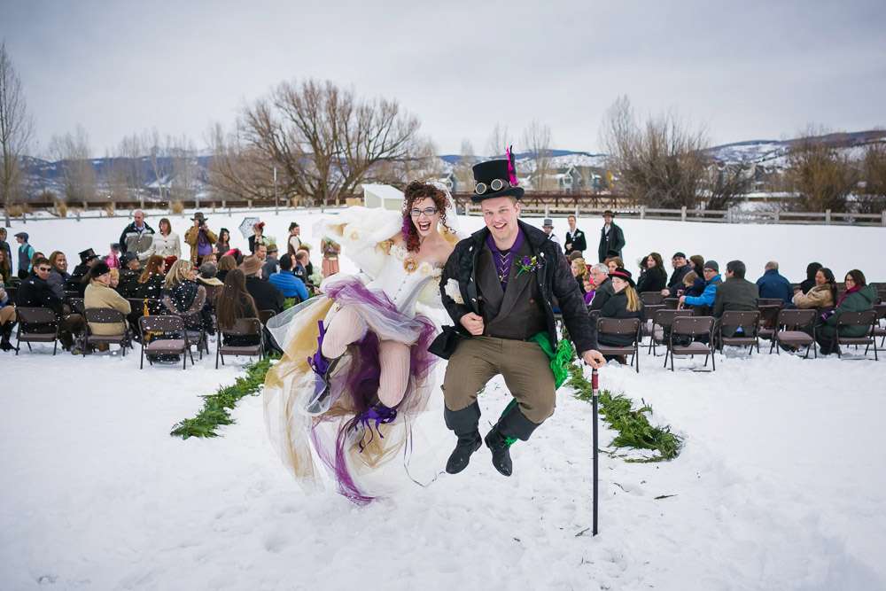 Spring has very much sprung over here in the UK. And as the daffodils start to line streets and parkways, I usually forgo featuring any obviously winter weddings. After all, who want to be reminded of the cold and bleak mid-winter when it’s so glorious outside?! Well Meghann & Nathan’s wedding was different. They were married in the Colorado Mountains, where snow is a pretty regular feature. They also had a steampunk theme and only spent $2000 on the day, making it a wedding that I just knew you guys would flip out about. So, yet again, my self-imposed rules are being broken today. Oh well!