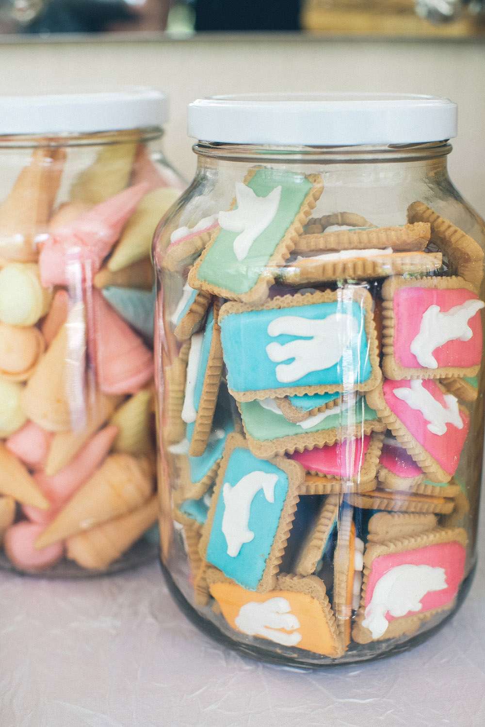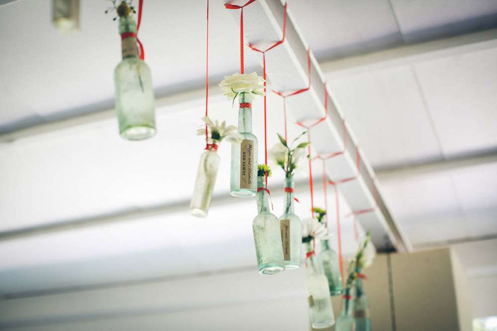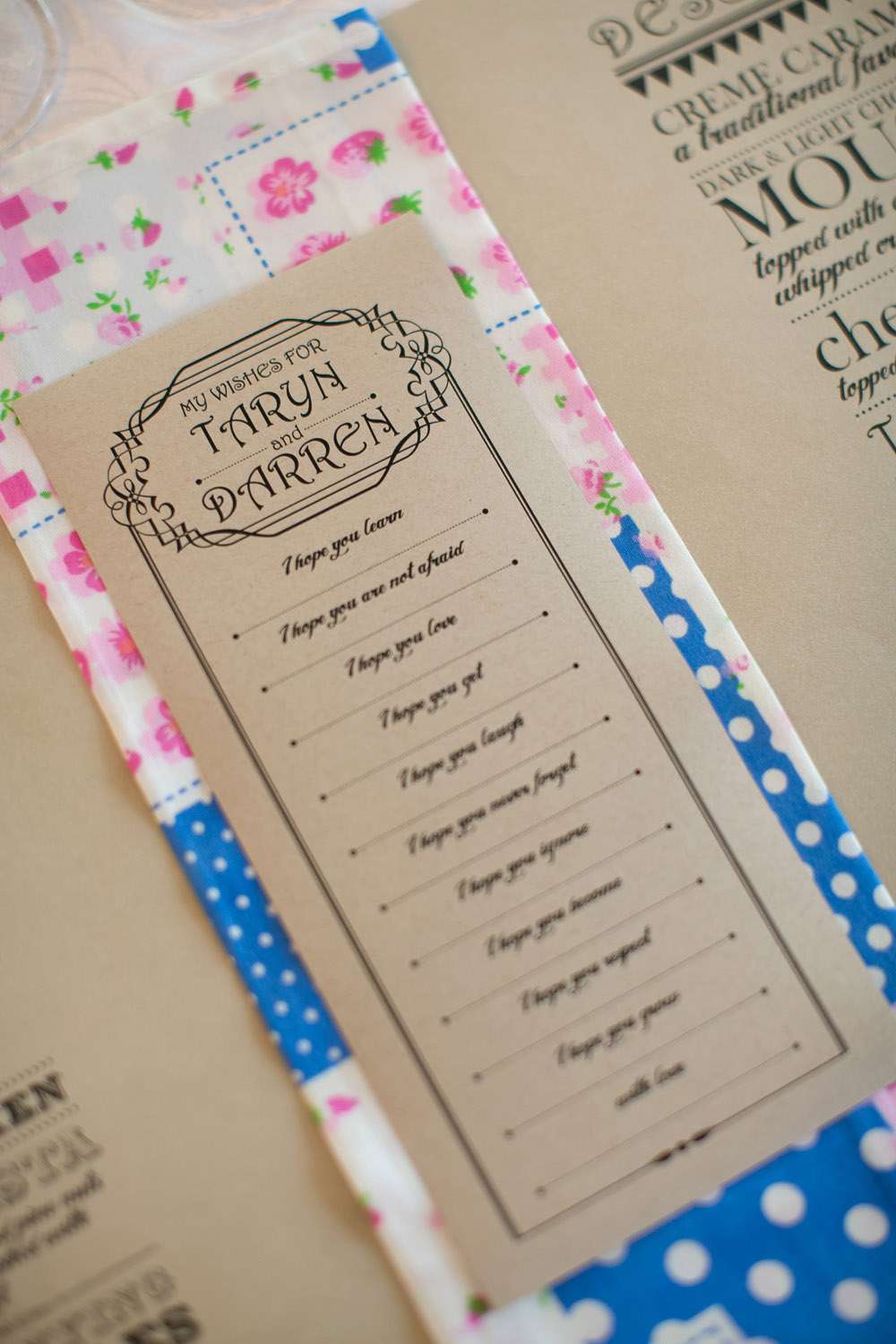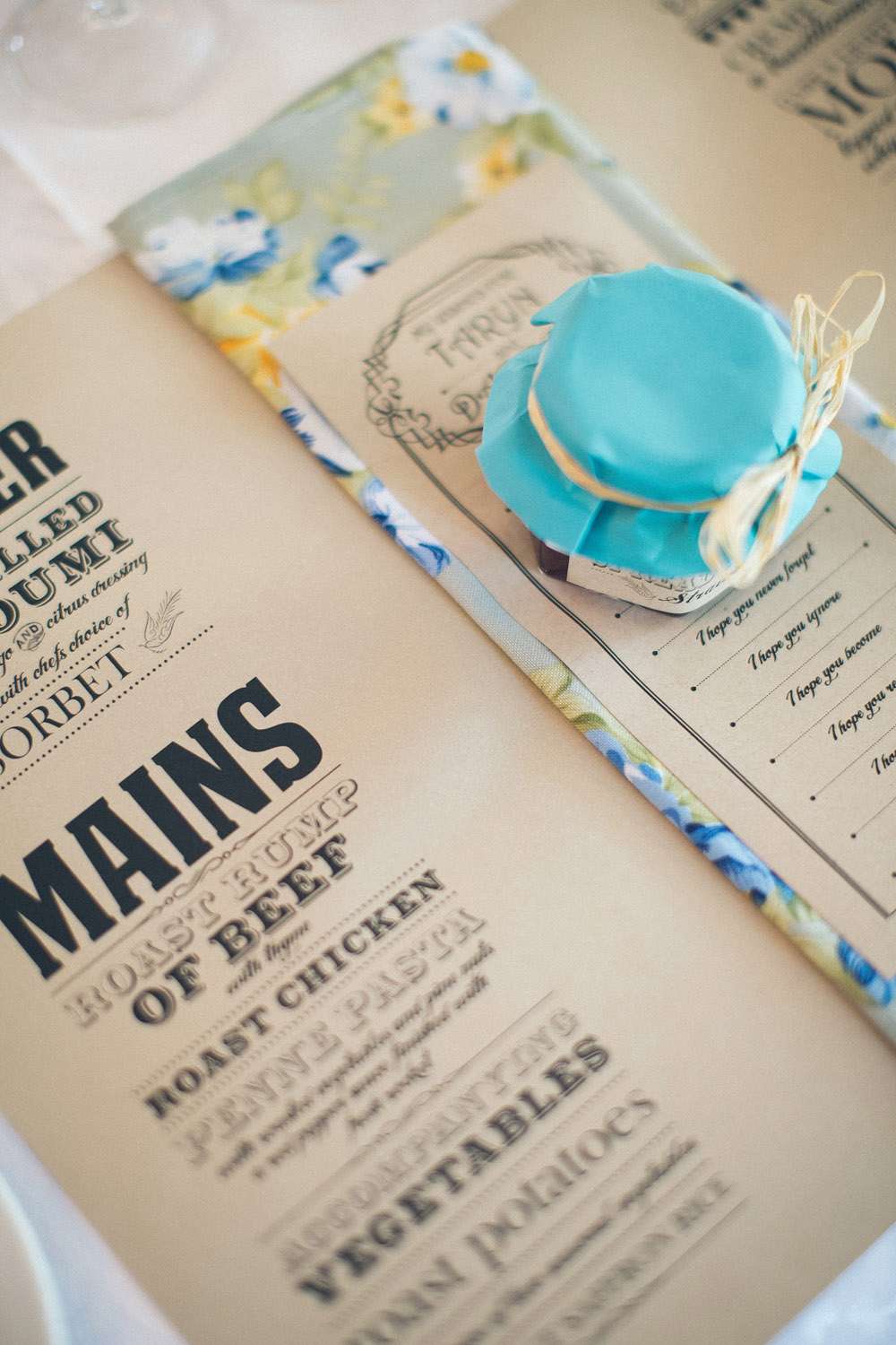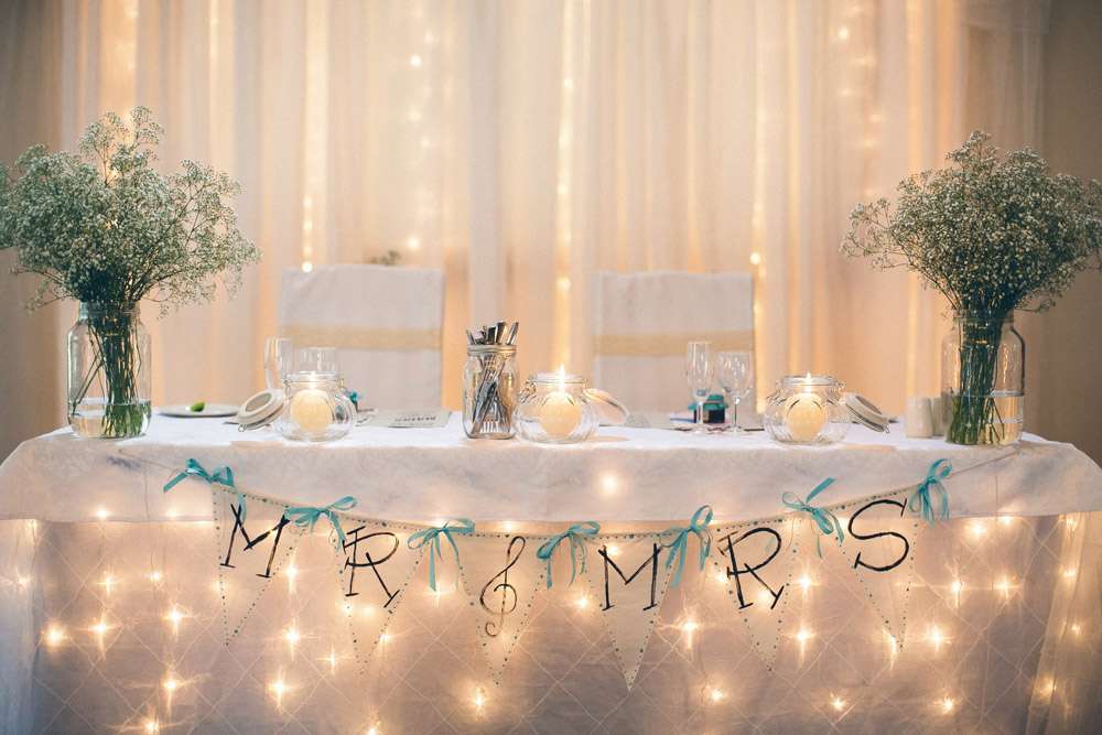 Being on such a tight budget the couple handmade everything they could for the reception. “The reception was exceptional in every way! We had made everything from the packing of the jam-jars one night (to the tunes of Bob Marley’s ‘we’re jamming…’) to the designing and labelling of the jars and bottles. We were so blessed with our florist who seemed to just get the concept of ‘old-fashioned, but not vintage, pretty but not feminine, traditional, but not staid’. Our main table was strikingly simple and I loved the ‘Mr & Mrs’ bunting.”