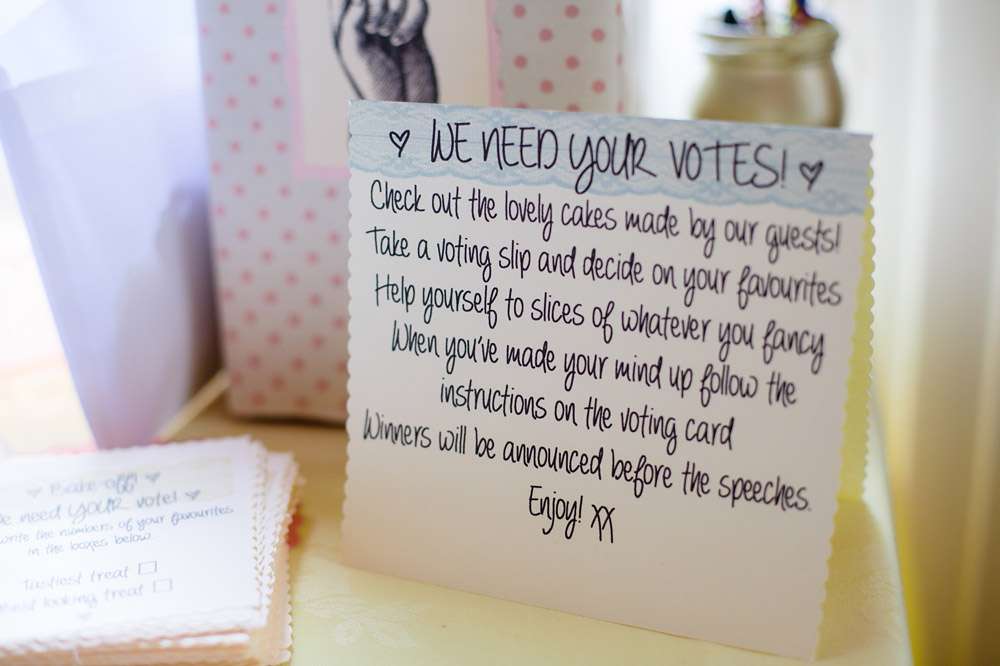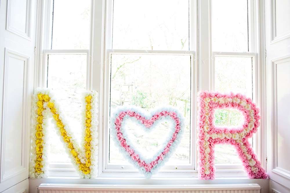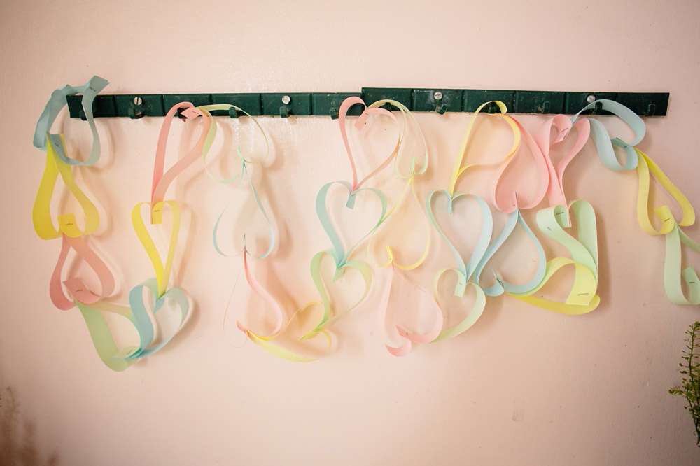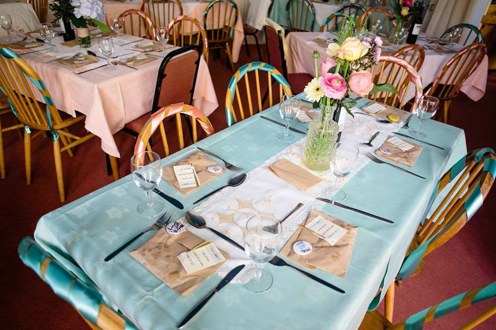 The room where they had the sit down meal and speeches was decorated from top to toe by the bride. From the pastel bunting and heart paper chains the bedazzled some wooden spoons! The incredible ‘You’re so Cool’ and True Love’ flower letters that hung on the wall were from In Her Glory. “I LOVE making things and took a few wonderful weeks off work to spend on the DIY projects”, she explained. “My favourite things to make were the bedazzled wooden spoons for the cake contest trophies – I wanted to cover everything I owned in gemstones after I made those, and was very reluctant to give them away! I genuinely thought I was a creative genius when I used paper doilies as a stencil to spray a gold border onto a chalkboard!”