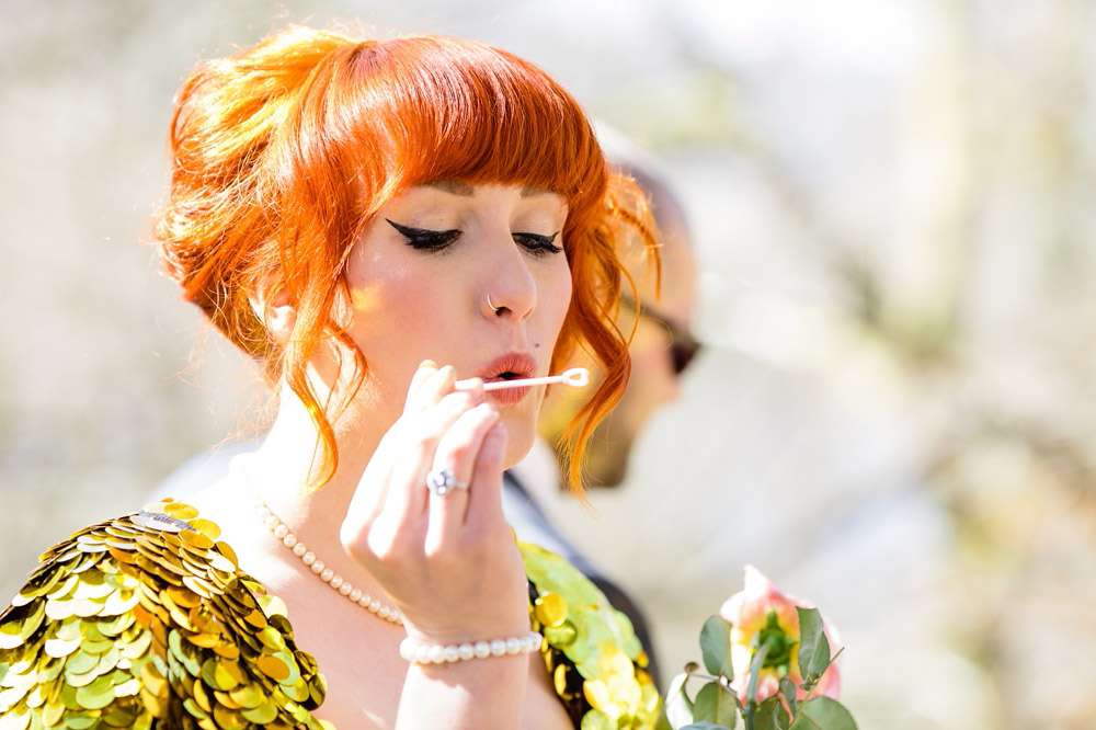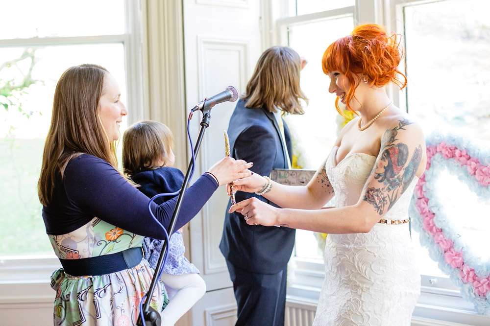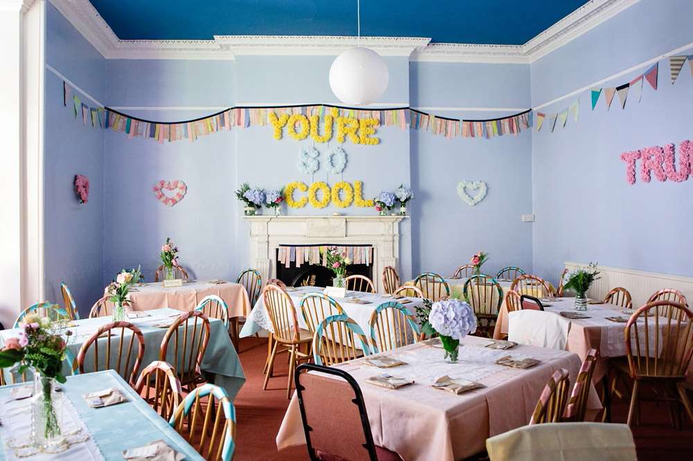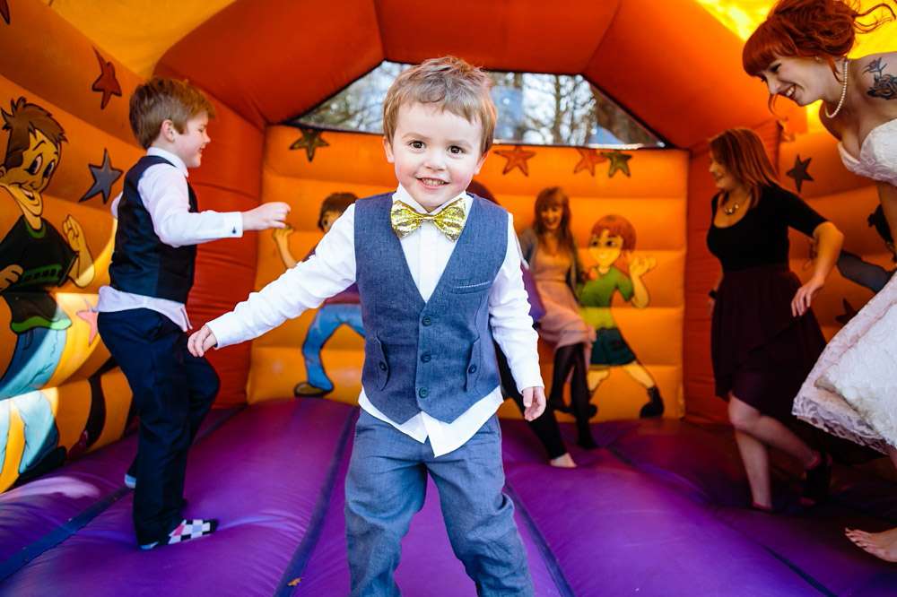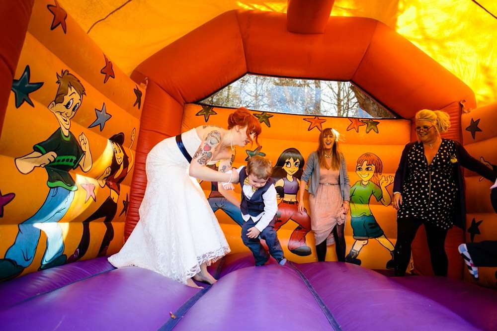“Our main aim was to make it a fun and chilled out day for our guests, with less of the usual formality”, she continued. “Not having the restrictions of the legal ceremony (we had a quickie registry office do with just witnesses the day before) meant that we could pretty much do whatever we wanted, so that’s exactly what we did! We started with a tea party and cake contest so that we could spend some time with our guests before the ceremony, and we were dead set on getting married outside with one of our friends doing the honours. The waterfall in the grounds of the hostel was just a lucky find! We didn’t want any of our guests to feel forced into doing things they don’t enjoy, or to be bored, so we used all of the rooms available in the hostel to create little areas for people to chill out and chat, play games, as well as the usual drinking and dancing. We threw in a bouncy castle for good measure because who doesn’t love a bouncy castle?”