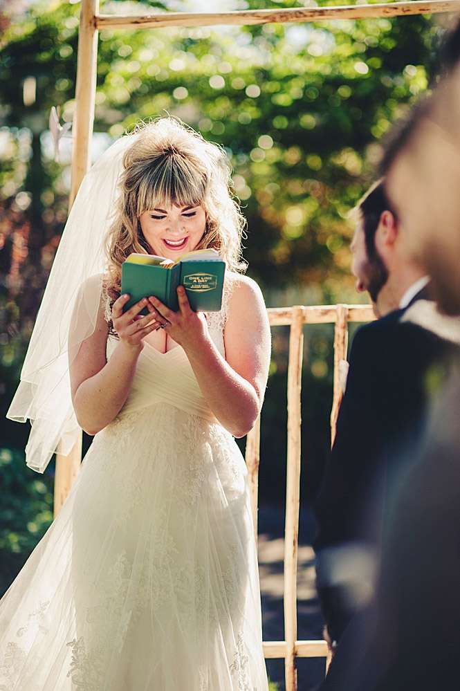 Max and Sarah were married at Rocher Harbor Resort, Washington. The wedding was timelessly elegant with rustic touches but with a dash of punk rock awesomeness thrown in! “Our wedding was a true labor of love,” began the bride. “From the handmade terrariums topping our tables, ceremony arbor, and DIY’d program goodie bags – every step of our wedding was a group effort. It would not have been the gorgeous and action-packed hootenanny it was without the efforts of our dearest friends and treasured family members.”