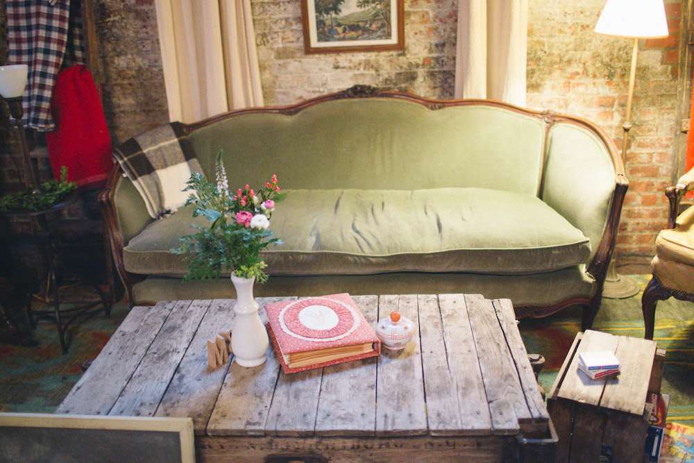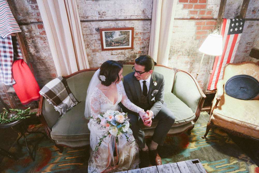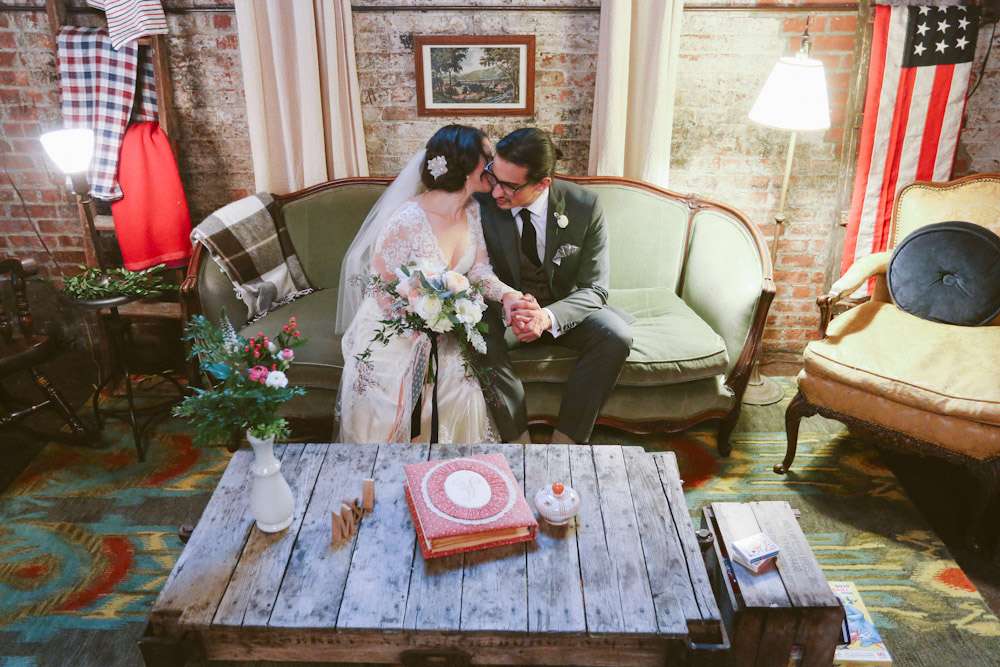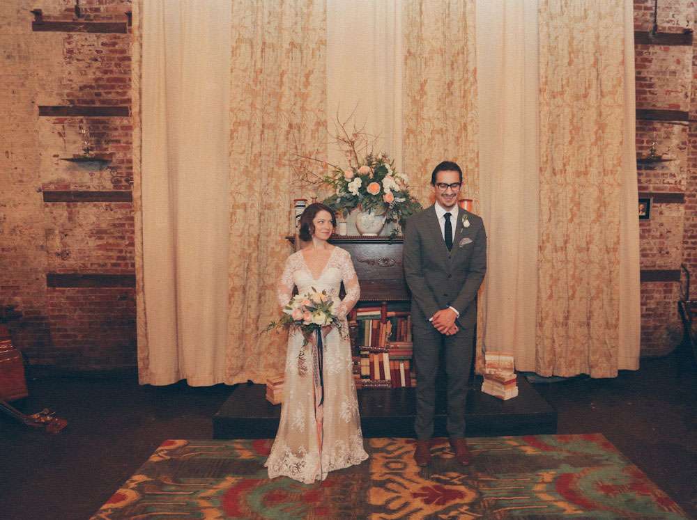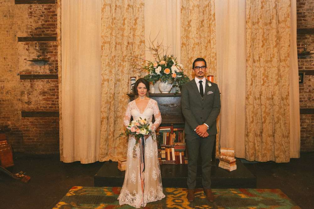 “When planning the wedding I became charmed by the idea of parlour weddings, the way folks used to do it before the Big Business of weddings”, Alison explained. “So we wanted to create the look and feel of a living room for ours. We wanted to take items from each of our apartments and create a cozy and personal space where we could gather our nearest and dearest to watch us make this amazing commitment.”