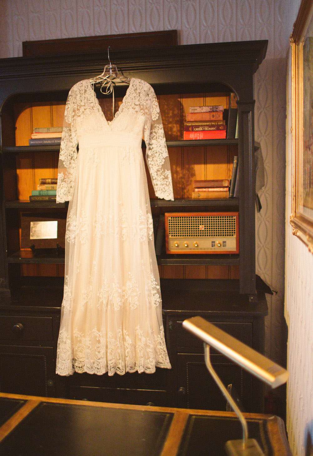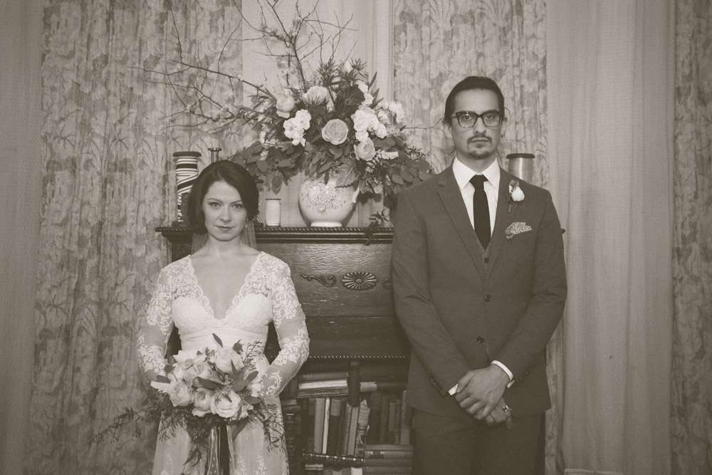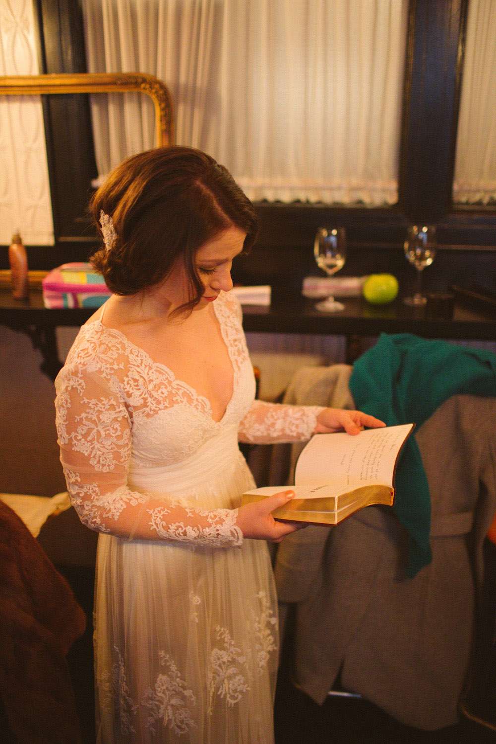 “When planning the wedding I became charmed by the idea of parlour weddings, the way folks used to do it before the Big Business of weddings”, Alison explained. “So we wanted to create the look and feel of a living room for ours. We wanted to take items from each of our apartments and create a cozy and personal space where we could gather our nearest and dearest to watch us make this amazing commitment.”