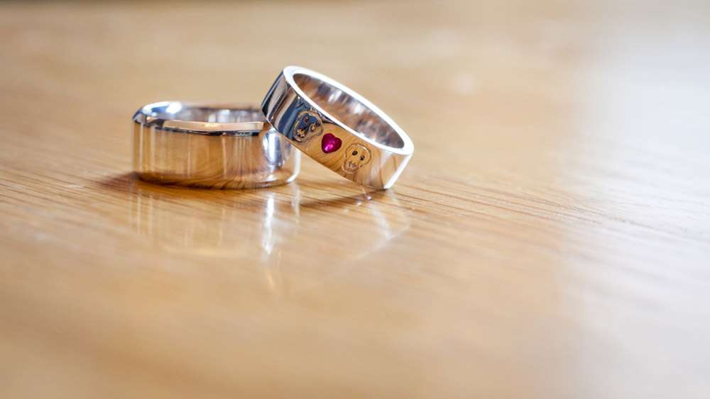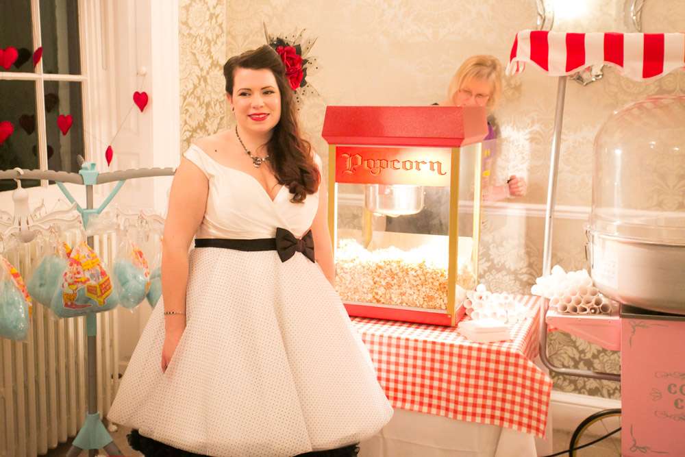 “I decided from the beginning that I wanted to source as much of our wedding stuff from small businesses and crafts people”, Natalie began. “My short, 50s style polkadot wedding dress was made by one of my fabulous bridesmaids who is a skilled costumer and bespoke dressmaker. We had so much fun coming up with the design together and I knew that she would do me proud, I absolutely loved it! Our wedding rings were made by Rockcakes, a wonderfully quirky jewellery company based in Brighton. Again, we came up with the design together by emailing ideas back and forth until we decided on a simple band with a ruby heart and two little skulls engraved either side with tiny black diamond eyes – it’s so cute!”