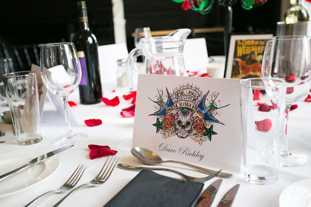 “We commissioned a local design company Shorties Designs to create some bespoke tattoo inspired artwork for us. They produced the awesome name cards for the tables and a table plan with horror movie illustrations to indicate the table names. The knock out was our order of service poster, designed like a traditional B-movie poster with Paul as Frankenstein and me as the damsel in distress. One of my favourite elements was our custom zombie cake topper by sculptor Philip Hynes, who we found on Facebook. This was a big talking point among our guests, they couldn’t believe the likeness to us. Paul is even holding a tiny bottle of Jack Daniels!”